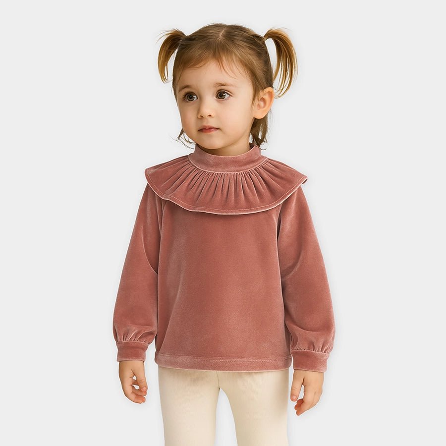 Solid-coloured t-shirt for girls in soft knit velvet fabric with a blend of 90% polyester and 10% spandex for the winter season. Features raglan full sleeves, ruffled collar, and a snap button placket at the back. Available in different sizes for kids 12M-6Y.