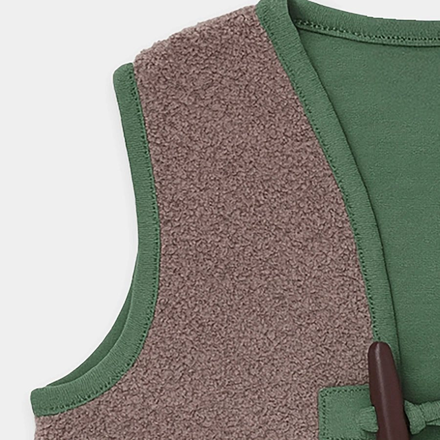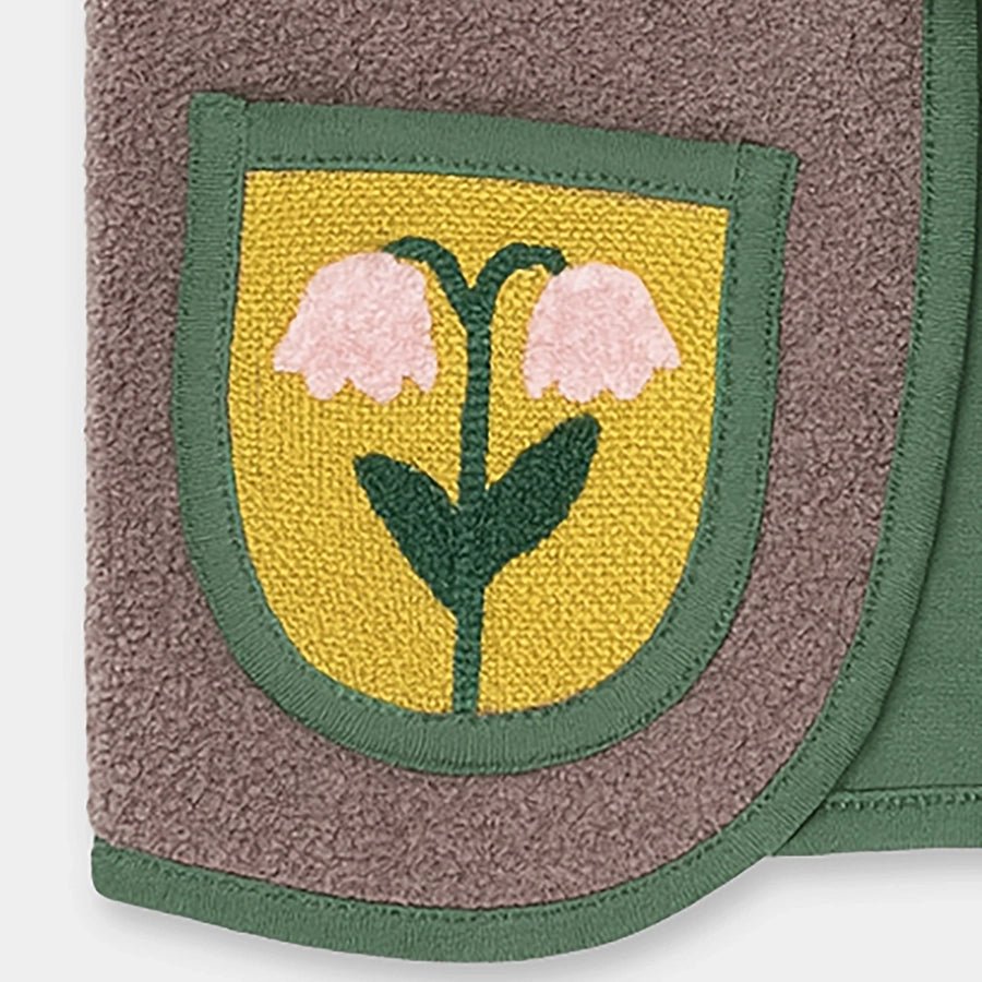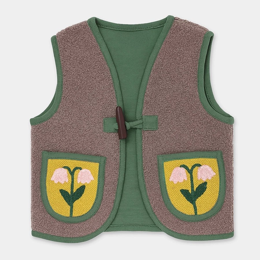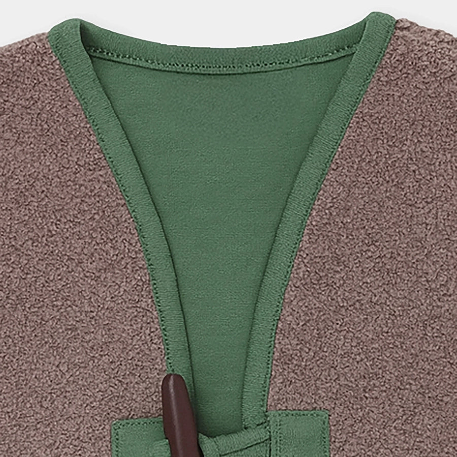 Shrug for girls in soft knit 100% polyester for the winter season. Features loops with a wooden button accessory, and two patch pockets with embroidered designs. Available in different sizes for kids 6M-6Y.