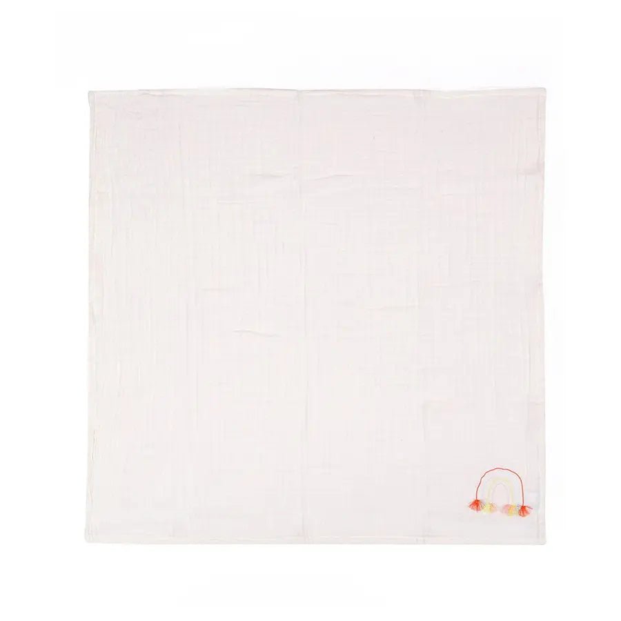 Solid-colored baby wrap in soft muslin fabric with a blend of 100% cotton and a small embroidered design at the corner. Size: 100x100 cm