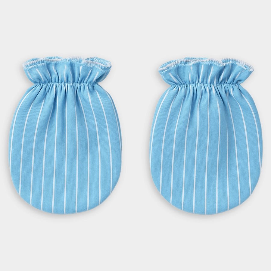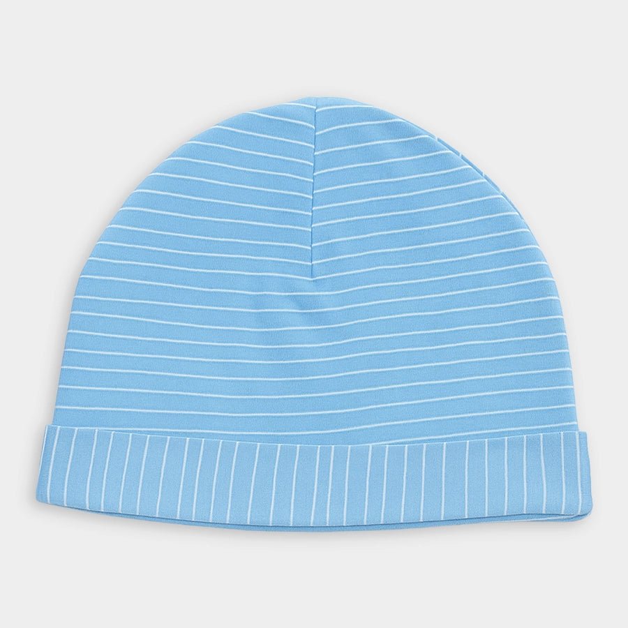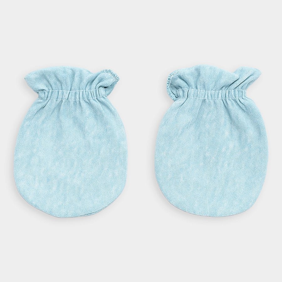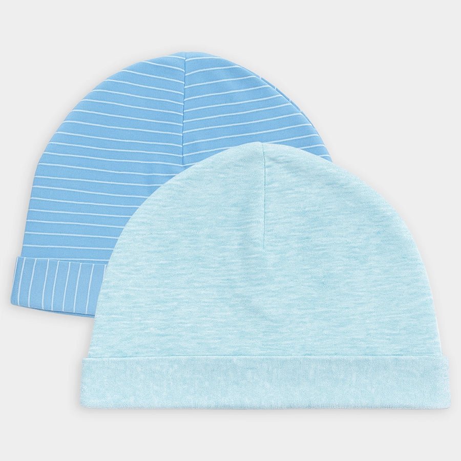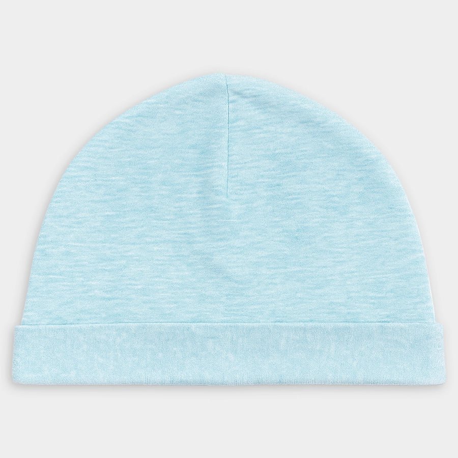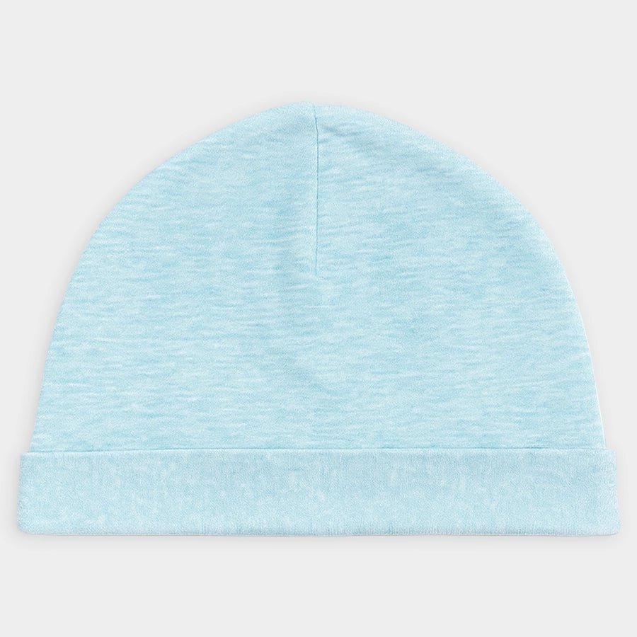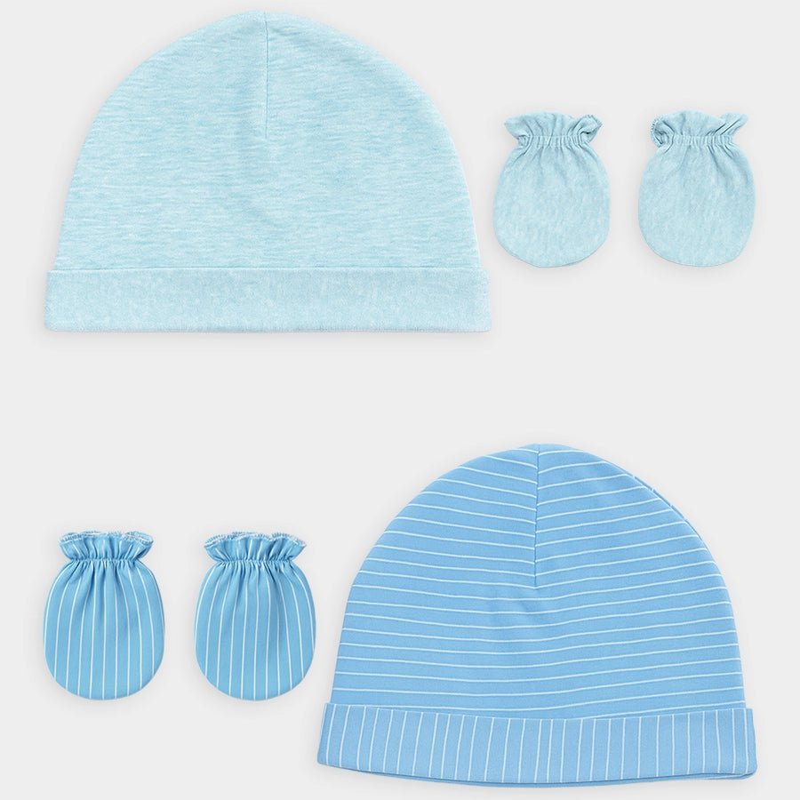 Unisex cap and mittens set (pack of 4) in soft knit 100% cotton for all-weather use. Includes 1 printed and 1 solid-coloured baby cap with a foldover edge, matching mittens set with elasticated openings. Best suitable for kids 0-6M.