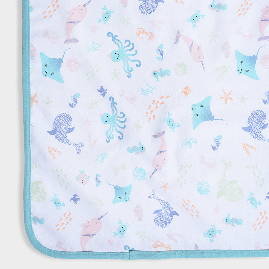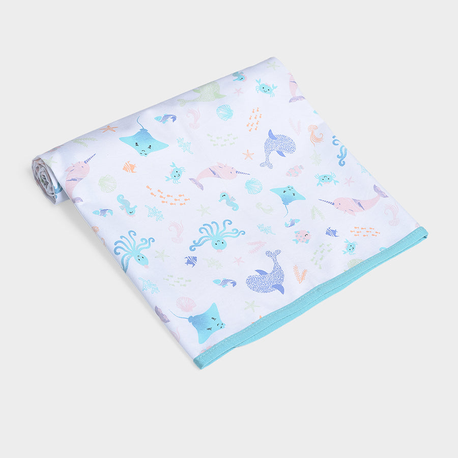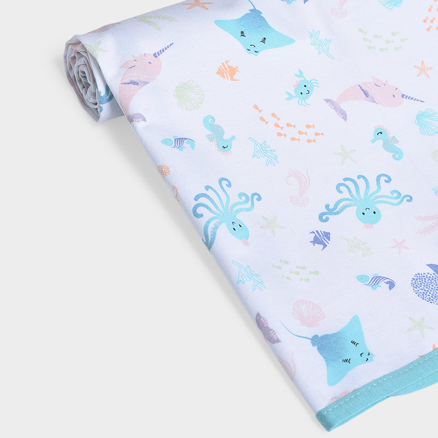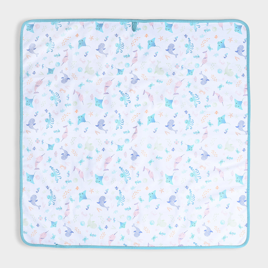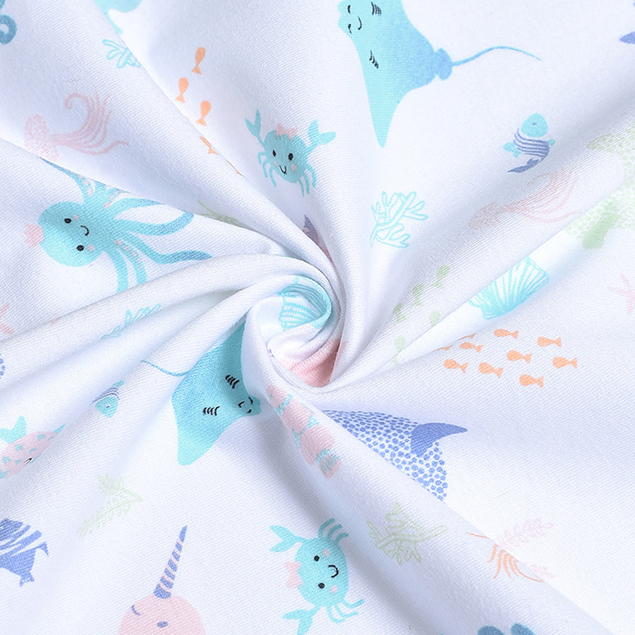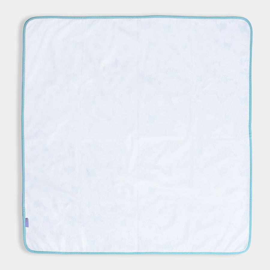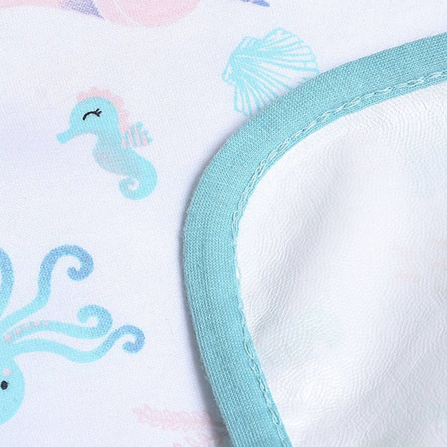 Breathable, lightweight, printed mattress protector in soft 100% cotton with TPU Lamination to protect the baby mattress from getting wet while keeping it clean and hygienic. Best for kids 0-24M. Size: 90x85 cm