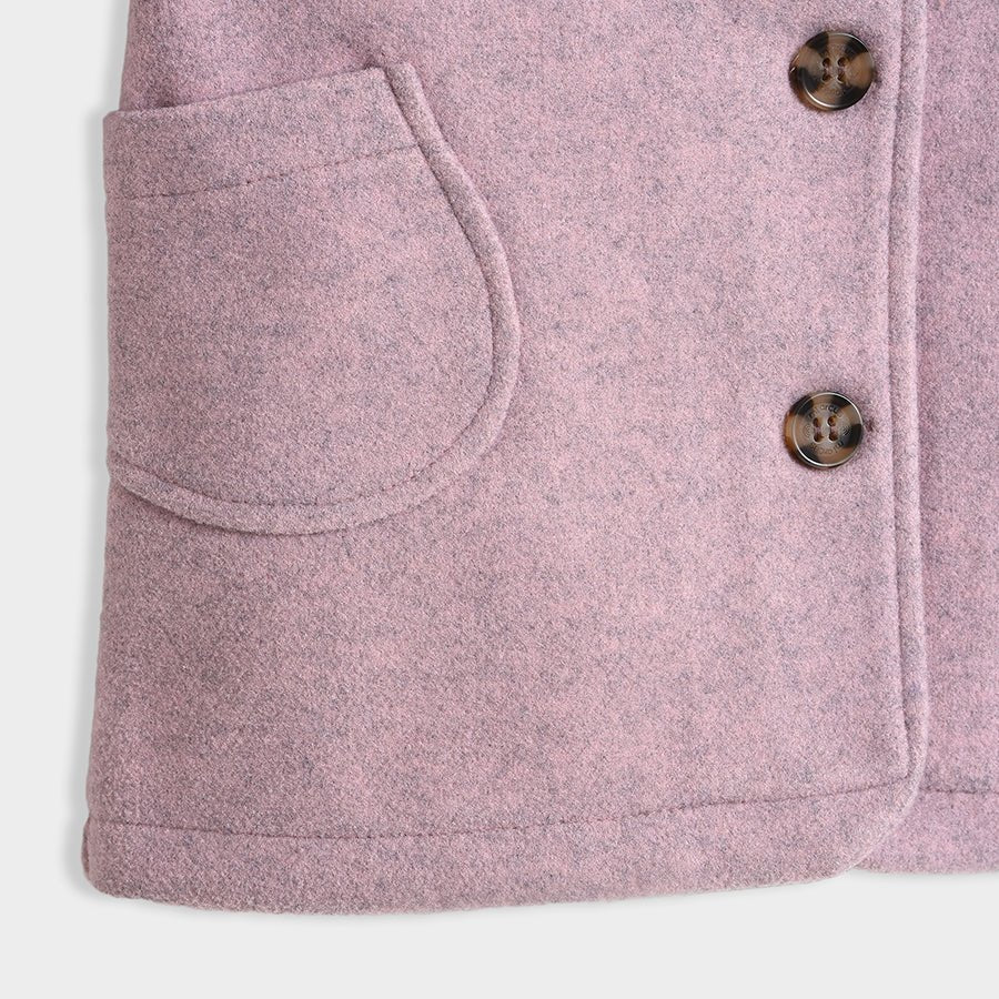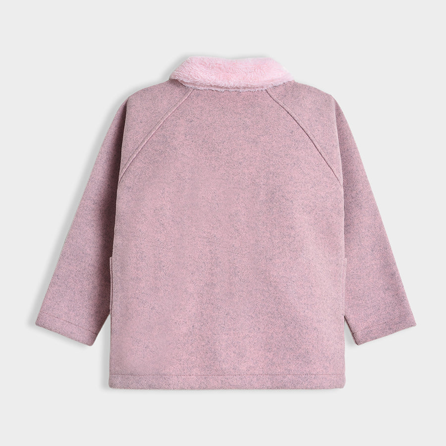 Coat for girls in soft knit 90% polyester and 10% rayon blend for the winter season. Features full sleeves, front-open buttons, collared neckline, and patch pockets at the sides. Available in different sizes for kids 12M-6Y.