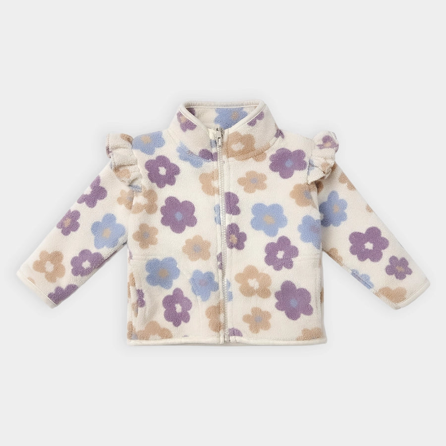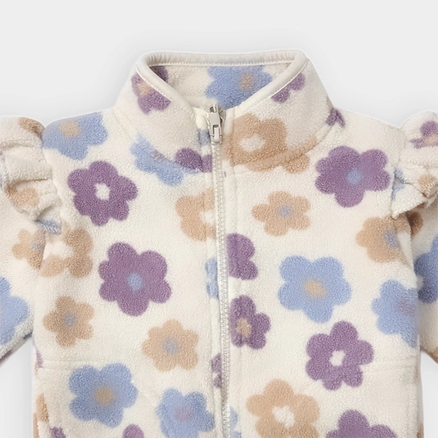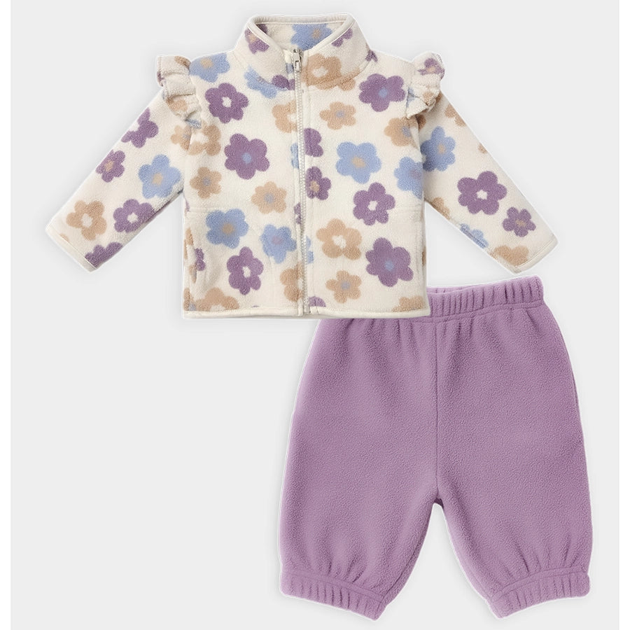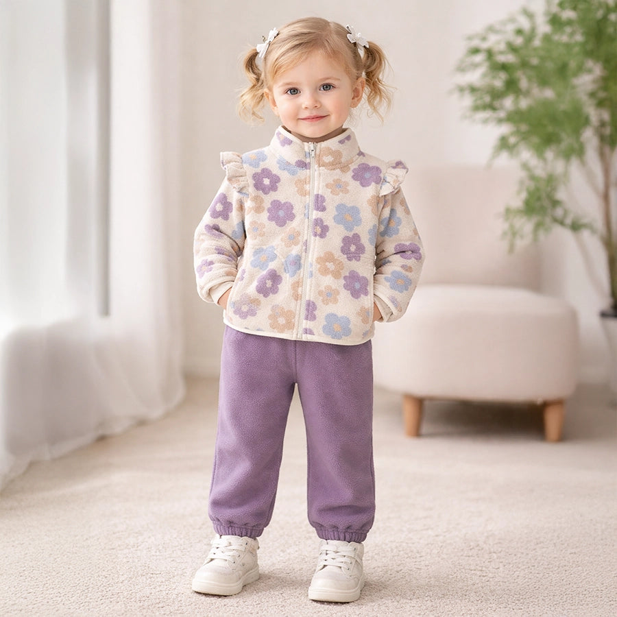 Jacket and pyjama set for girls in soft knit 100% polyester for the winter season. Features jacket with full sleeves, zip-open front, 2 side pockets, frilled detailing at the shoulder, mandarin collar, and all-over floral prints. Solid-coloured pyjamas with a concealed elasticised waistband, elasticised leg opening, and 2 side pockets. Available in different sizes for kids 0-6Y.