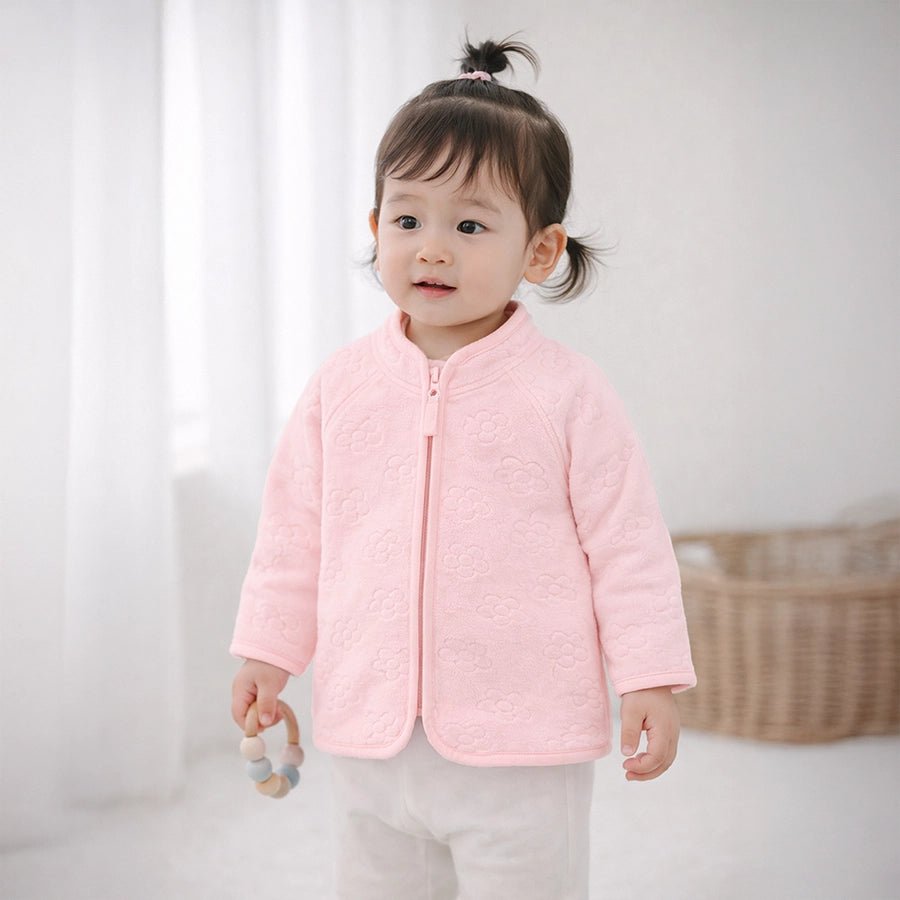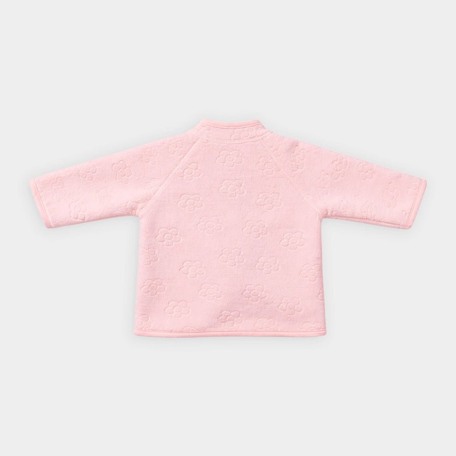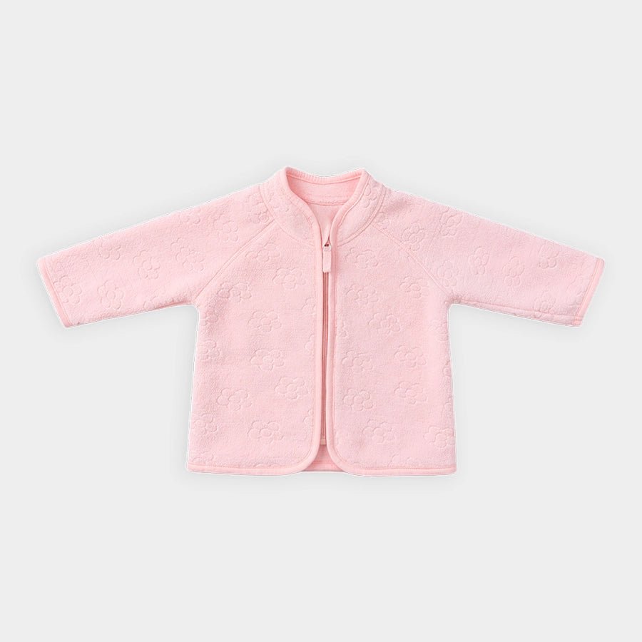 Jacket for girls in soft knit 100% polyester for the winter season. Features raglan-style full sleeves, mandarin collar, floral embossing, and zip opening at the front. Available in different sizes for kids 12M-6Y.
