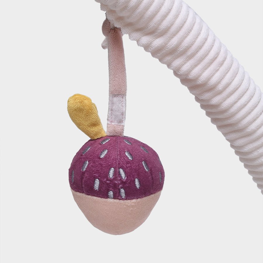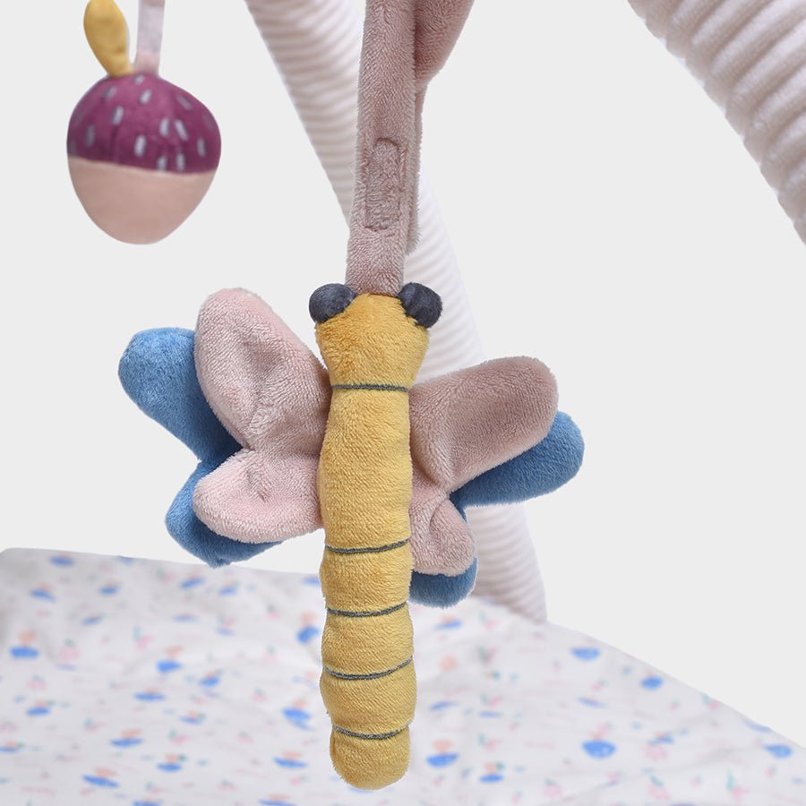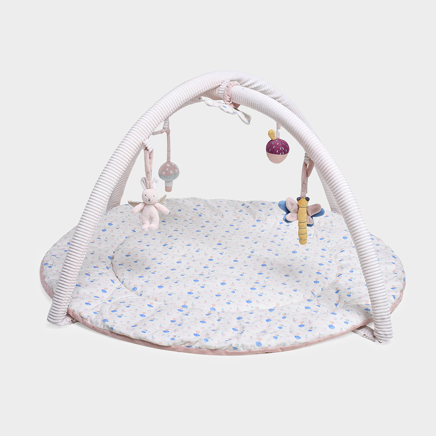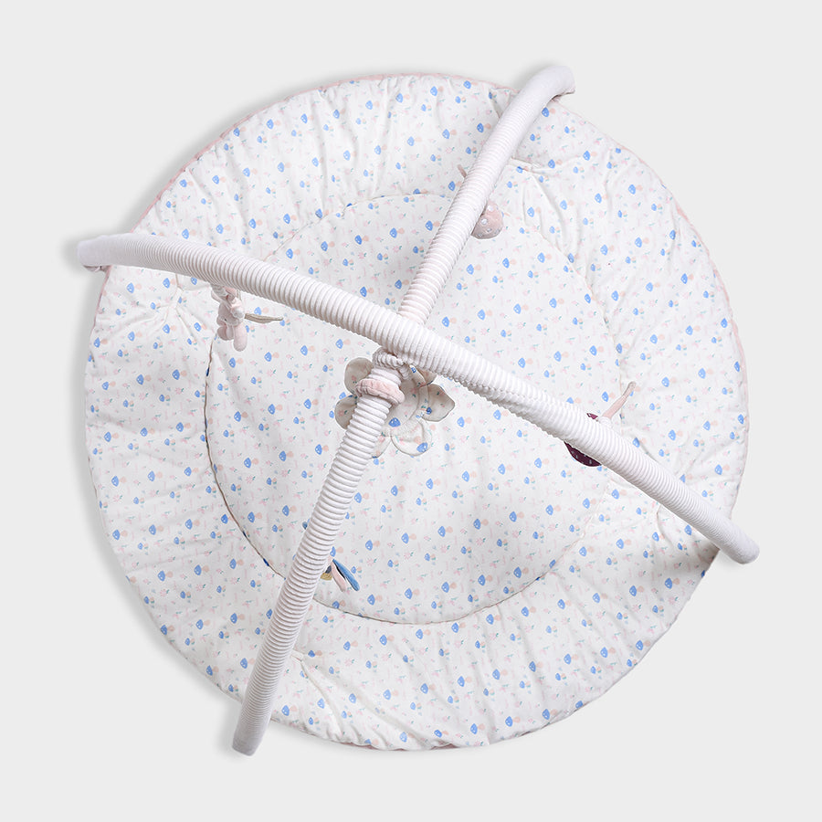 Play gym for babies in soft 100% polyester and filling. Features a cushioned, printed surface for safe tummy time and playtime, detachable corduroy tubes with buckles, and hanging, removable toys with crinkle and bell sounds for visual, tactile, and auditory exploration. Size: 90x90 cm