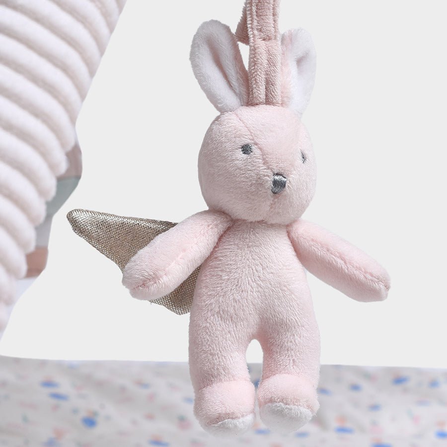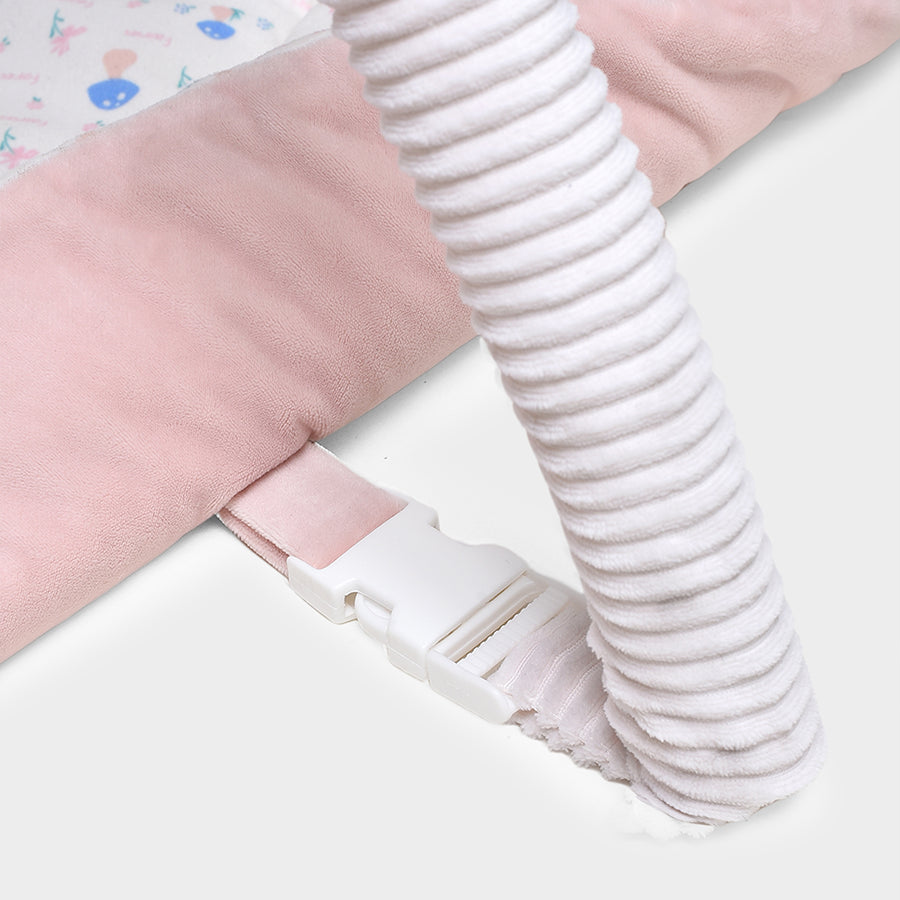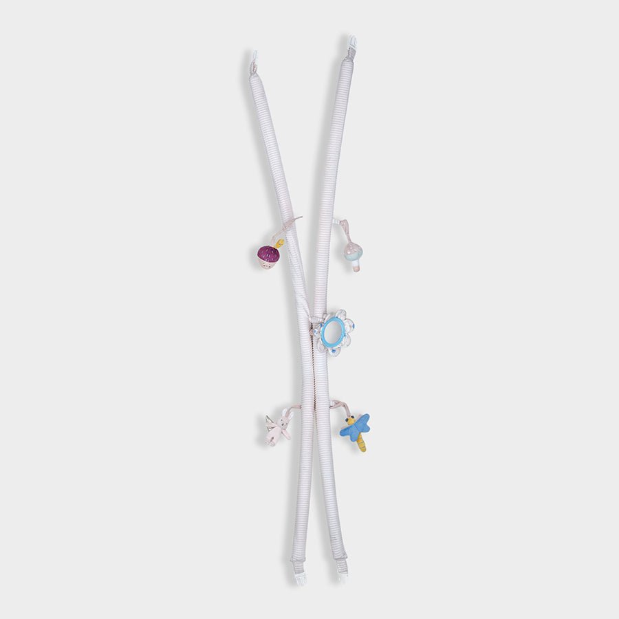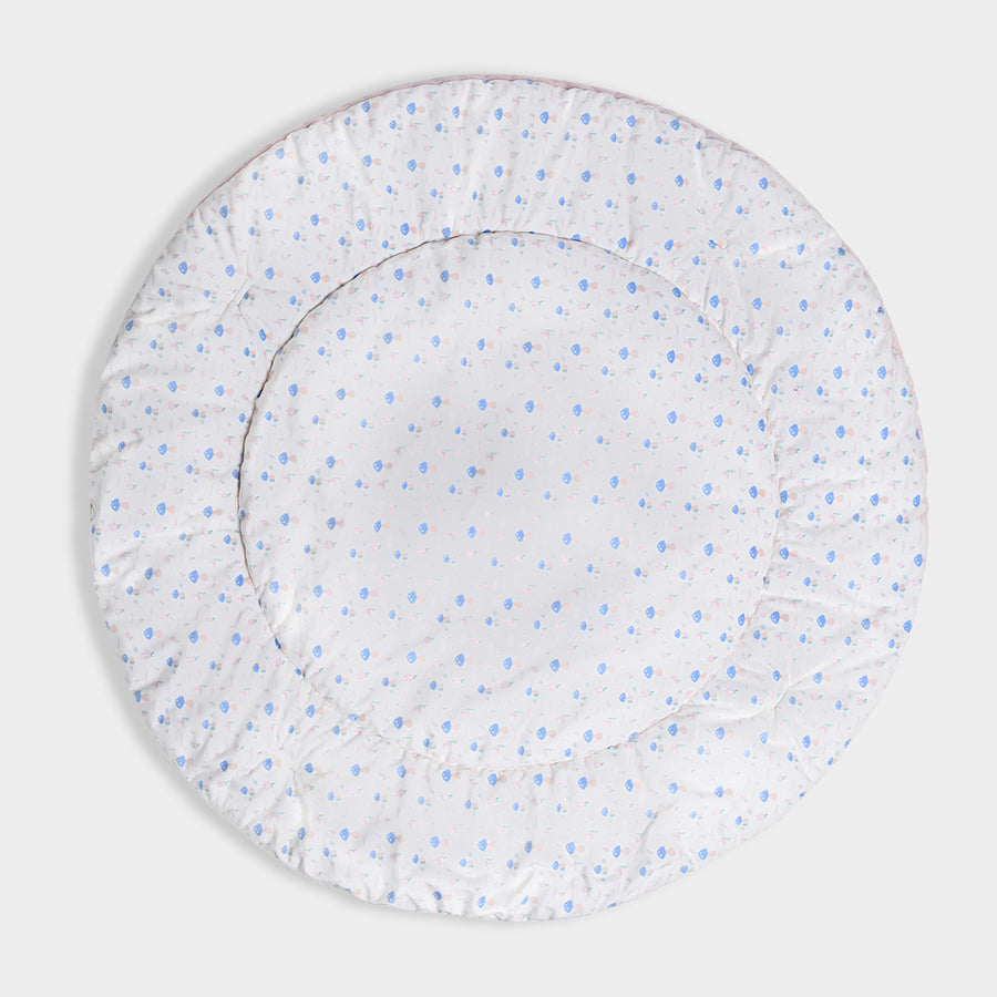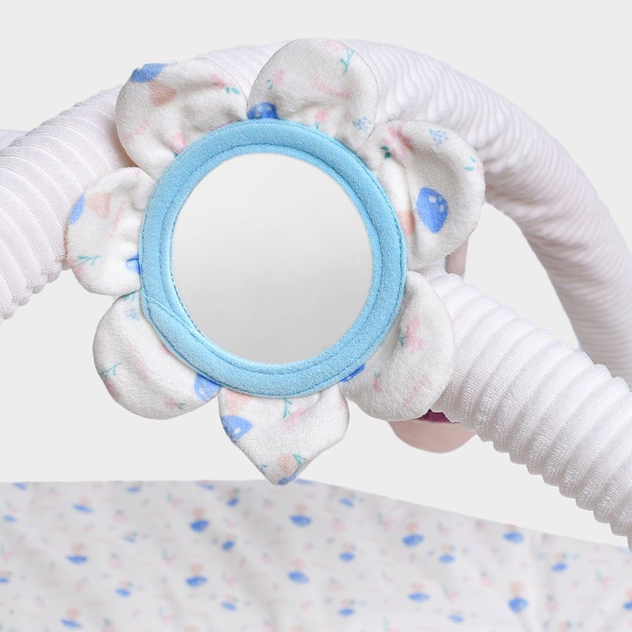 Play gym for babies in soft 100% polyester and filling. Features a cushioned, printed surface for safe tummy time and playtime, detachable corduroy tubes with buckles, and hanging, removable toys with crinkle and bell sounds for visual, tactile, and auditory exploration. Size: 90x90 cm