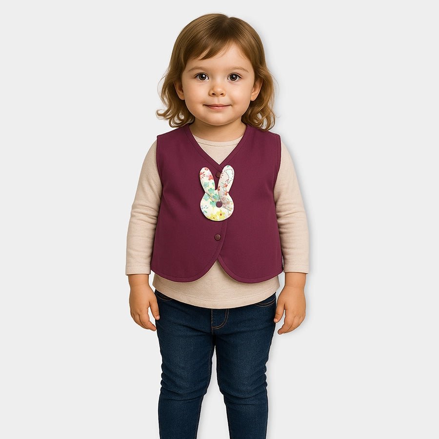 Sleeveless jacket for girls woven in soft 100% polyester for the winter season. Features an all-over solid colour, V-neckline, patchwork design, and front-open snap buttons. Available in different sizes for kids 6M-6Y.