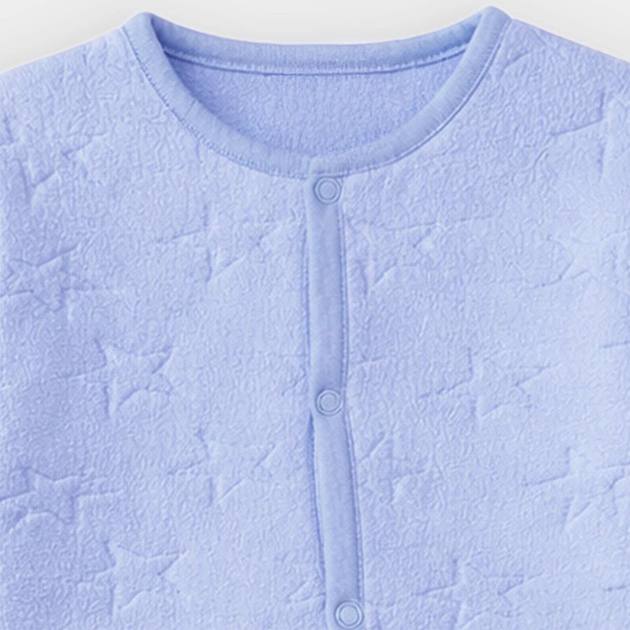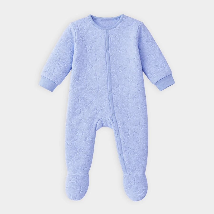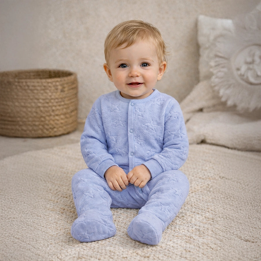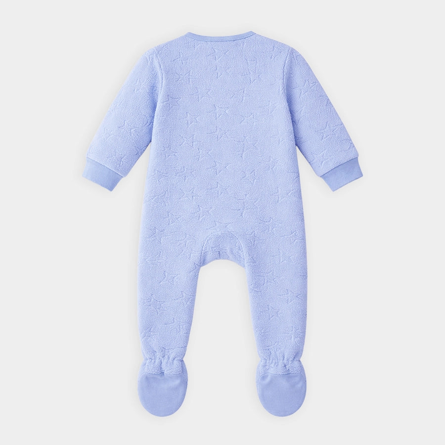 Sleepsuit for boys in soft knit 100% polyester for the winter season. Features full sleeves with ribbed cuffs, snap button opening down the front and one leg, attached booties, and star-theme embossing. Available in different sizes for kids 0-12M.