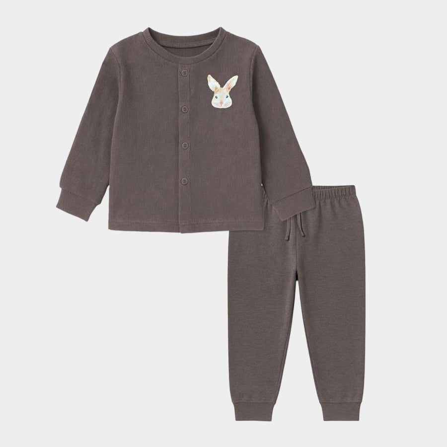 Unisex thermal set in soft knit 90% polyester and 10% spandex blend for the winter season. Features a full-sleeve, solid-coloured top with snap-button opening at the front and a small mouse-theme chest print. Matching solid-coloured pyjamas with a concealed elasticised waistband. Available in different sizes for kids 0-12M.