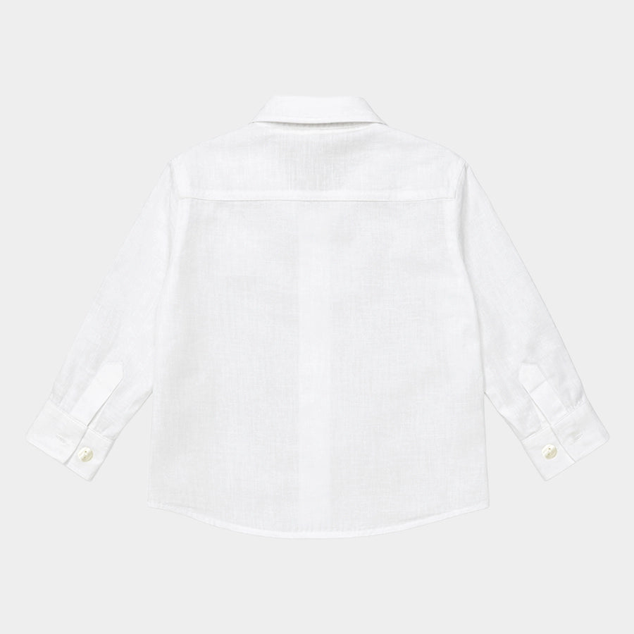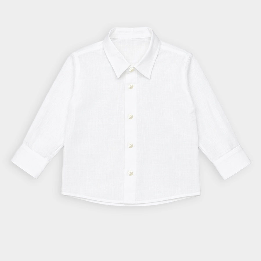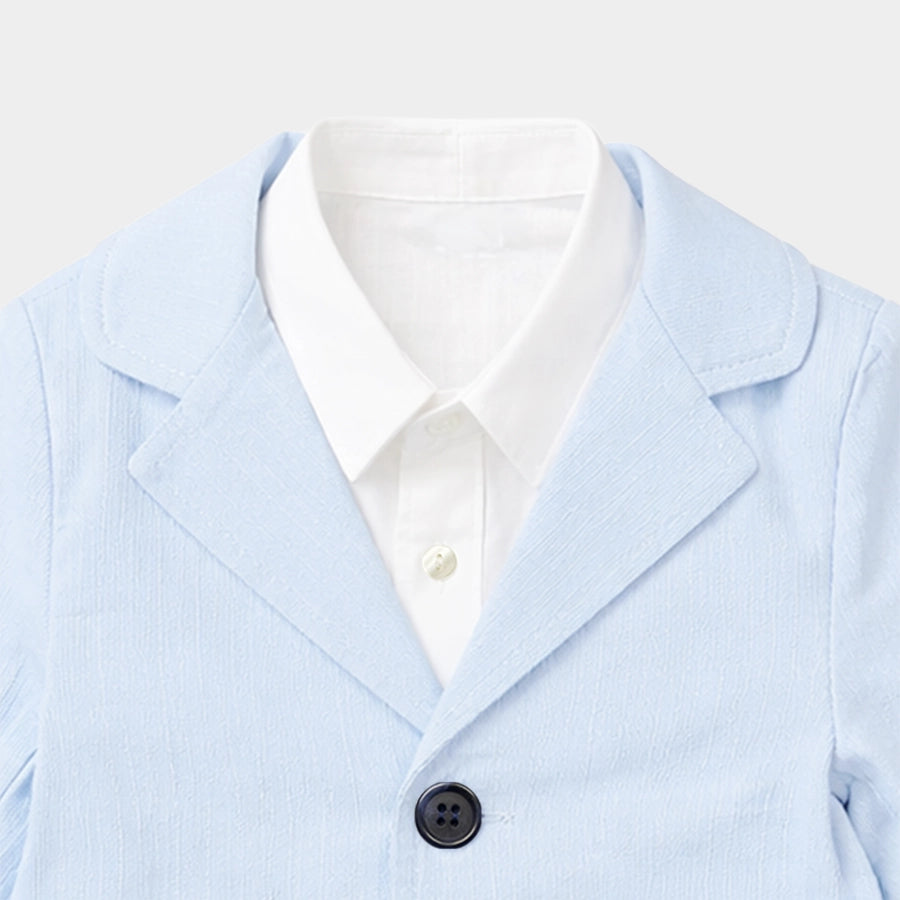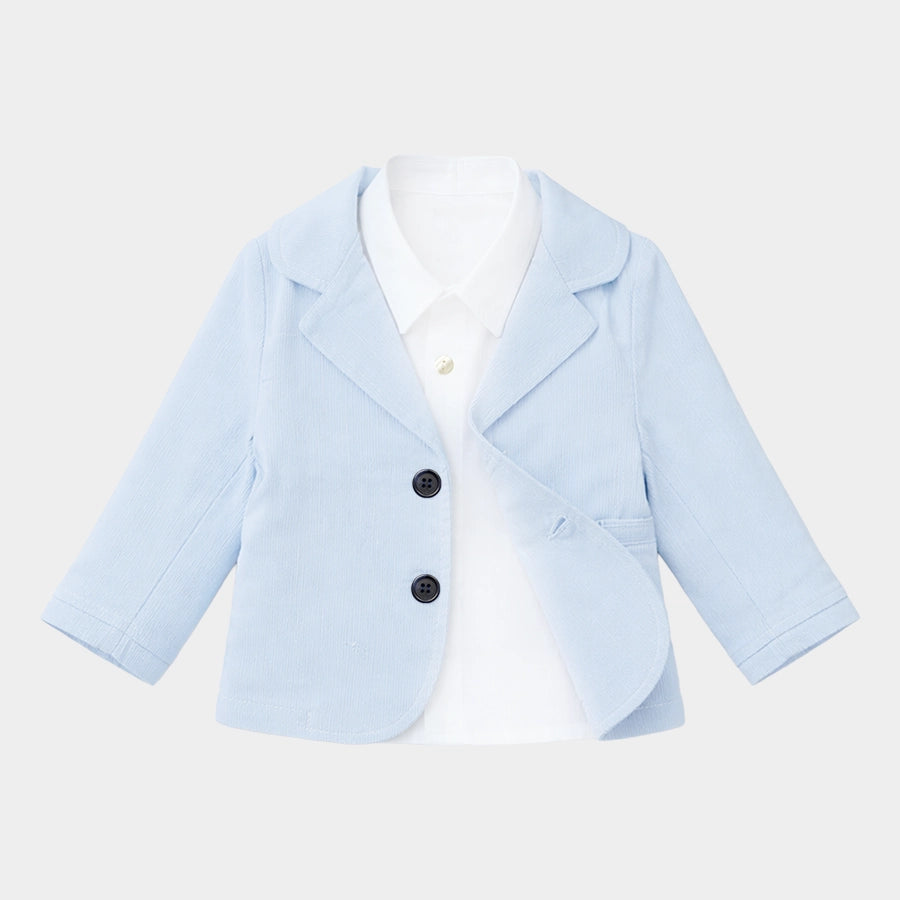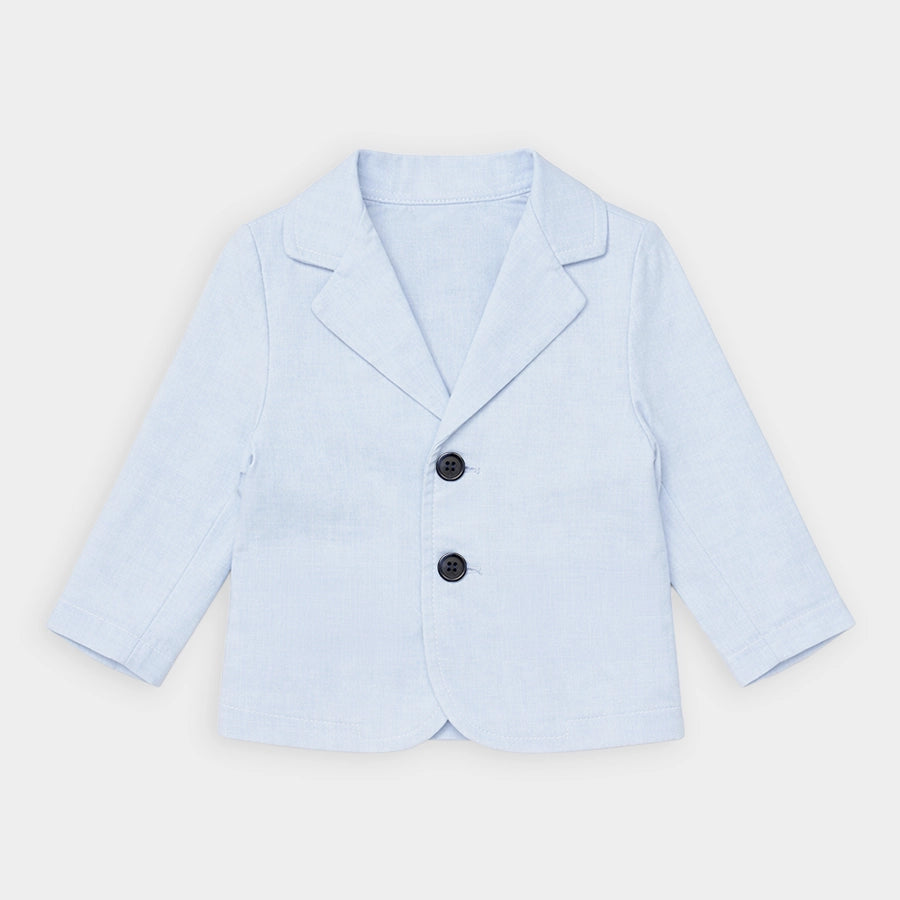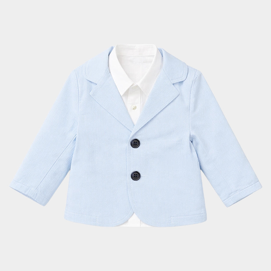 Blazer and shirt set for boys woven in soft 100% cotton for the summer season. Features a full-sleeve, solid-coloured blazer with 2-button opening. Solid-coloured shirt with full sleeves, and front button opening. Available in different sizes for kids 6M-5Y.