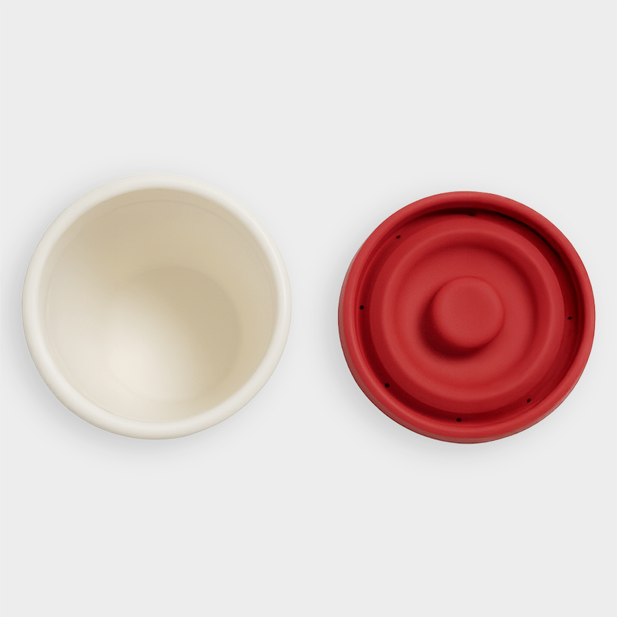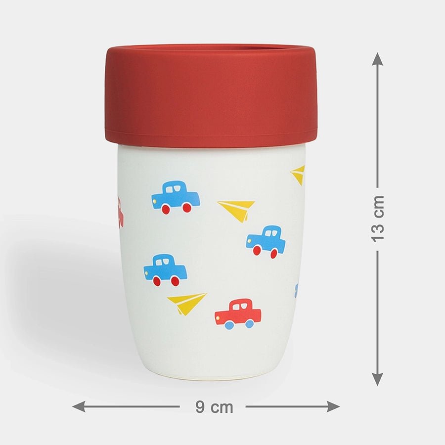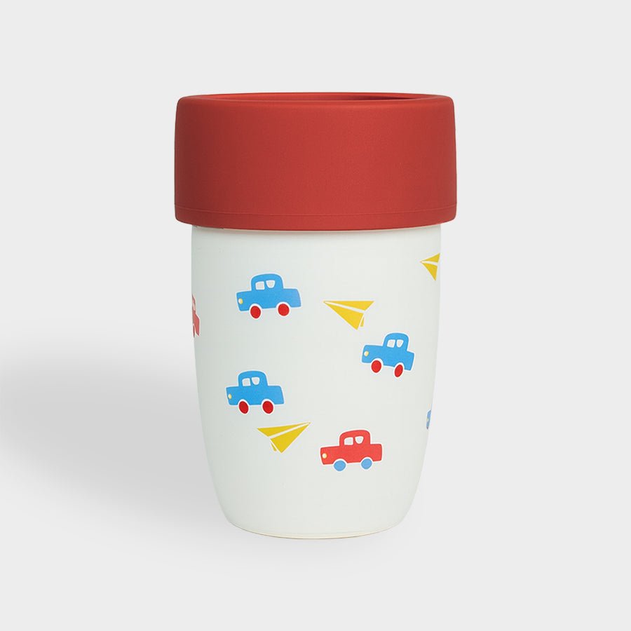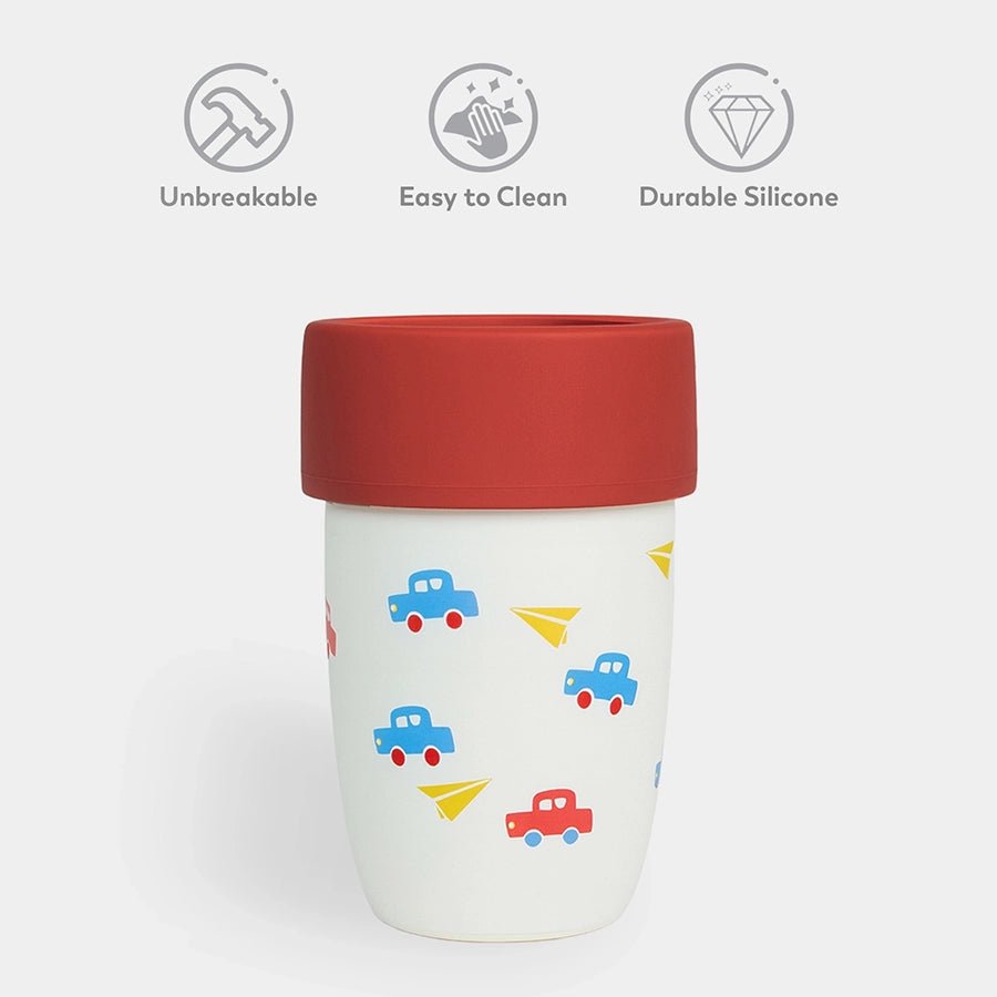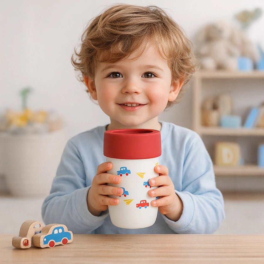 Durable sipper cup for kids in food-grade 100% silicone. Comes with all-over prints and an integrated 360° lid featuring an air suction design. Simply push in for sipping and pull out for leak-proof carrying and storage. Easy to grip for small hands and suitable for everyday use. Best for kids 6M–4Y.