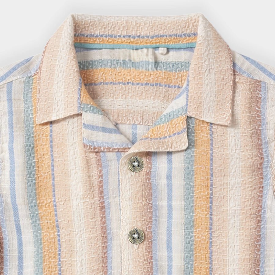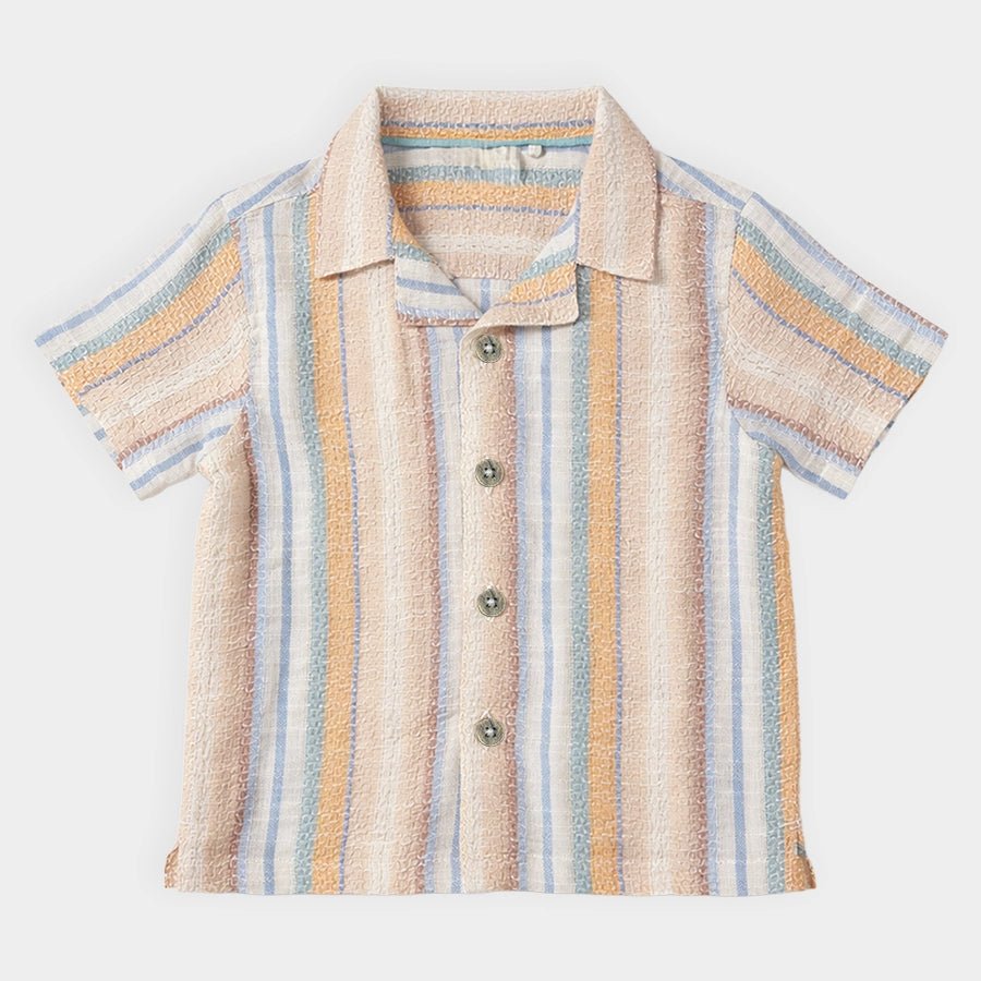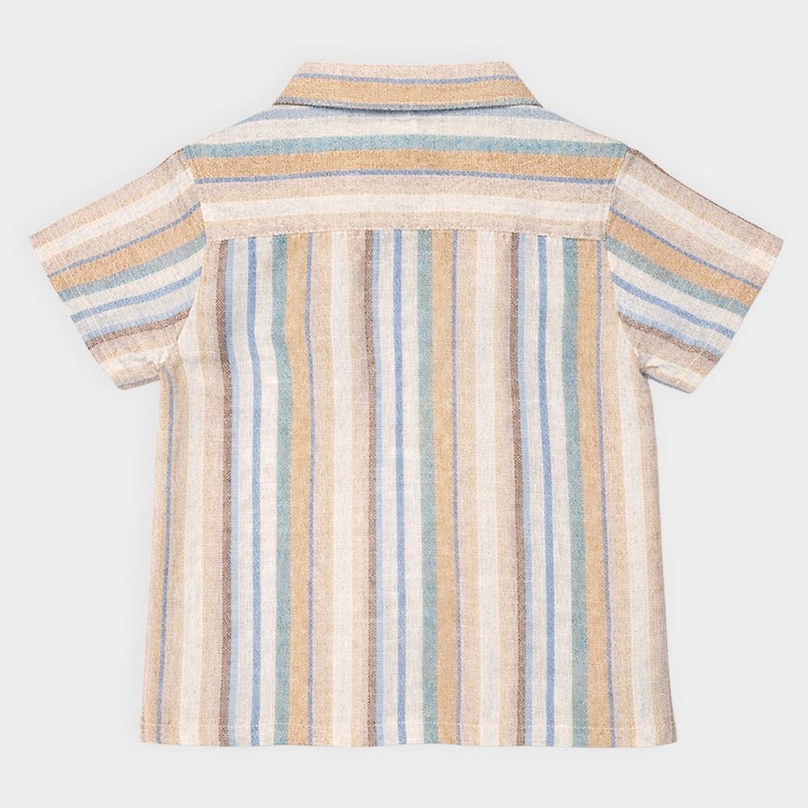 Shirt for boys woven in BCI certified 100% cotton for the summer season. Features half sleeeves, wood-look button opening down the front, multi-coloured stripe designs, and a collared neckline. Available in different sizes for kids 6M-6Y.