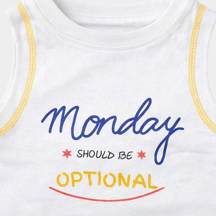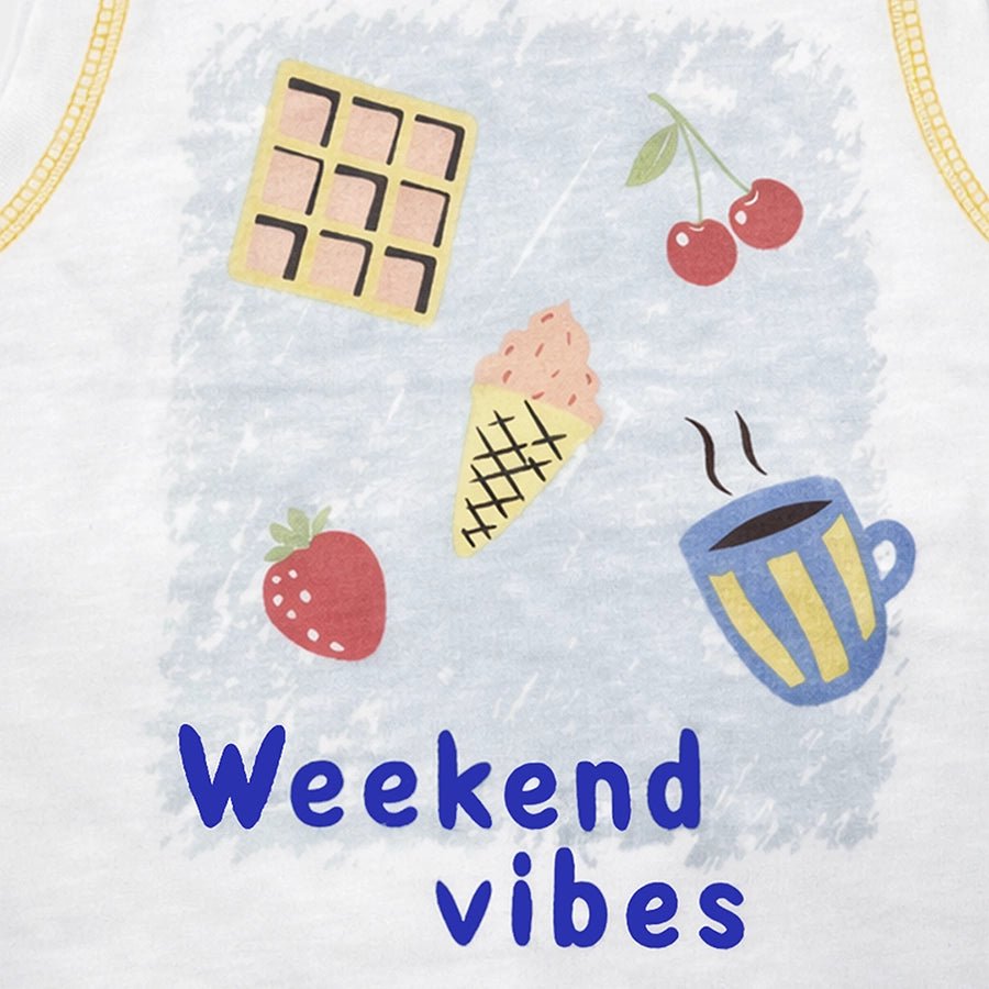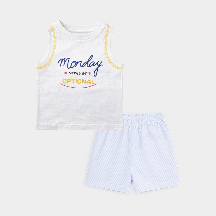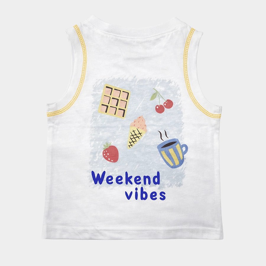 Vest and shorts set for boys in soft knit 100% cotton for the summer season. Features a sleeveless vest with printed designs at the front and back. Shorts with contrast-coloured vertical stripes and a concealed elasticised waistband. Available in different sizes for kids 0-6Y.