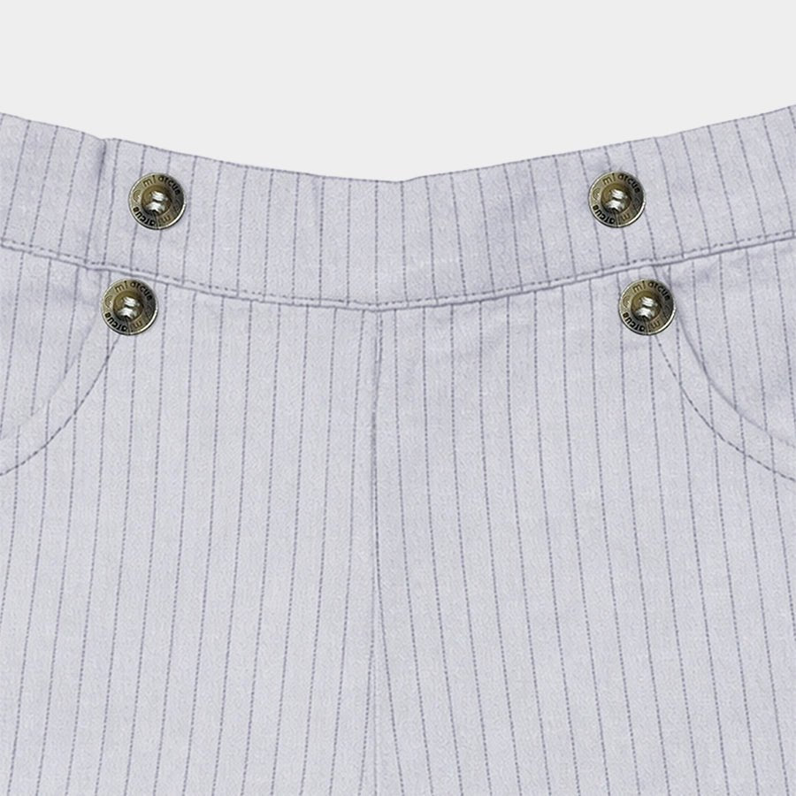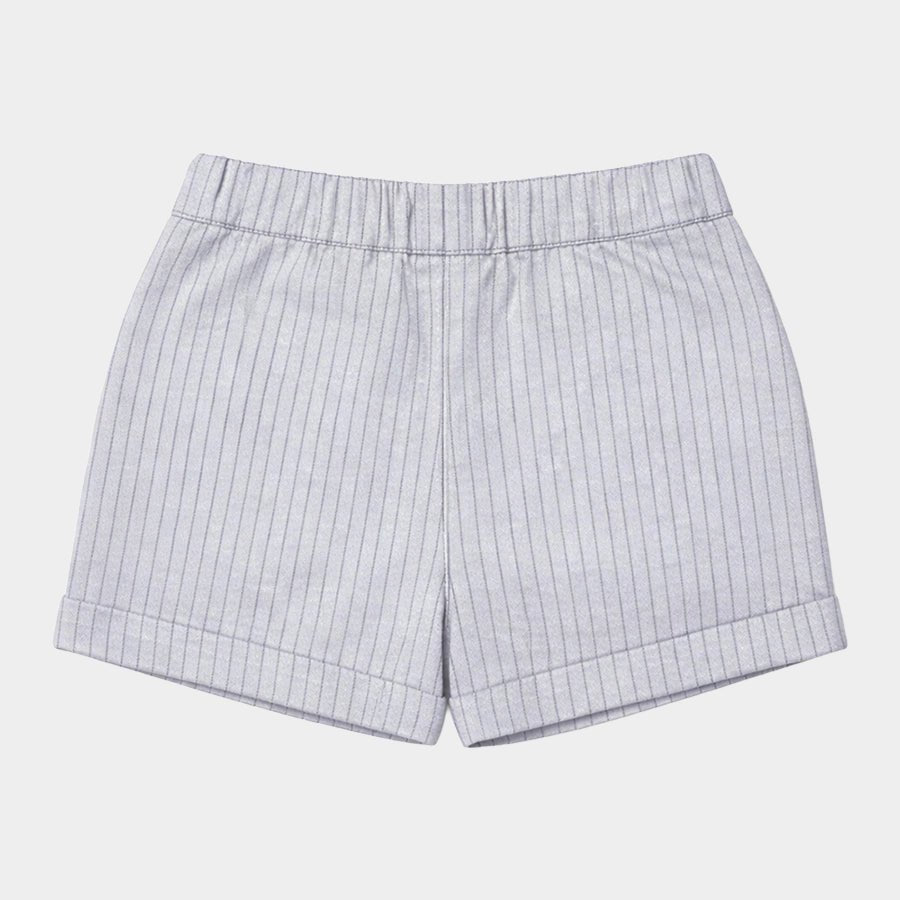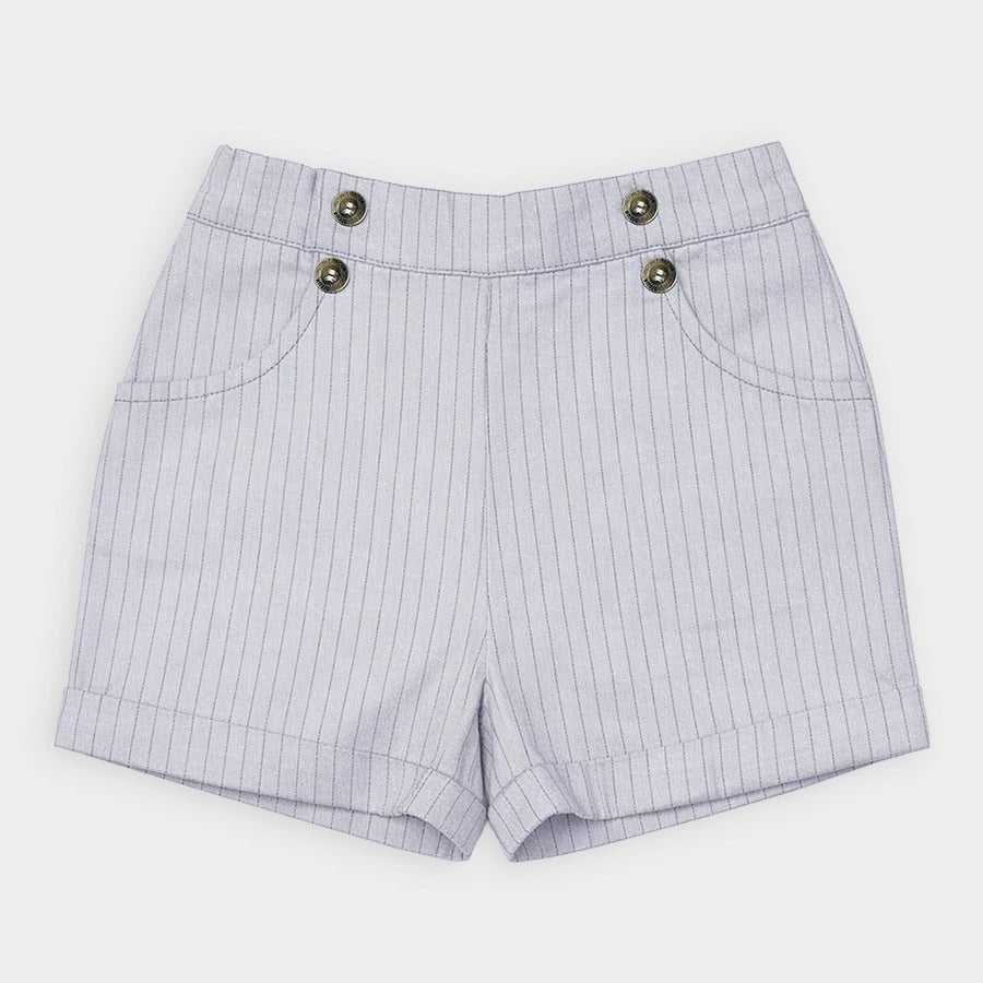 Shorts for boys woven in soft 98% cotton, and 2% spandex blend for the summer season. Features decorative buttons at the front, side pockets, elasticated waistband at the back, striper designs, and sewn-in turn-up at the leg opening. Available in different sizes for kids 12M-6Y.