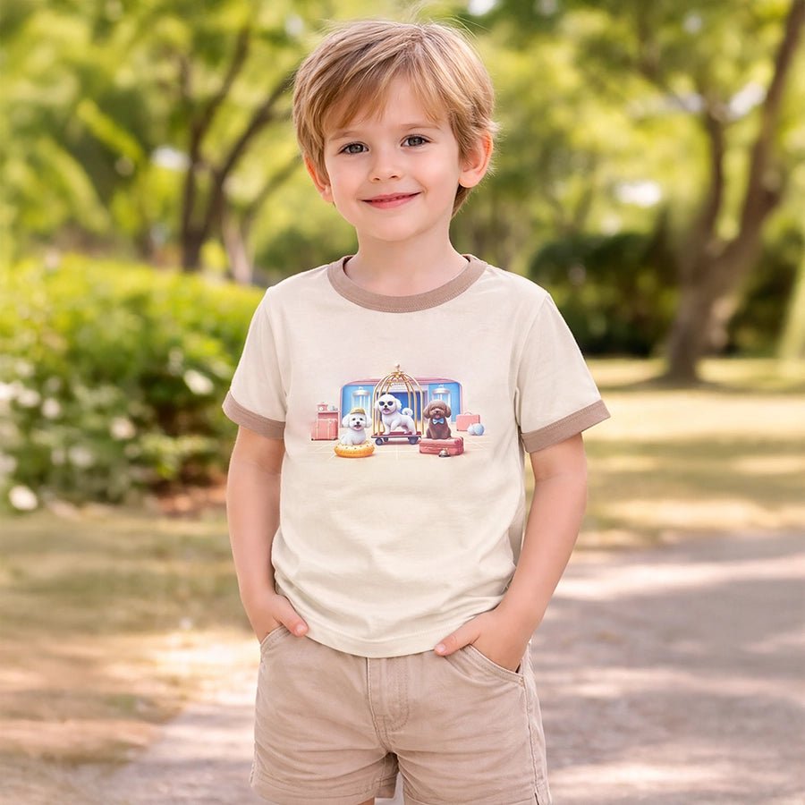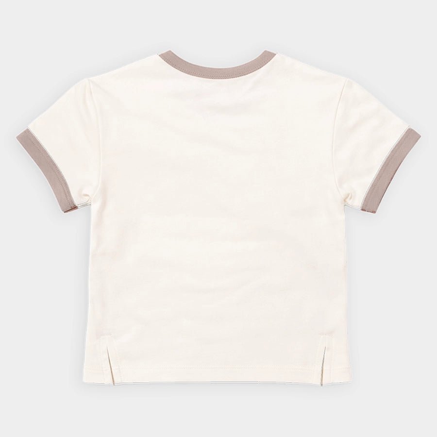 T-shirt for boys knitted in soft 95% cotton and 5% elastane blend for the summer season. Features half sleeves, round neckline, and printed designs. Available in different sizes for kids 12M-6Y.