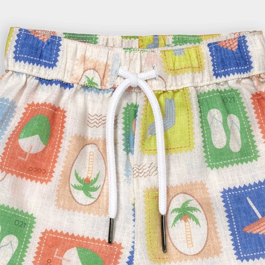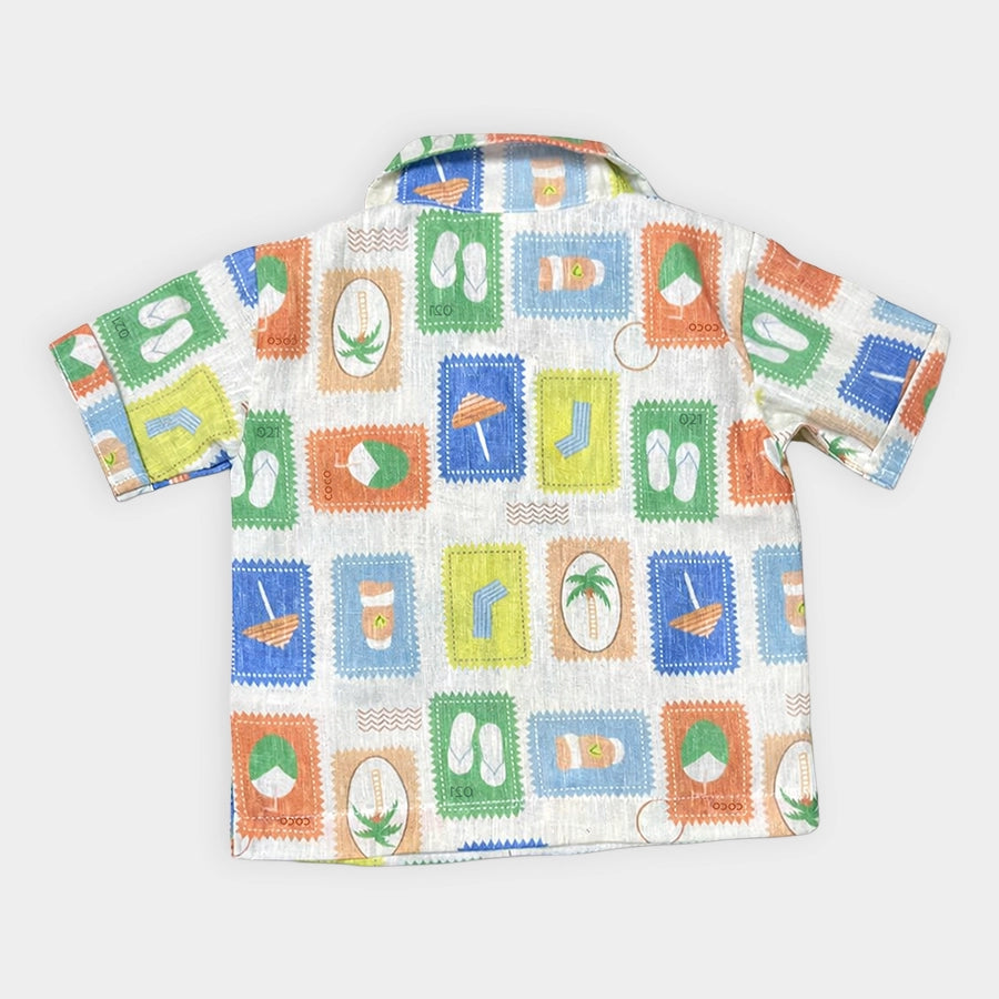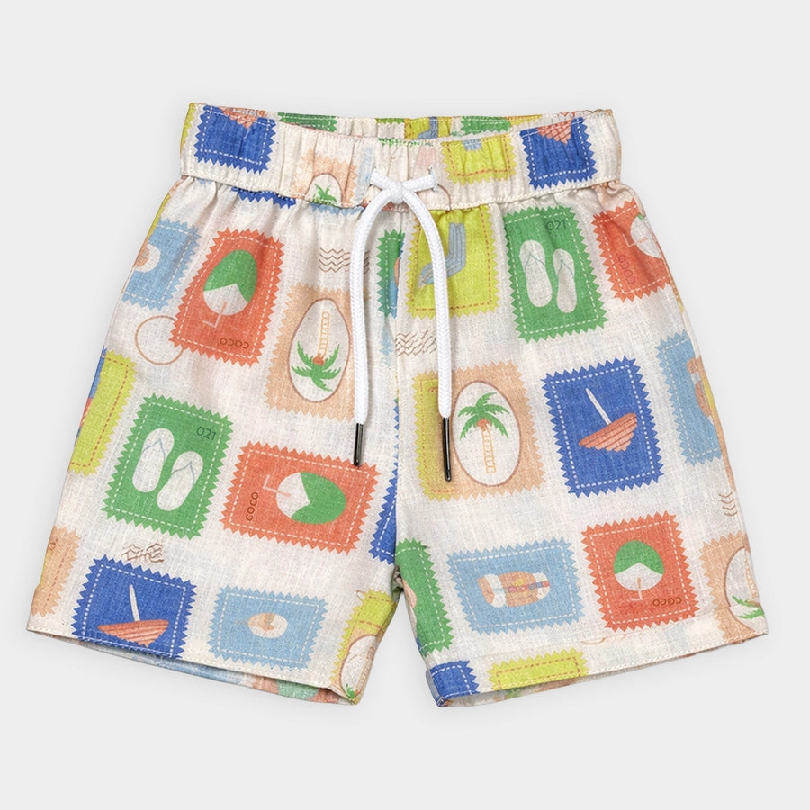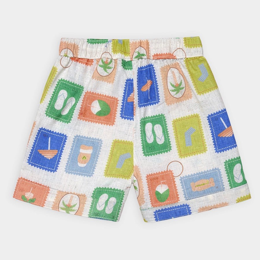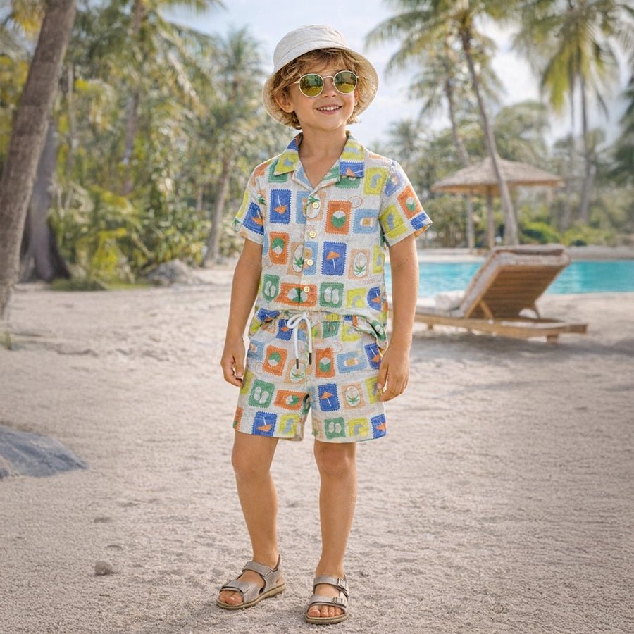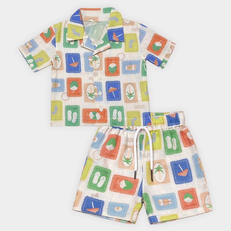 Shirt and shorts set for boys woven in soft 16% cotton, 57% polyester, 10% linen, and 17% viscose blend for the summer season. Features half-sleeve shirt with all-over prints, collared neckline, front-open buttons, and sewn-in turn-up at the sleeve opening. Matching shorts with a concealed elasticised waistband, inserted drawcords, and sewn-in turn-up at the leg opening. Available in different sizes for kids 12M-4Y.