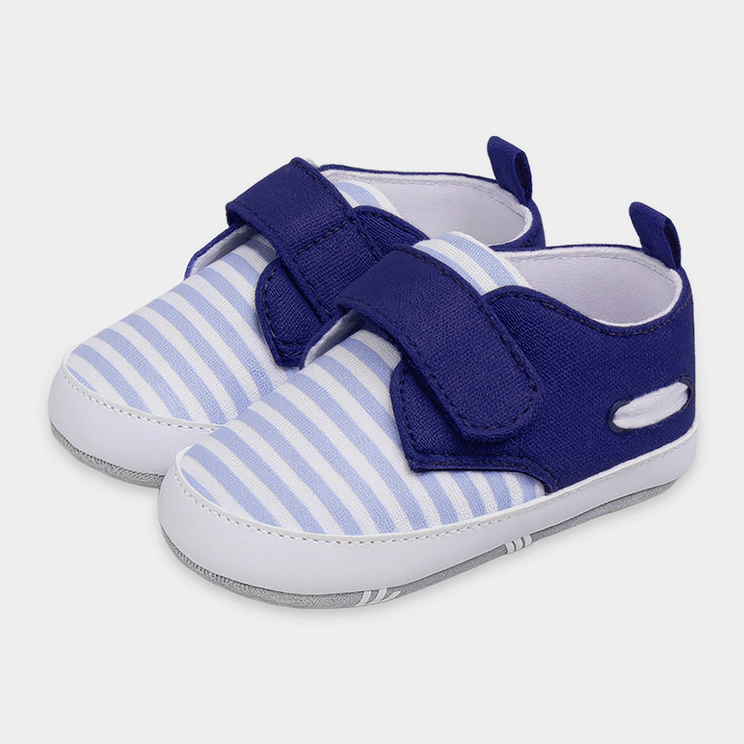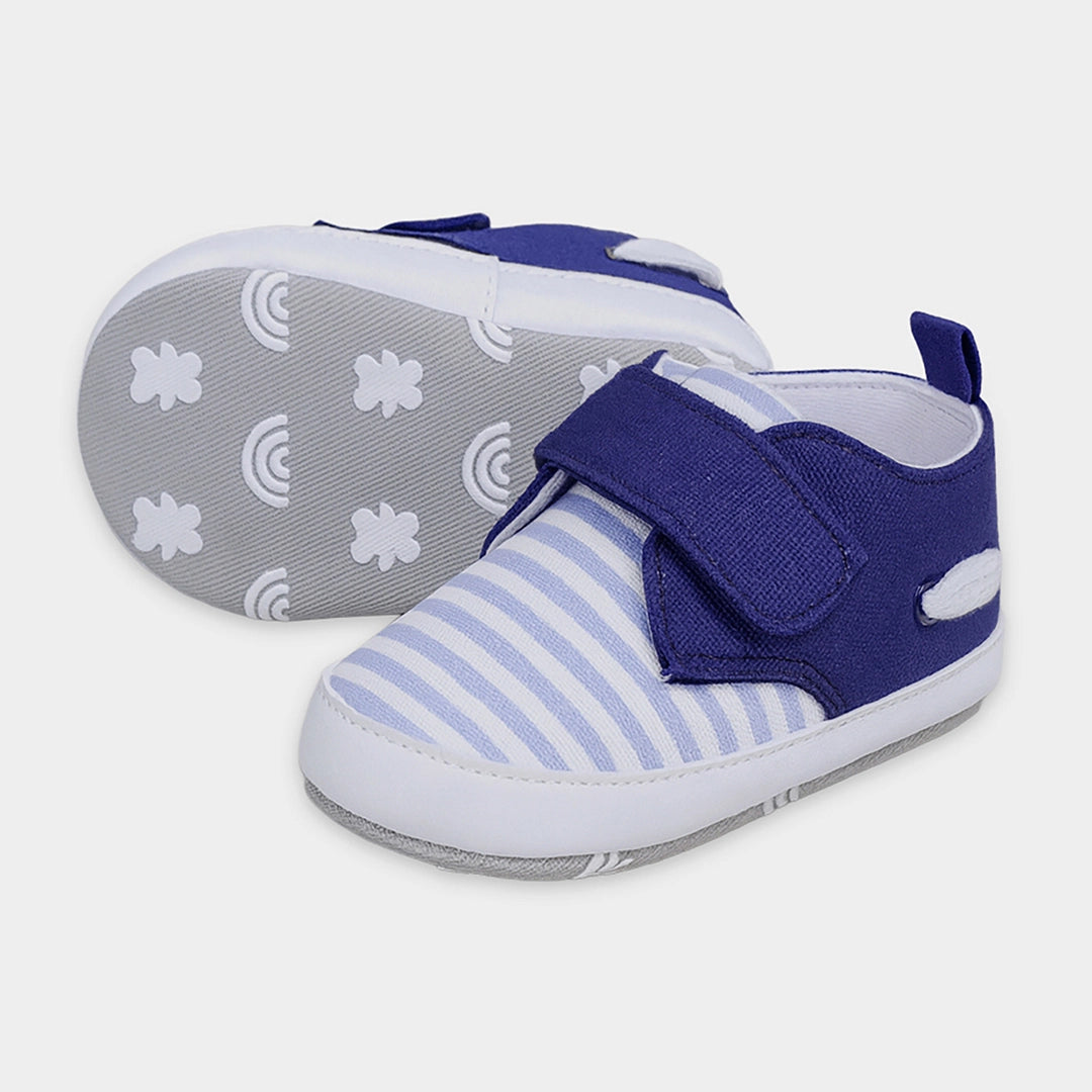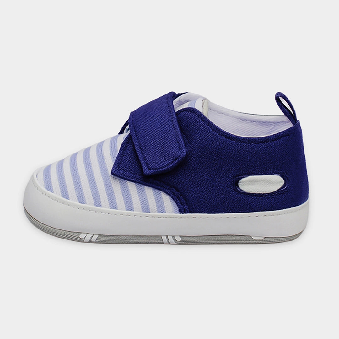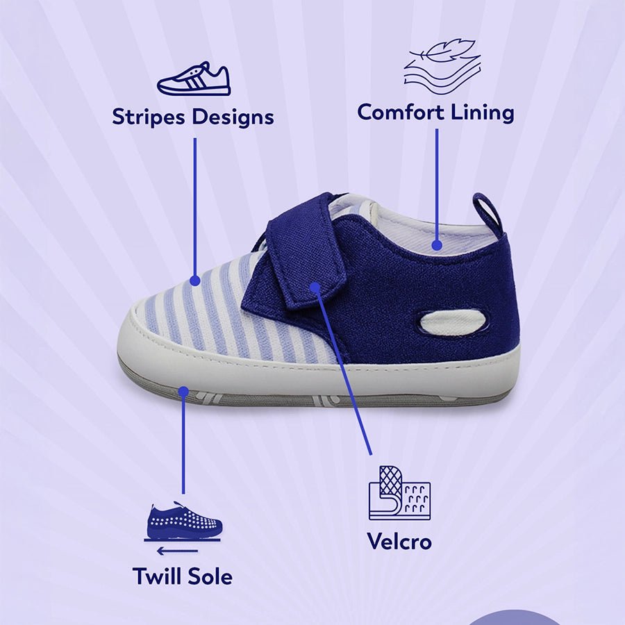 Booties for boys in soft PU material upper, and twill fabric outsole with puff prints. Features a memory foam insole, velcro-fasten hook-and-loop tab on top, striper designs, and a loop at the back for easy put-on and removal. Available in different sizes for kids 0-12M.