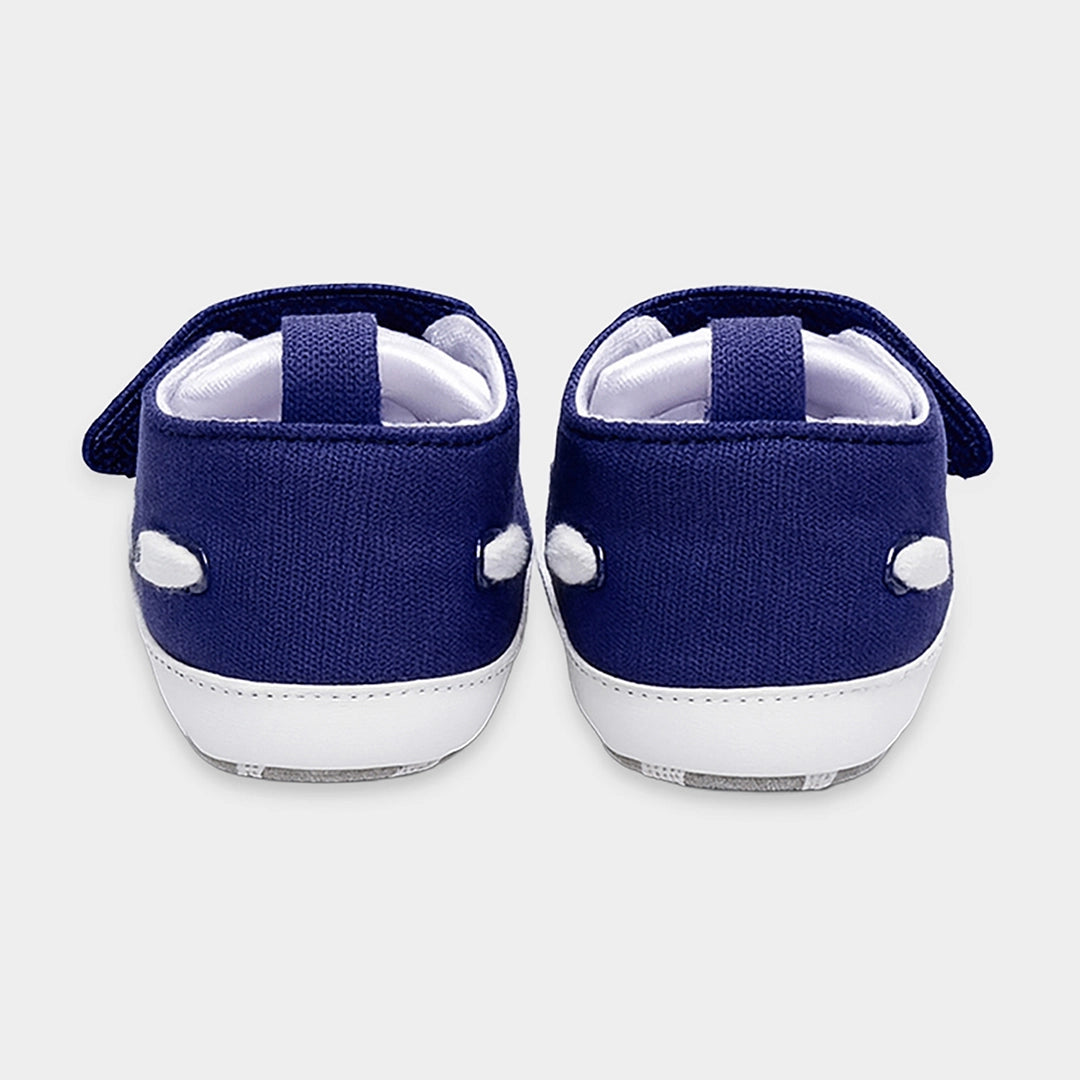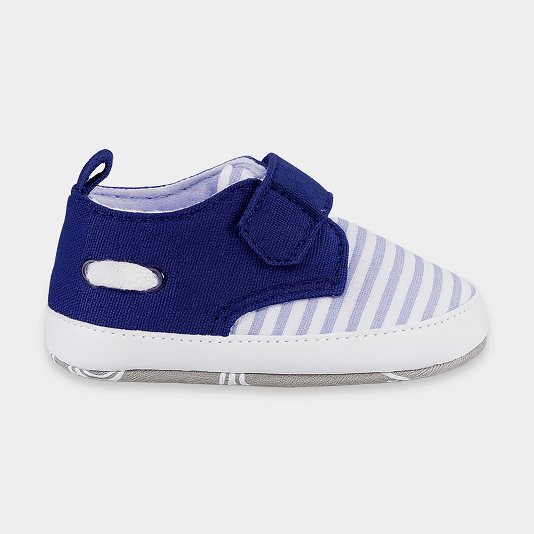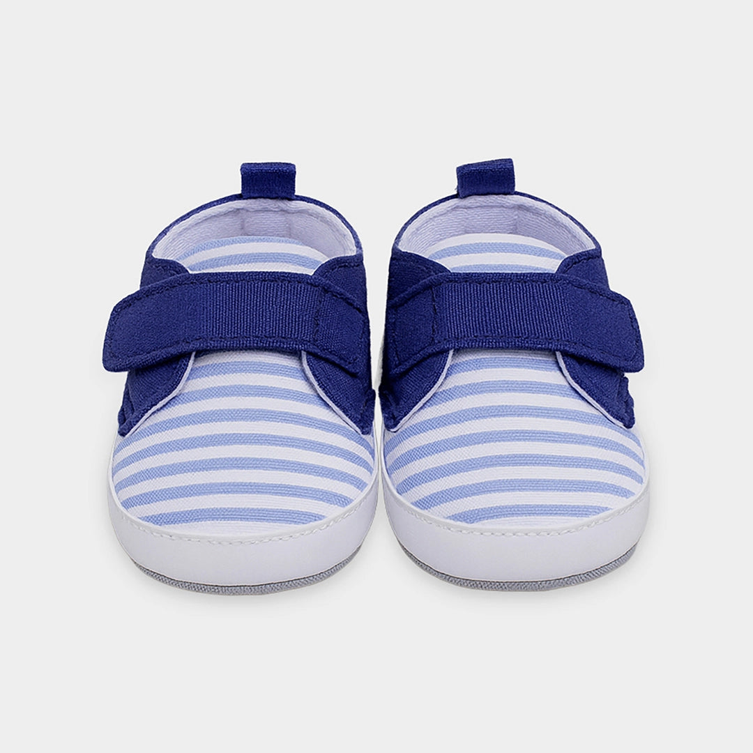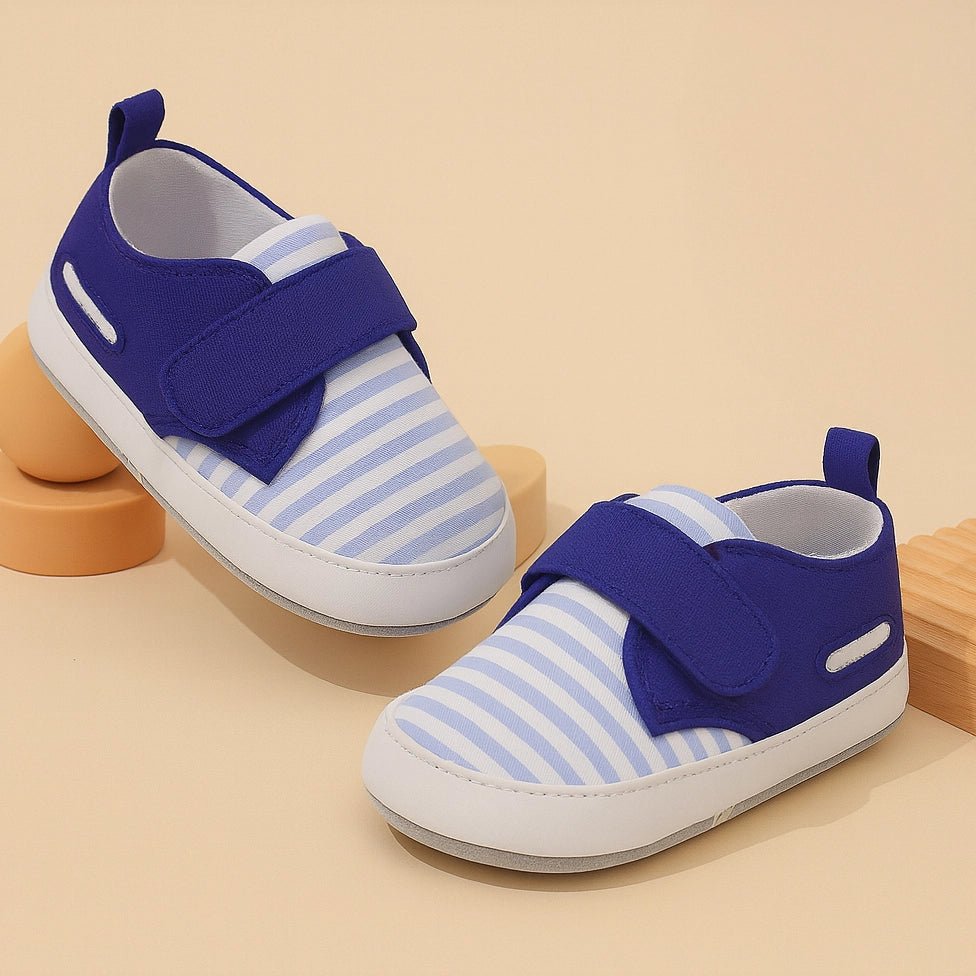 Booties for boys in soft PU material upper, and twill fabric outsole with puff prints. Features a memory foam insole, velcro-fasten hook-and-loop tab on top, striper designs, and a loop at the back for easy put-on and removal. Available in different sizes for kids 0-12M.