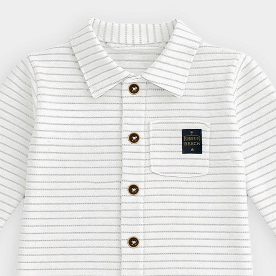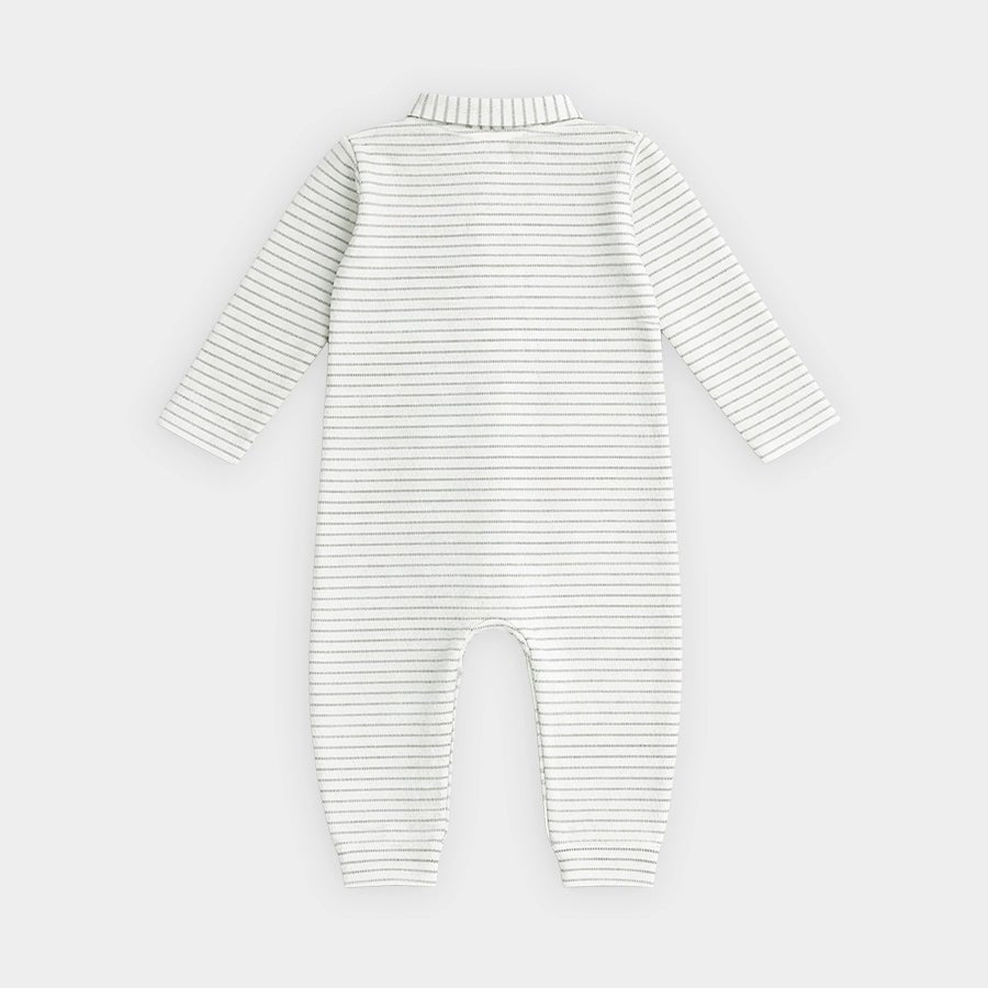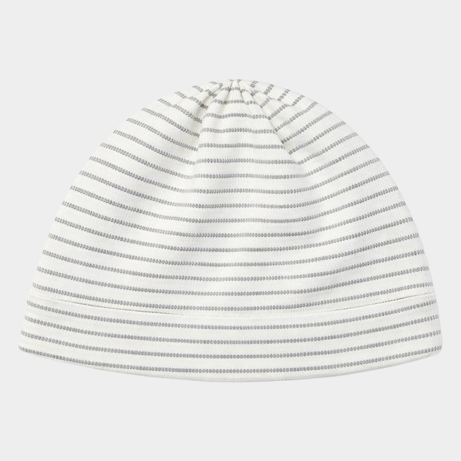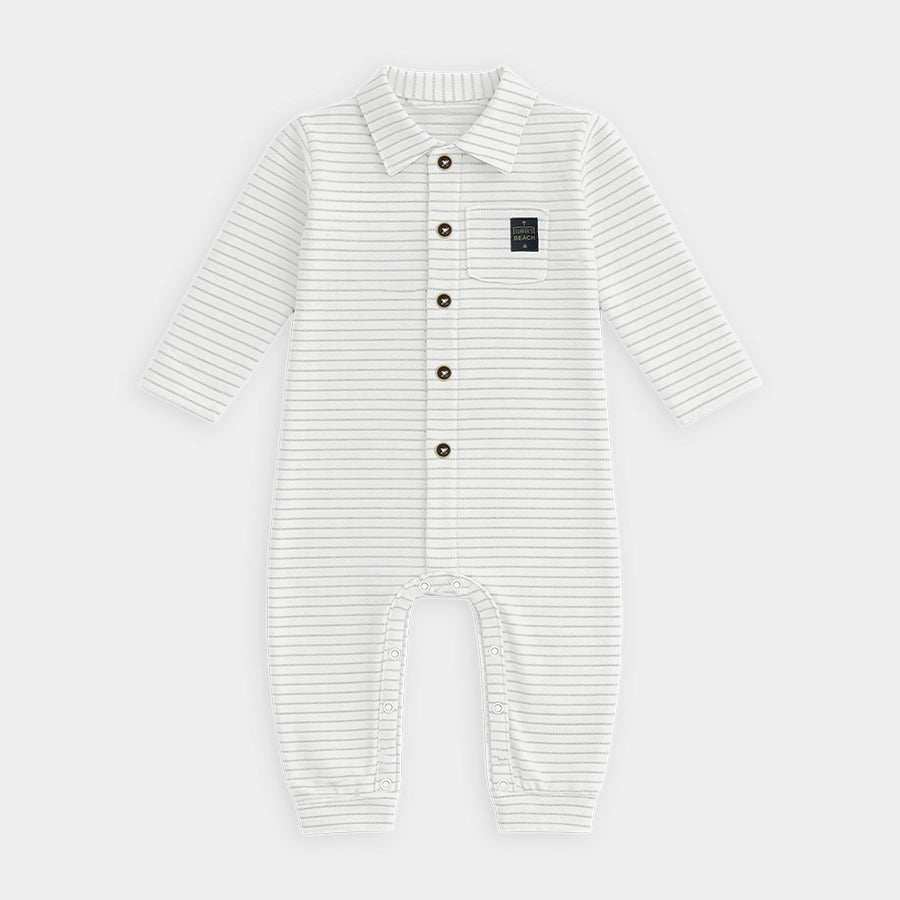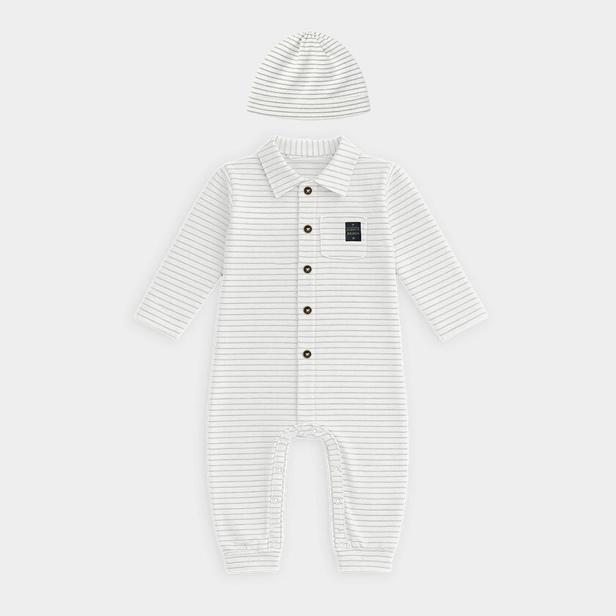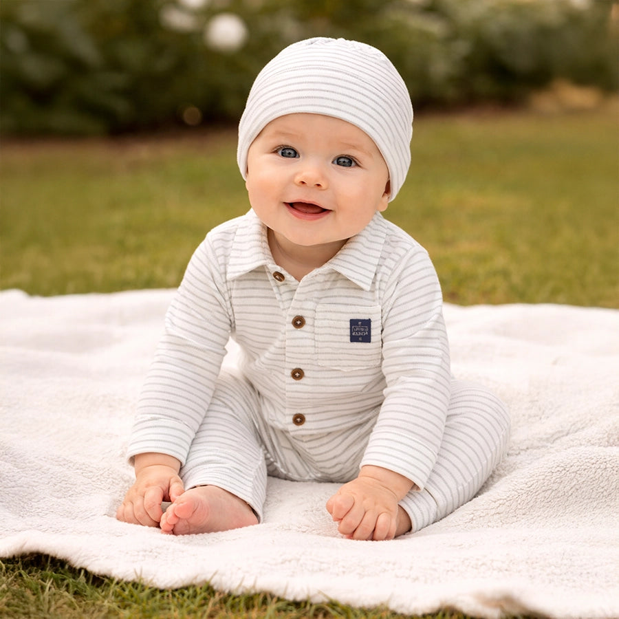 Sleepsuit set for boys in soft knit 100% cotton for the summer season. Includes a sleepsuit with all-over stripes, wood-look button opening down the front, chest pocket, snap button opening at the crotch for easy nappy changing, and a collared neckline. Matching cap with a sewn-in turn-up. Available in different sizes for kids 0-18M.