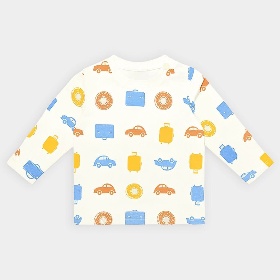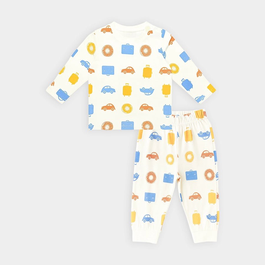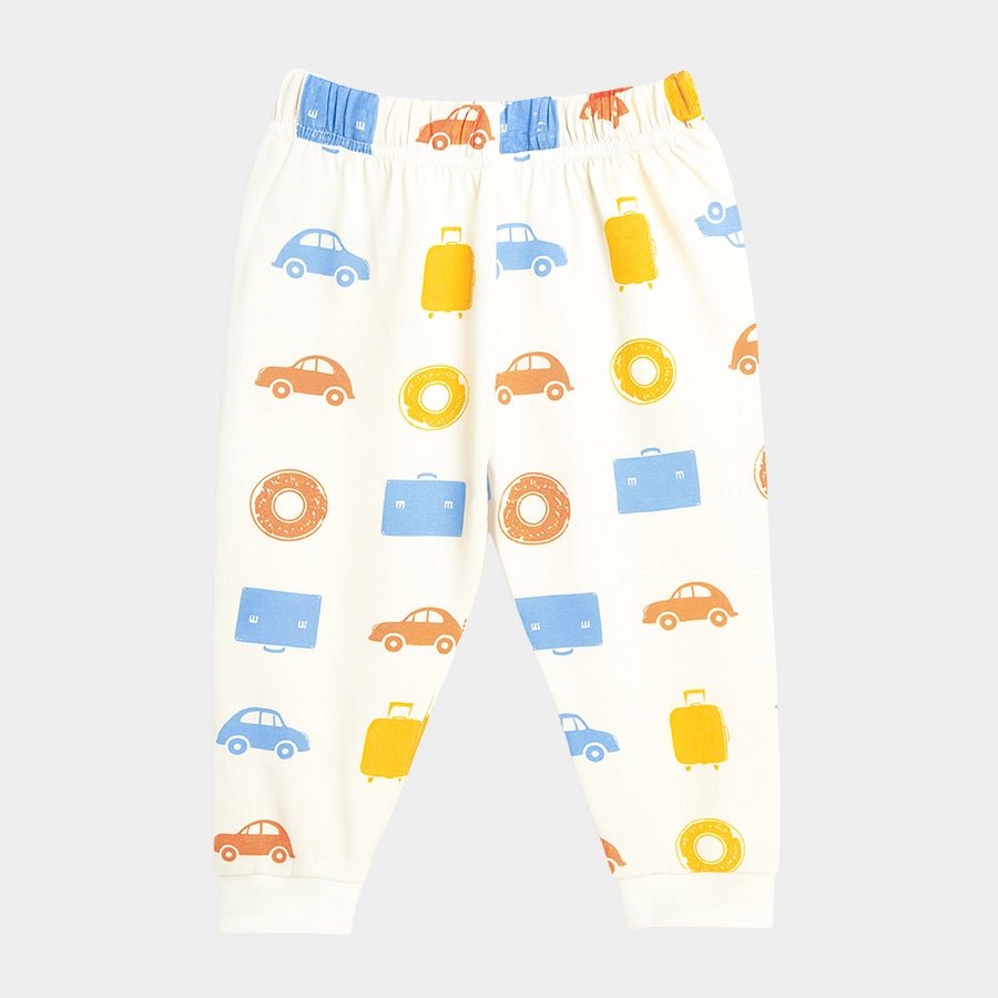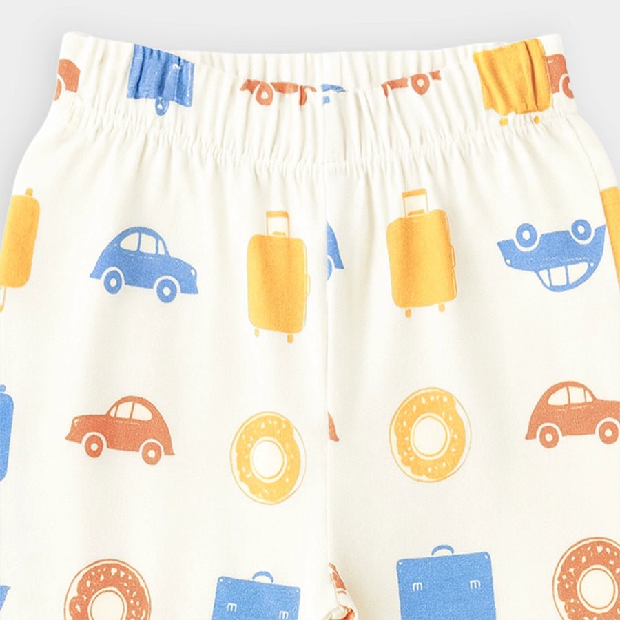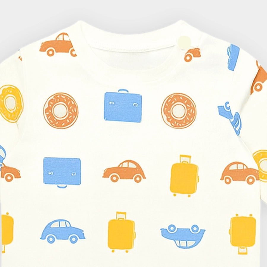 T-shirt and pyjama set for boys in soft knit 95% cotton and 5% elastane blend for the summer season. Features a full-sleeve t-shirt with all-over prints, a round neckline, and shoulder snap button. Matching pyjamas with all-over prints and a concealed elasticised waistband. Available in different sizes for kids 0-6Y.
