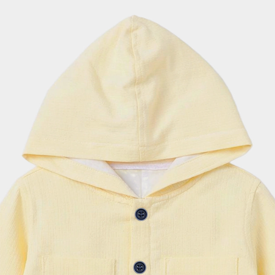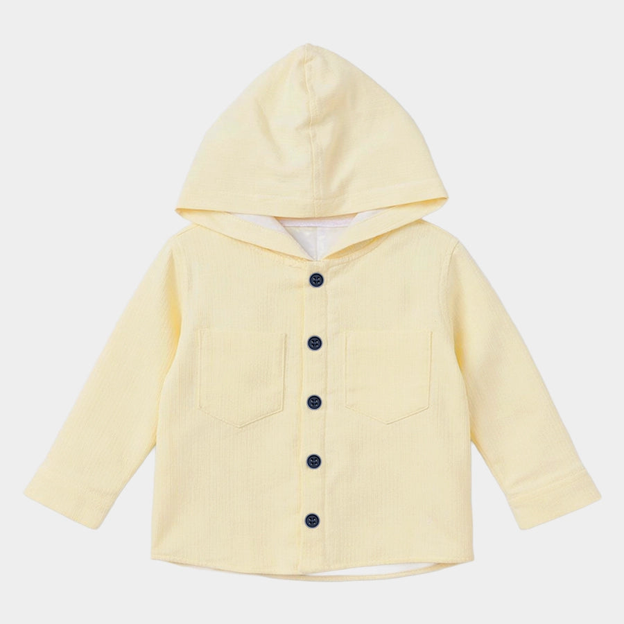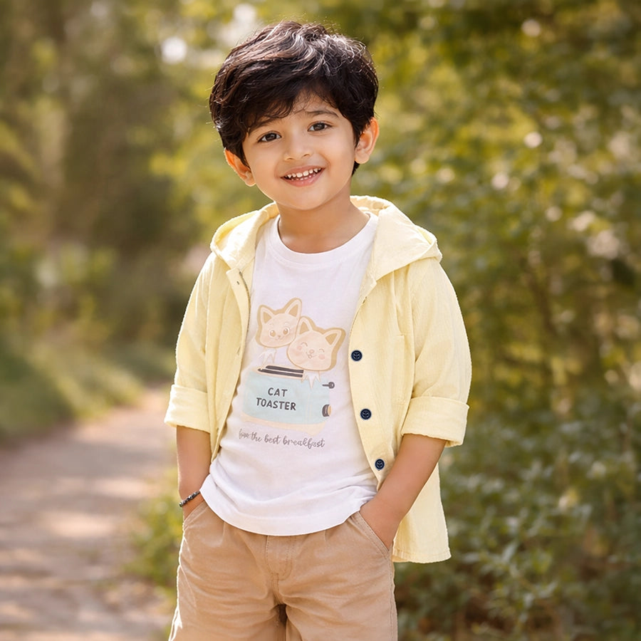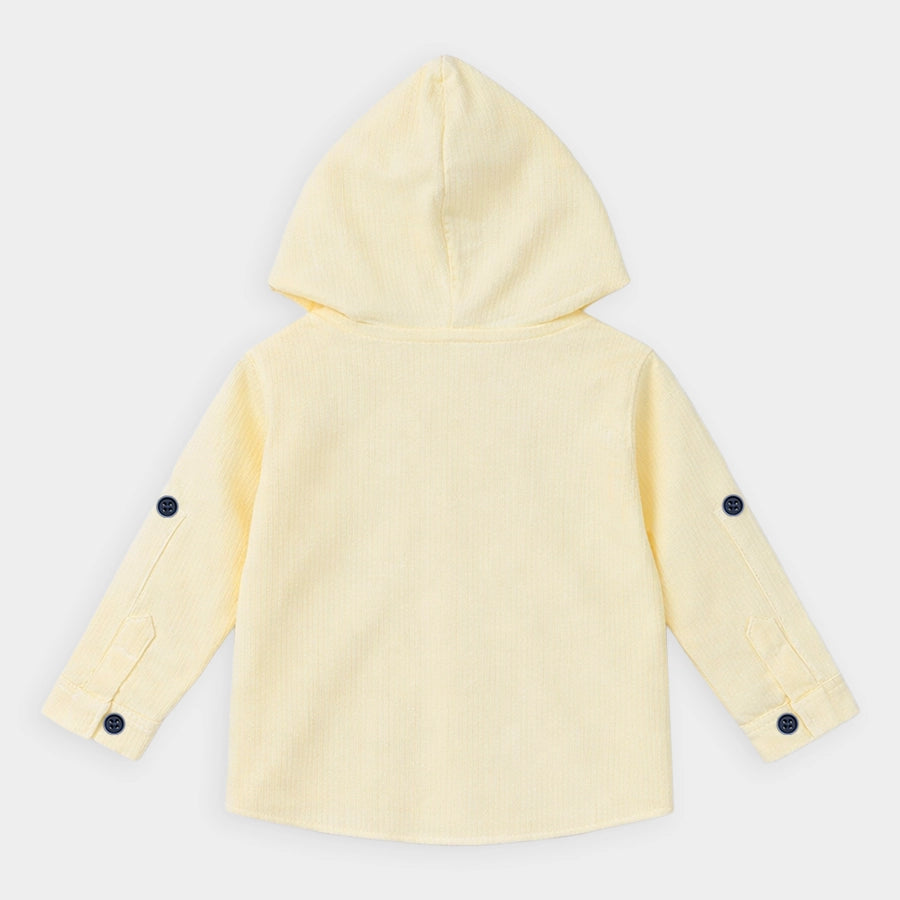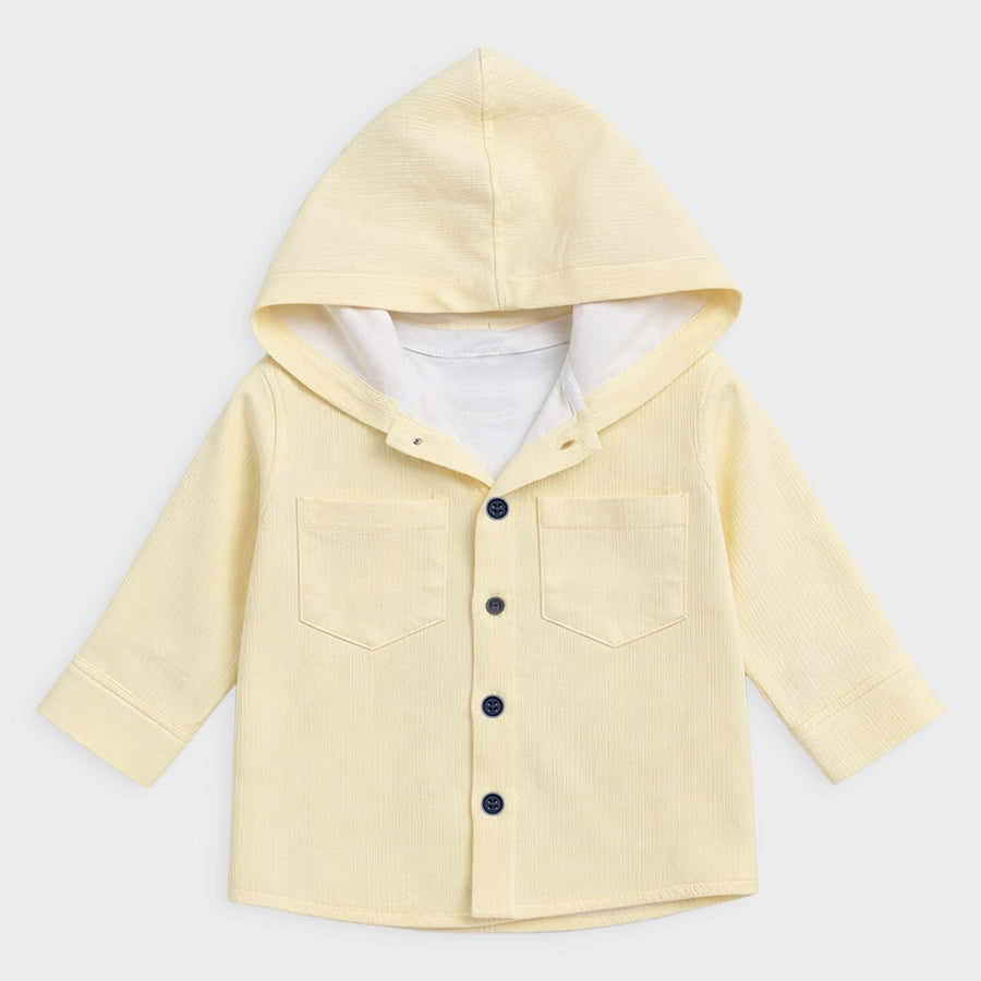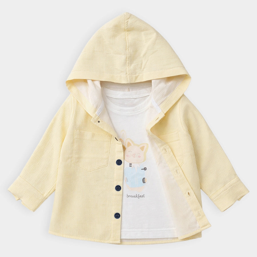 Shirt and t-shirt set for boys in soft 90% cotton and 10% recycled polyester for the summer season. Includes a solid-coloured woven shirt with full sleeves, attached hood, chest pocket, and front buttons. Knitted t-shirt with half sleeves and printed designs. Available in different sizes for kids 6M-5Y.