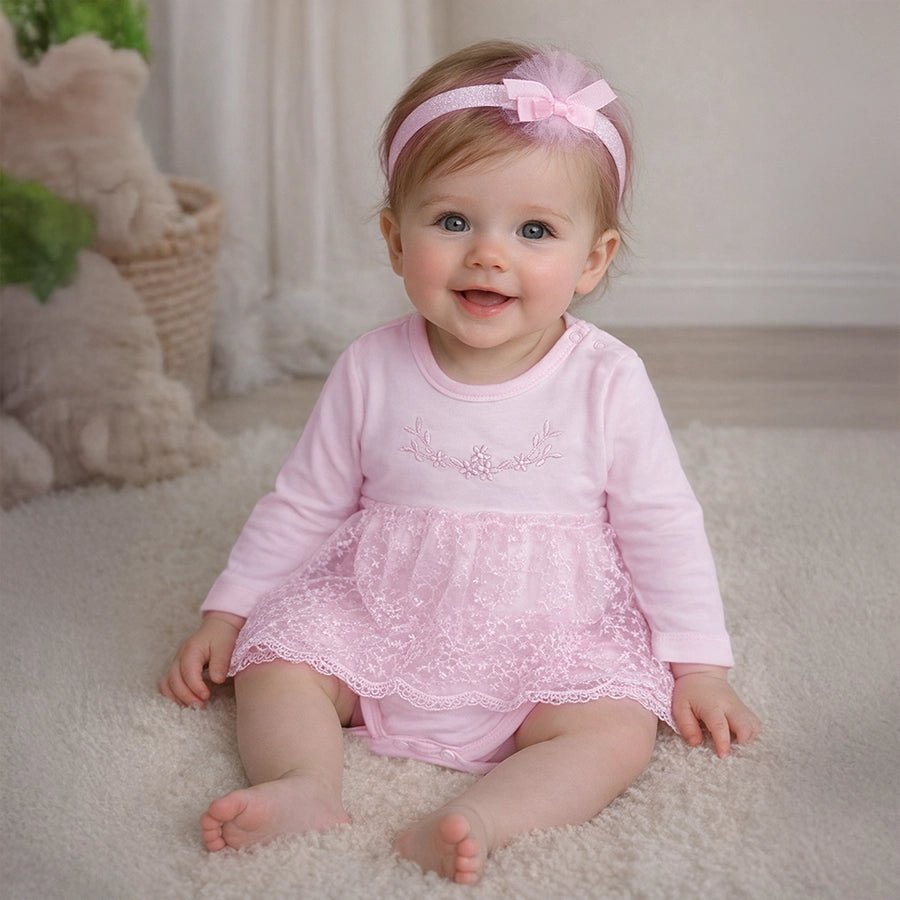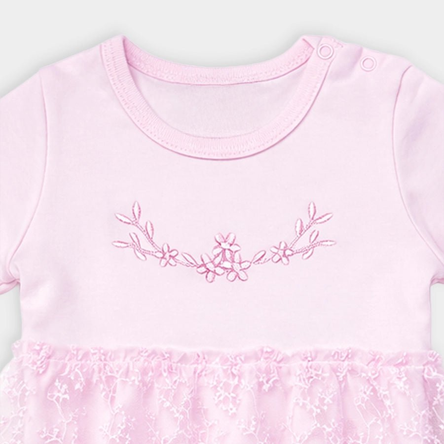 Frock for girls in soft 100% cotton for the summer season. Features full sleeves, embroidered designs, snap button opening near the neckline and at the crotch for easy nappy changes, attached mesh detailing in 100% polyester. Matching elasticised headband with attached bow applique. Available in different sizes for kids 0-24M.