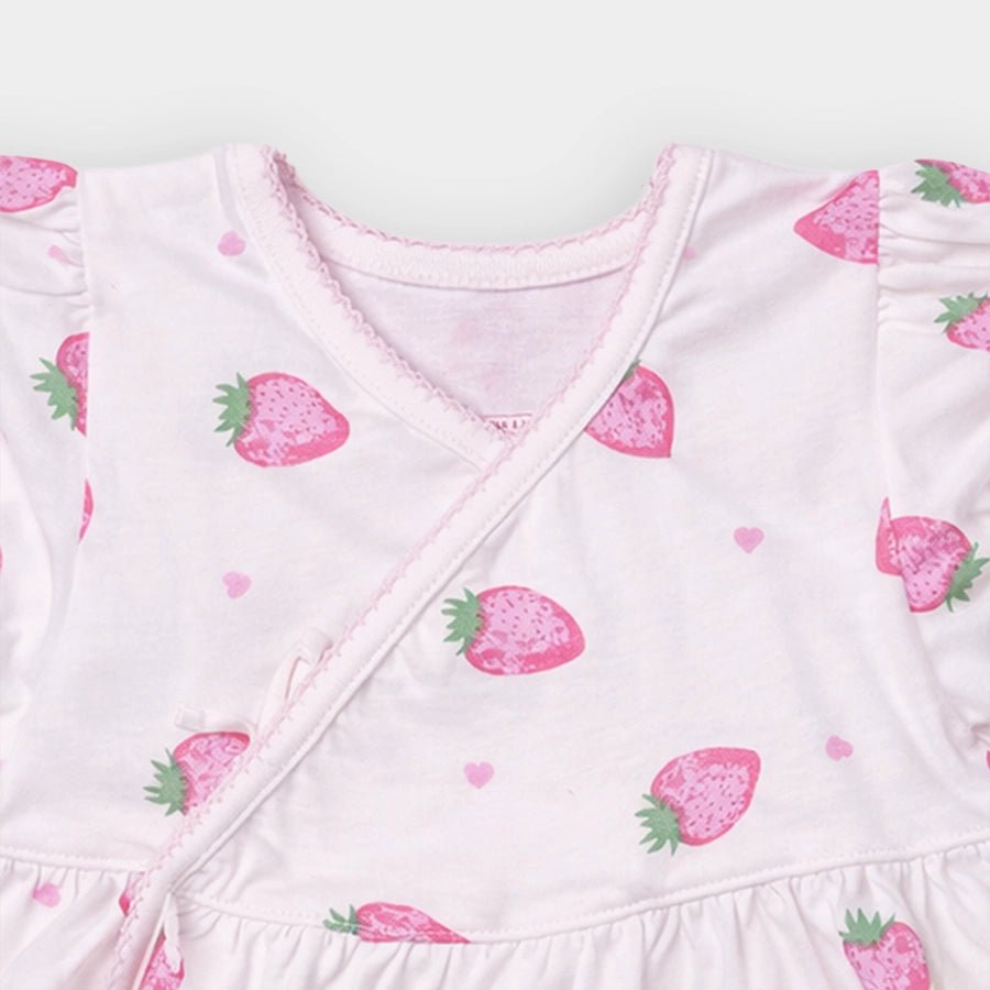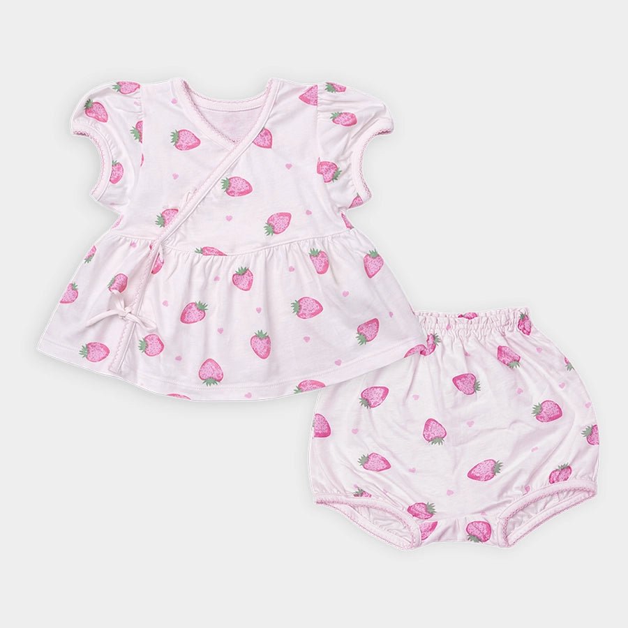 Top and bloomer set for girls in soft knit 100% cotton for the summer season. Features short-sleeve wrapover top with a tie-knot front and printed designs. Matching printed bloomers with a concealed elasticised waistband and leg opening. Available in different sizes for kids 0-12M.
