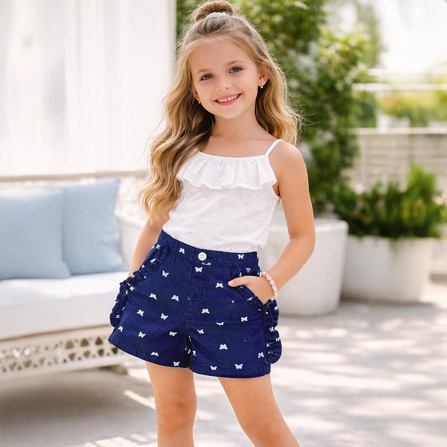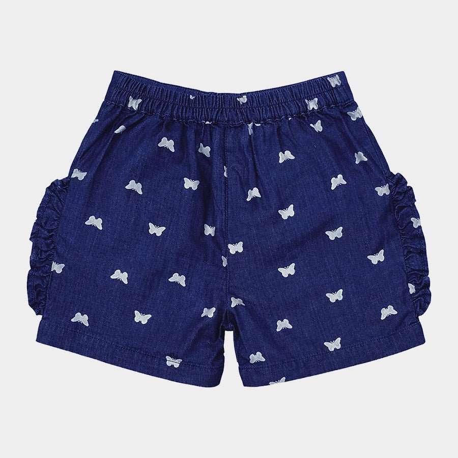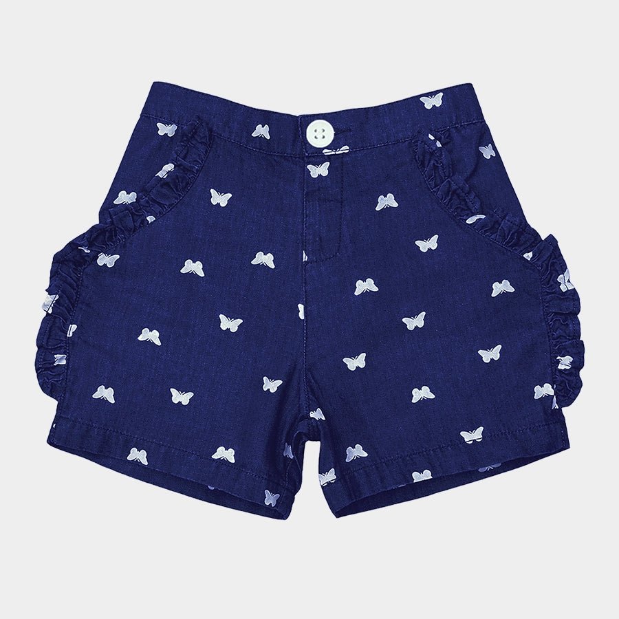 Shorts for girls woven in soft 100% cotton for the summer season. Features a concealed elasticised waistband at the back, button opening, side pockets, dummy fly with snap button opening, all-over butterfly-theme prints, and a frilled edge. Available in different sizes for kids 2-6Y.