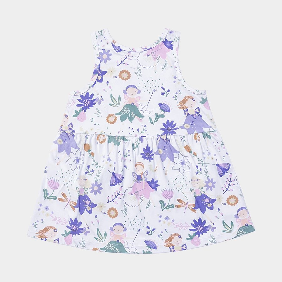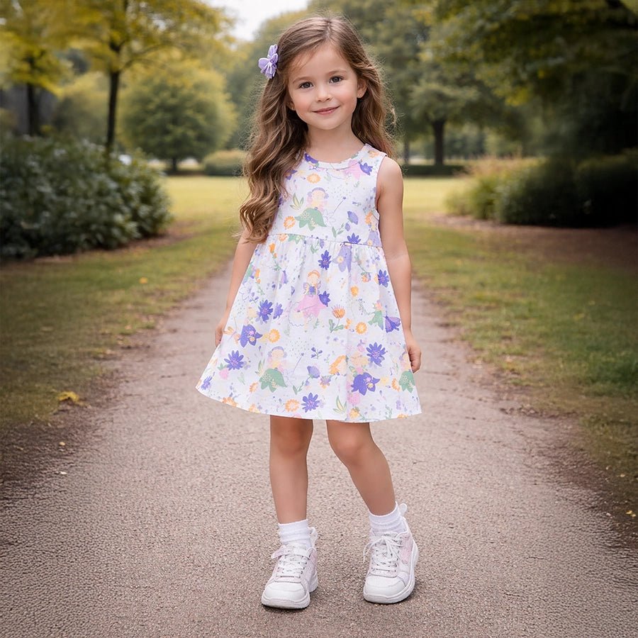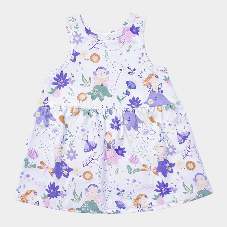 Sleeveless frock for girls in soft knit 95% cotton and 5% elastane blend for the summer season. Features all-over printed designs and gathered seam at the waistline. Available in different sizes for kids 0-6Y.