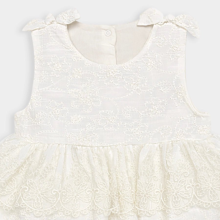 Sleeveless frock for girls in soft 100% cotton for the summer season. Features embroidered designs, mesh frill in 100% polyester, bow appliques on shoulder, and snap button opening at the back. Available in different sizes for kids 0-24M.