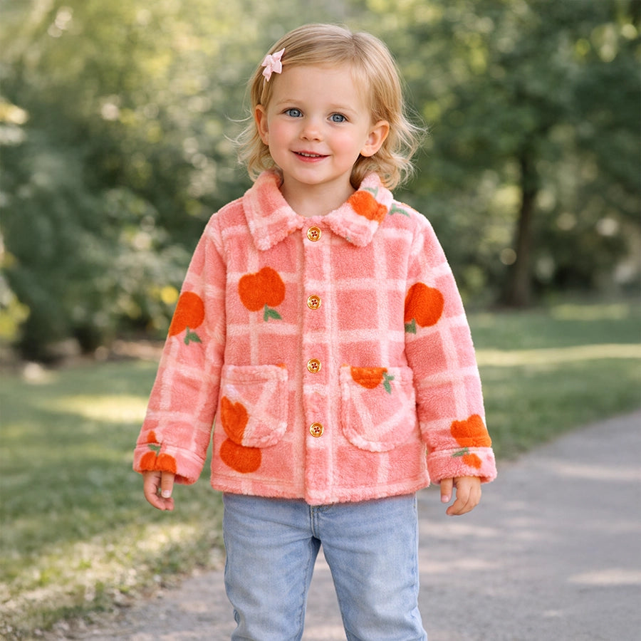 Unisex shirt for kids in soft knit 100% polyester sherpa for the winter season. Features full sleeves, all-over prints, button opening down the front and cuffs, collared neckline, and 2 patch pockets at the front. Available in different sizes for kids 12M-6Y.