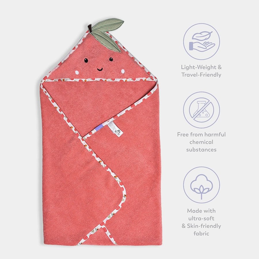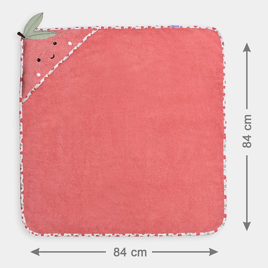 Hooded towel for girls in soft knit 100% cotton for all-weather use. Features an all-over solid colour, attached hood with a peach-theme embroidered and patchwork designs, and fabric leaf-applique. Best suitable for kids 6-12M. Size: 84x84 cm
