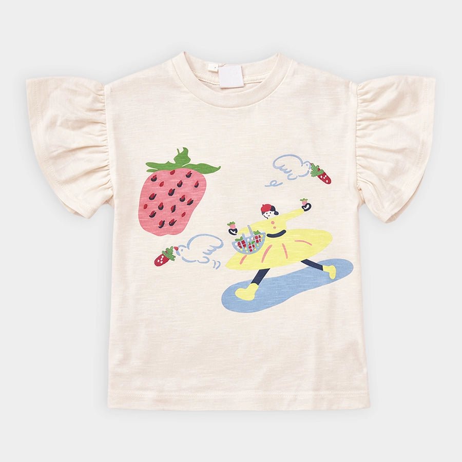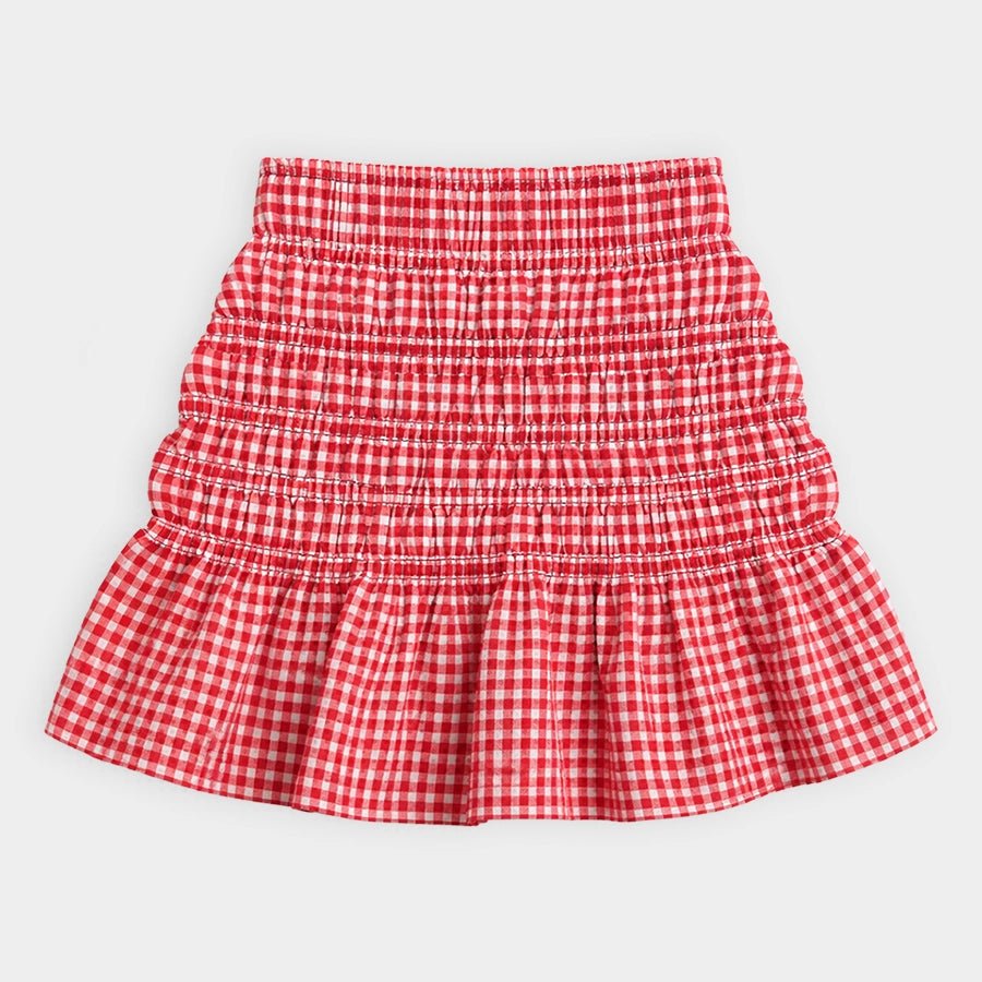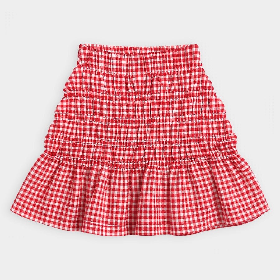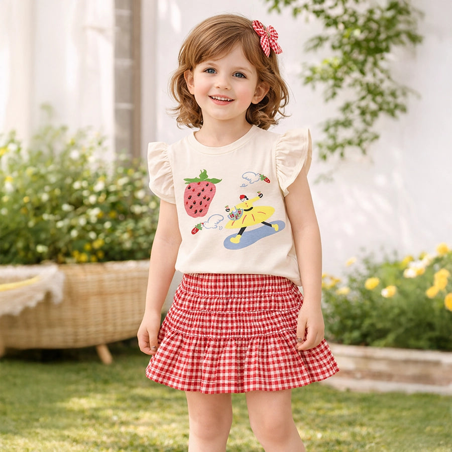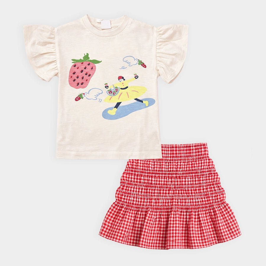 Clothing set for girls with a 100% cotton t-shirt and skirt in 97% cotton and 3% elastane blend for the summer season. Includes a t-shirt with cap sleeves, and printed and embroidered designs. Stretchable skirt with a concealed elasticised waistband and gingham check. Available in different sizes for kids 12M-6Y.