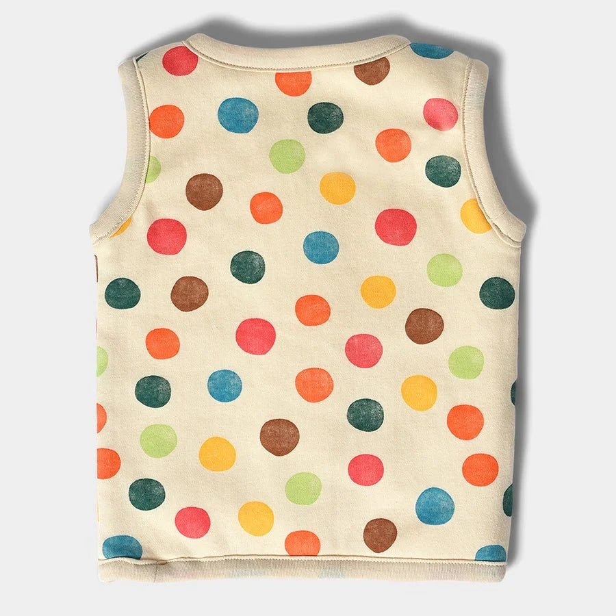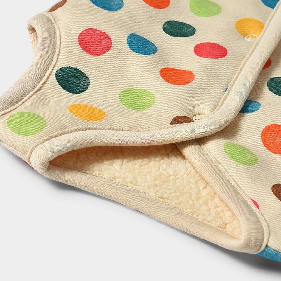 Sleeveless jacket in a blend of 80% cotton and 20% polyester with printed polka dots on one side and a solid-colored reversible side. Reversible and perfect for the cold weather, it comes with front-open snap buttons. Available in different sizes for kids 0-24M.