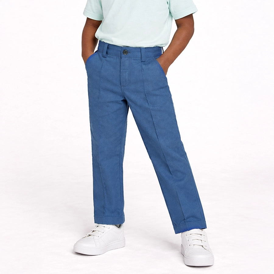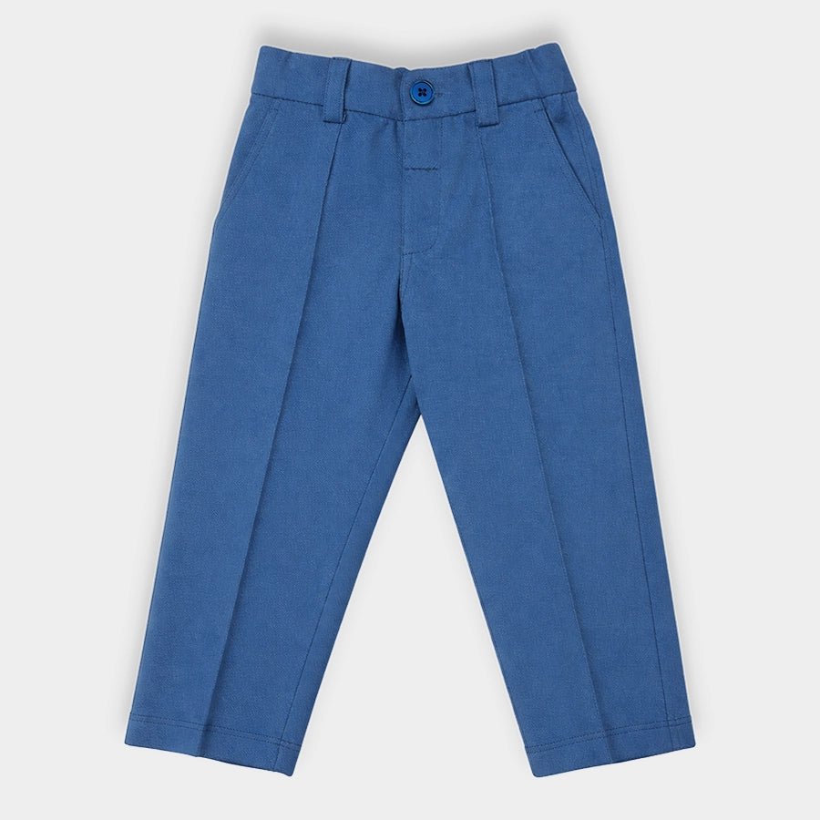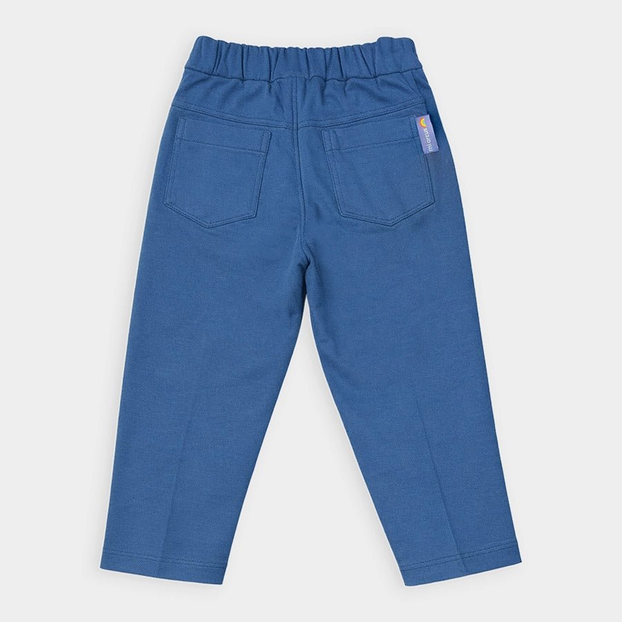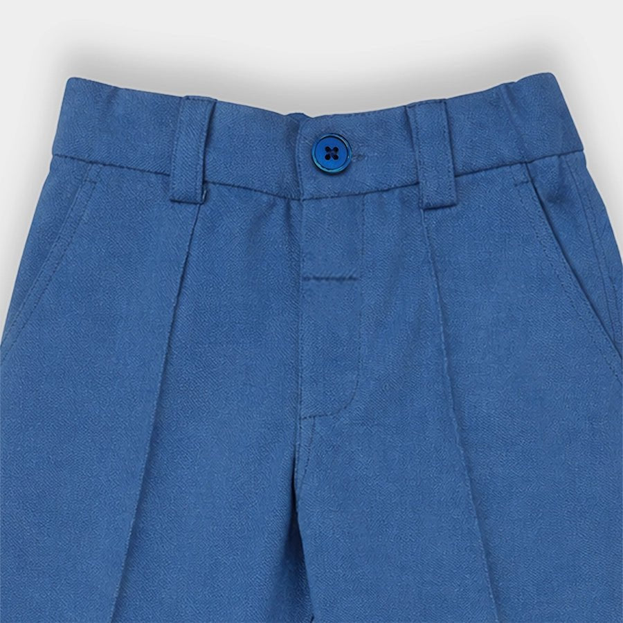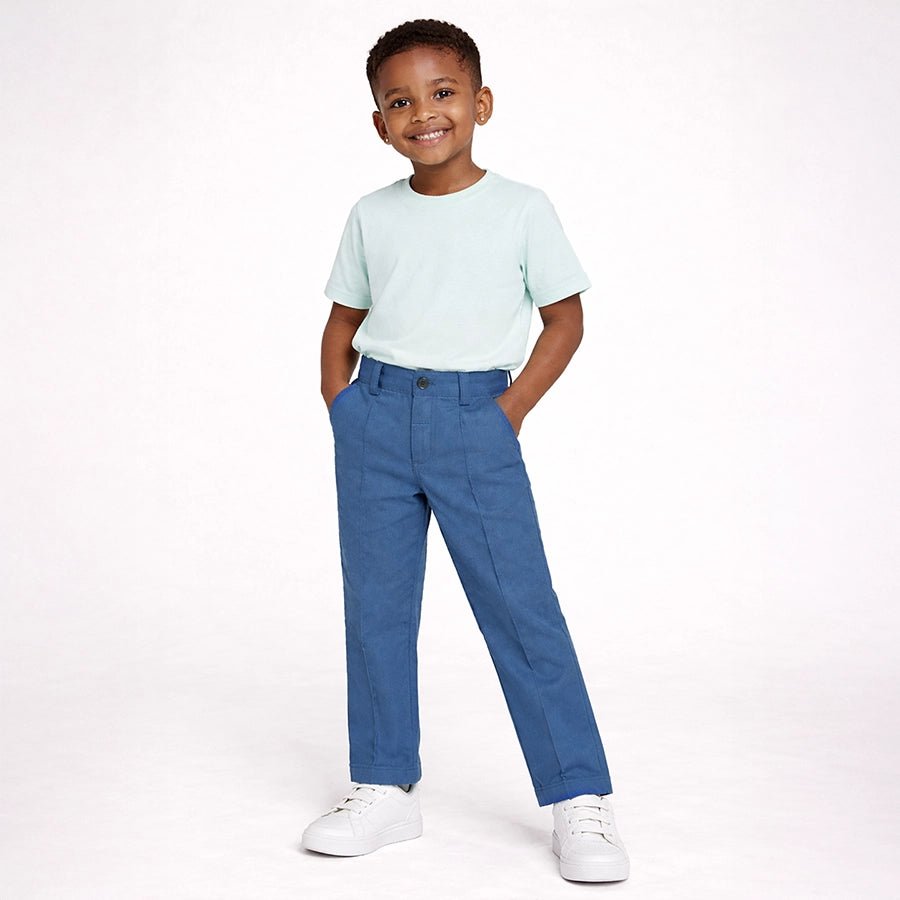 Trousers for boys in soft knit 95% cotton and 5% elastane blend for the summer season. Features a concealed elasticised waistband at the back, button opening and fly at the front, belt loops, and side and back pockets. Available in different sizes for kids 12M-6Y.