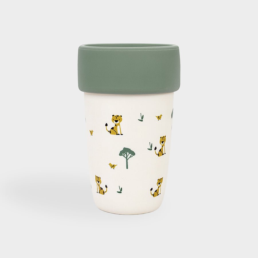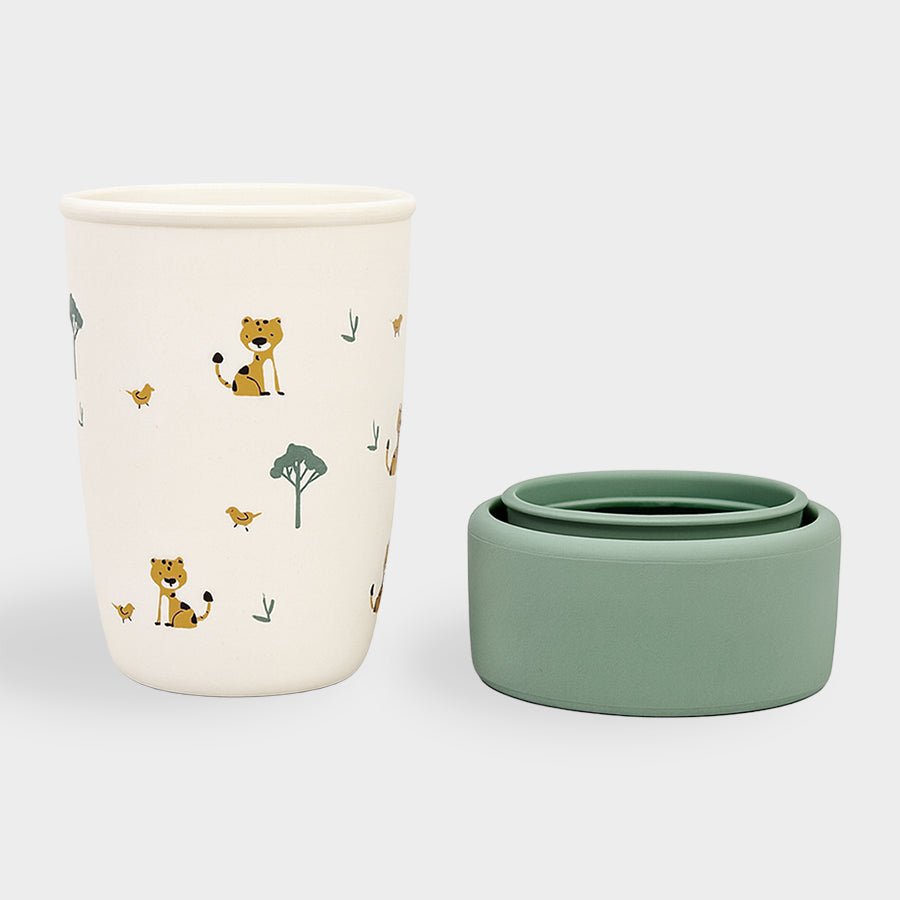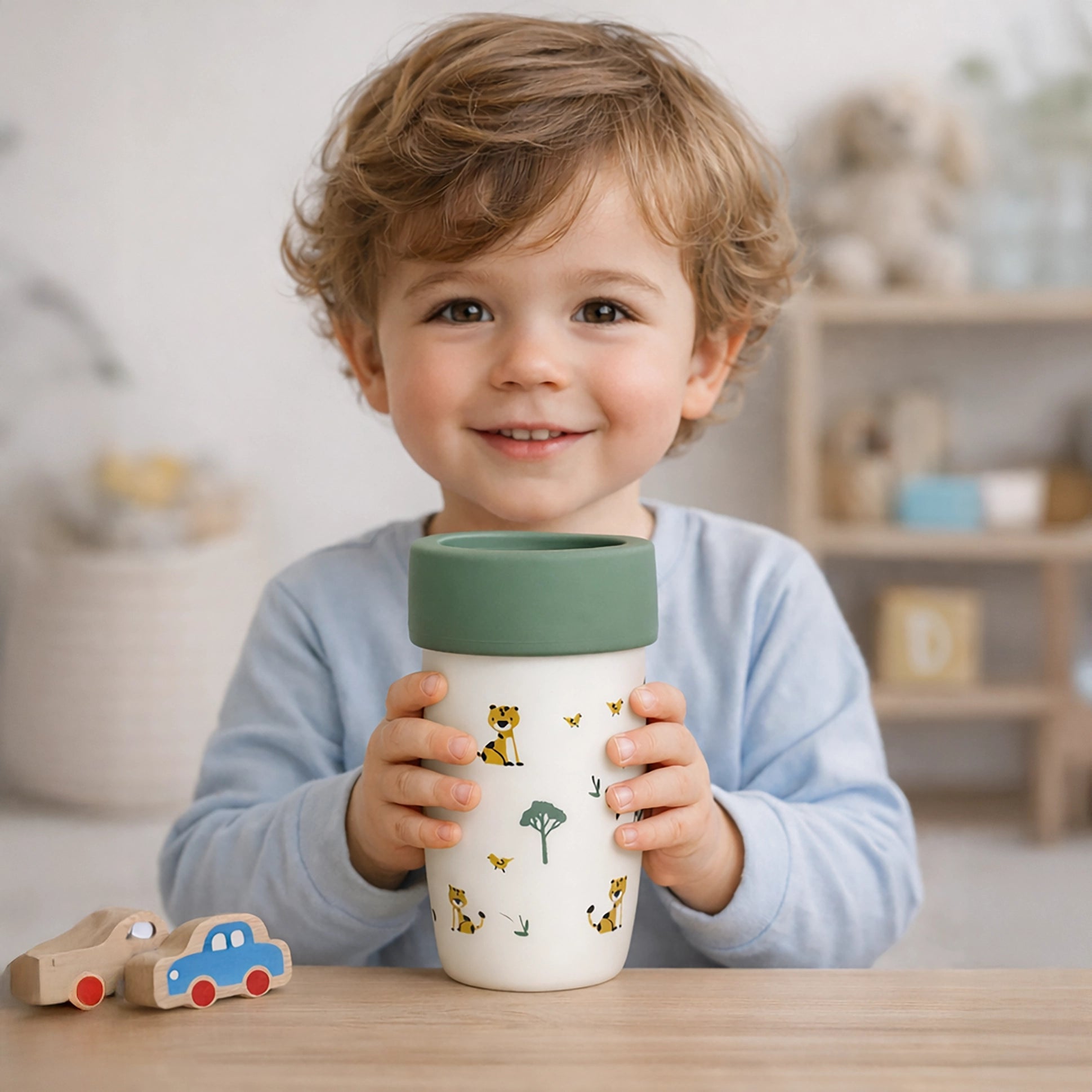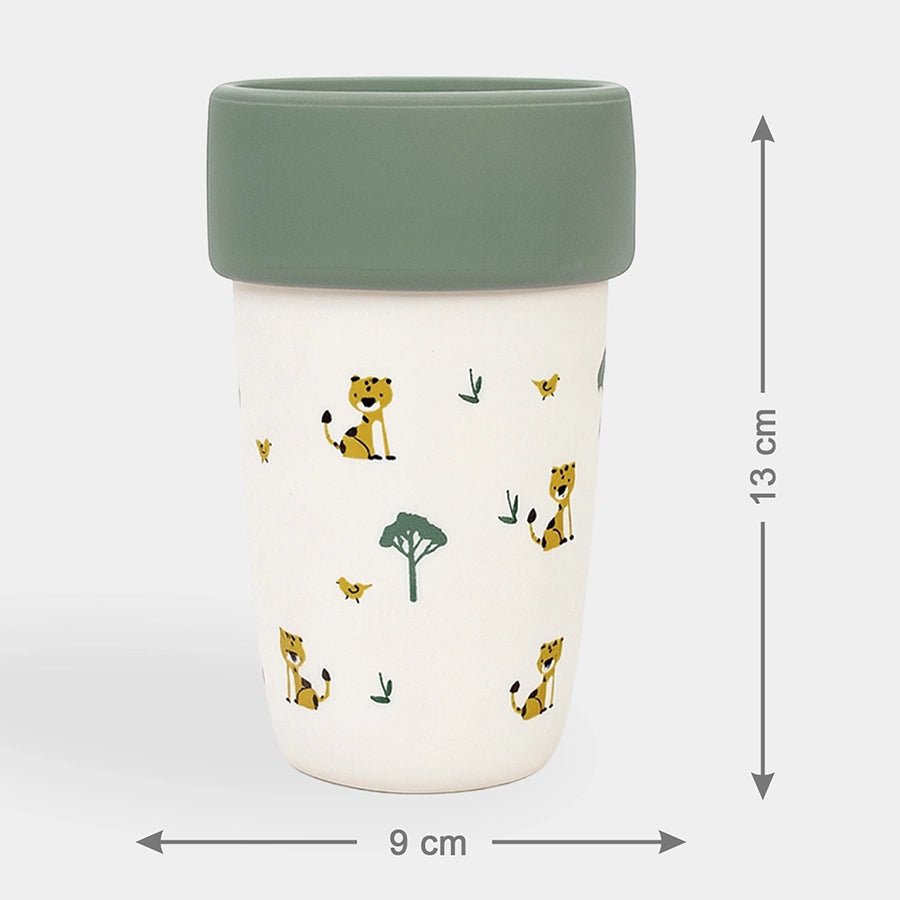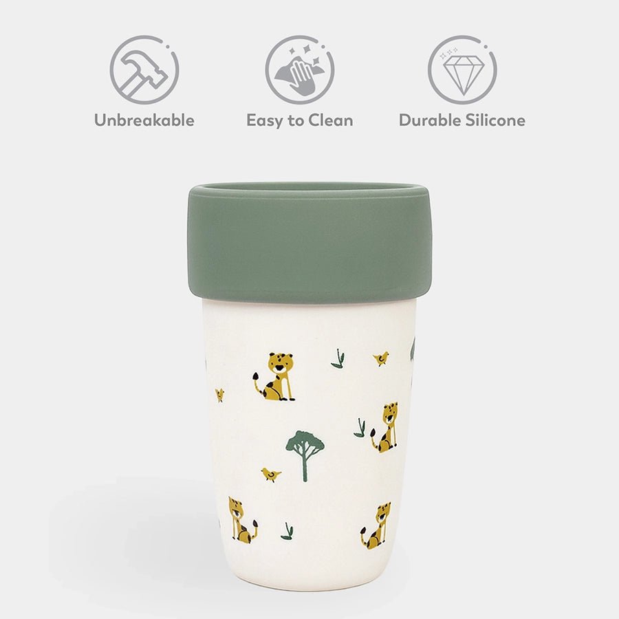 Durable sipper cup for kids in food-grade 100% silicone. Comes with all-over prints and an integrated 360° lid featuring an air suction design. Simply push in for sipping and pull out for leak-proof carrying and storage. Easy to grip for small hands and suitable for everyday use. Best for kids 6M–4Y. Size: LxW: 13x9 cm, Circumference:13.5cm, Capacity: 240ml
