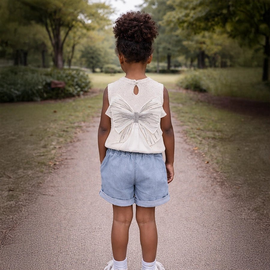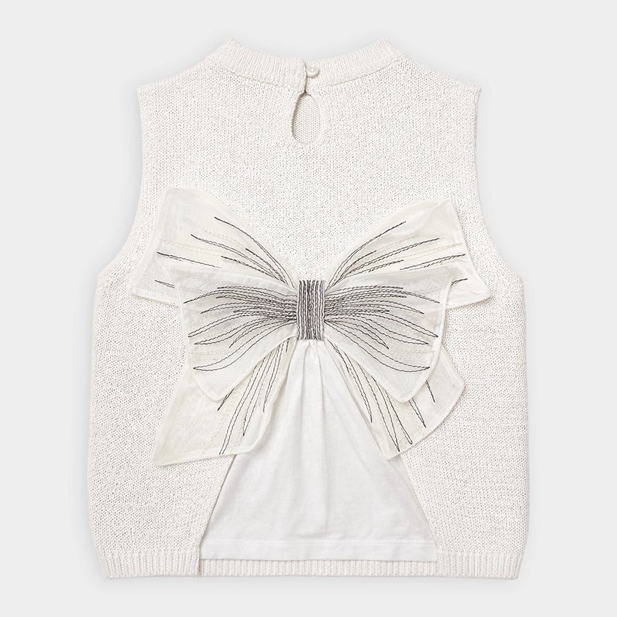Crochet top for girls in soft knit 54% cotton, 18% viscose, 18% nylon, and 10% polyester blend for the summer season. Features crochet knit designs at the front, and a keyhole button loop and an attached decorative bow at the back. Available in different sizes for kids 2-6Y.