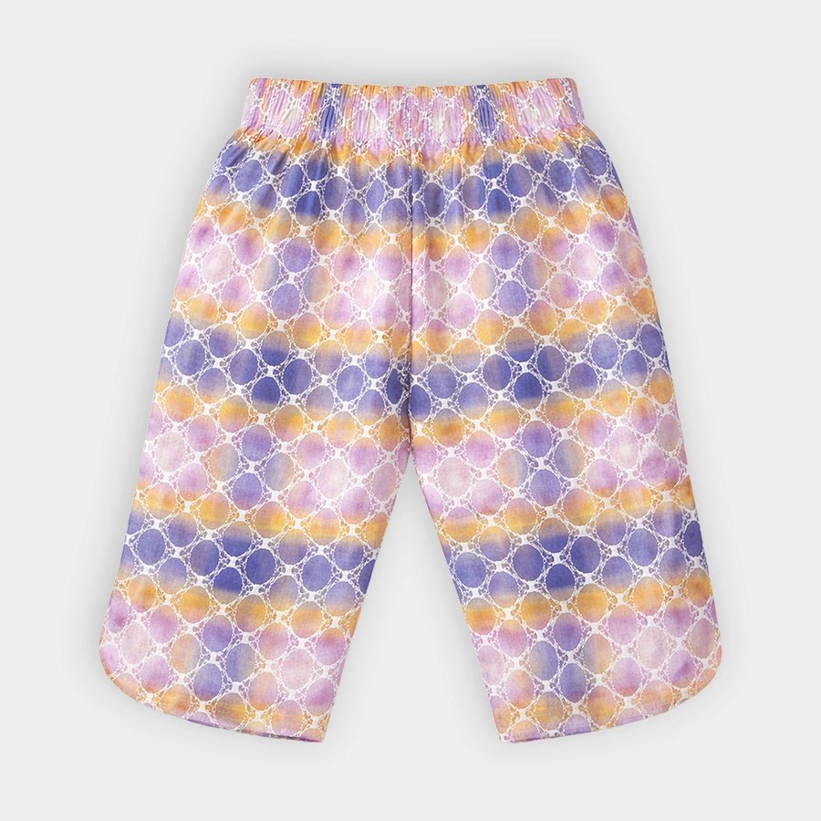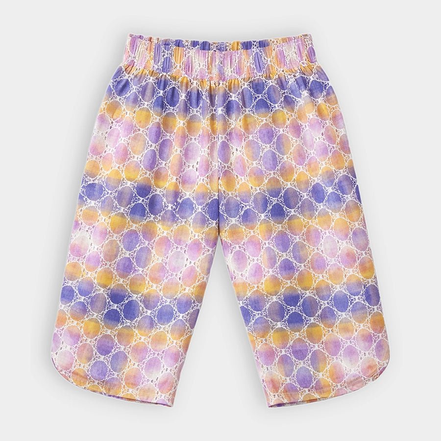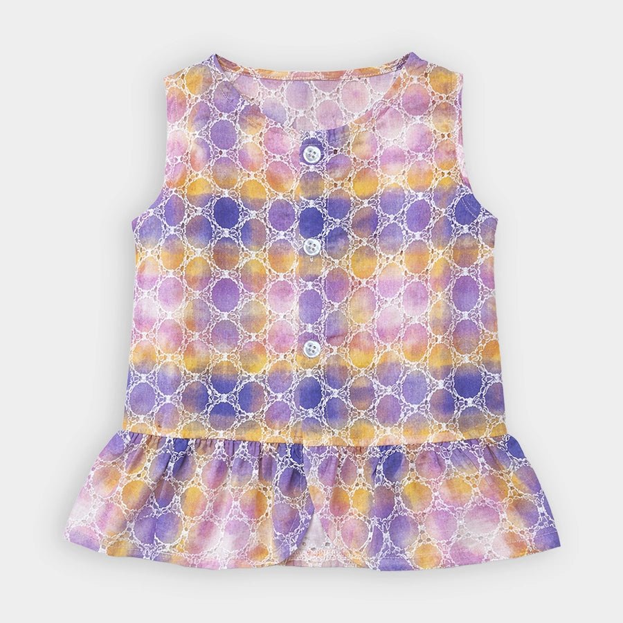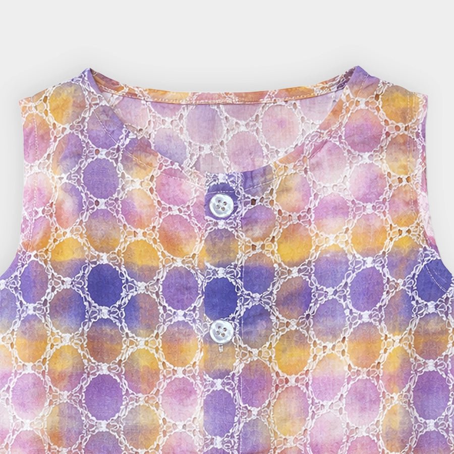 Top and pyjama set for girls in soft knit 67% cotton, 28% viscose, and 5% lycocell blend for the summer season. Features sleeveless top with front-open buttons, ombre, and schiffli design. Matching pyjamas with a concealed elasticised waistband. Available in different sizes for kids 12M-6Y.