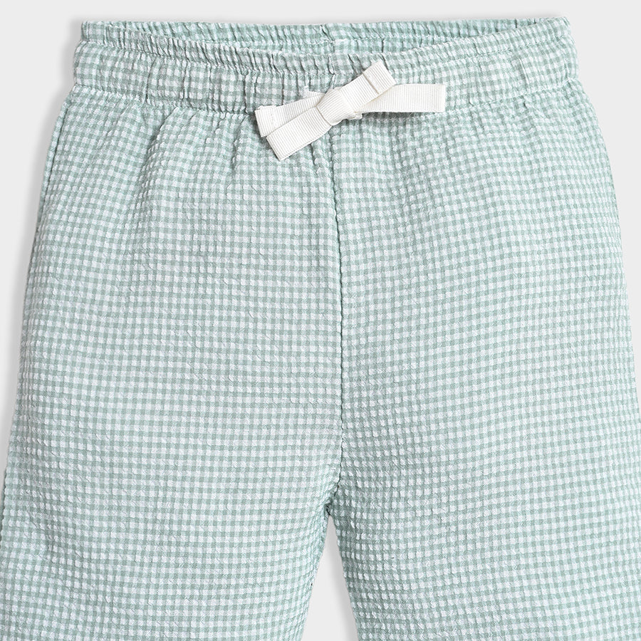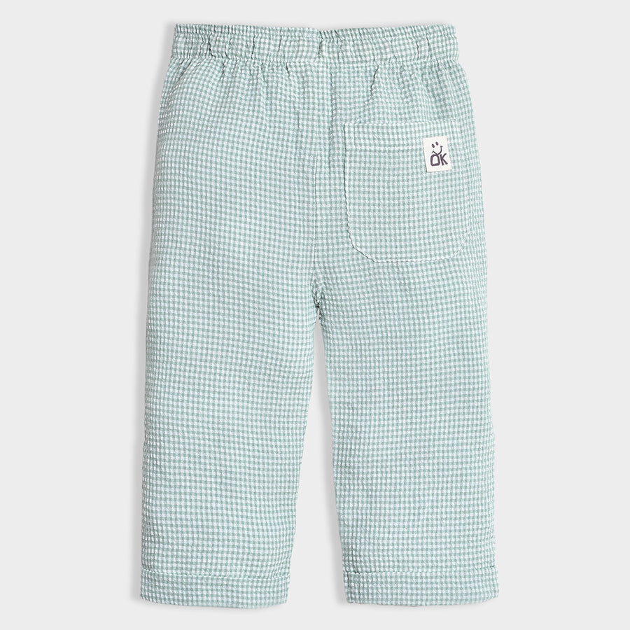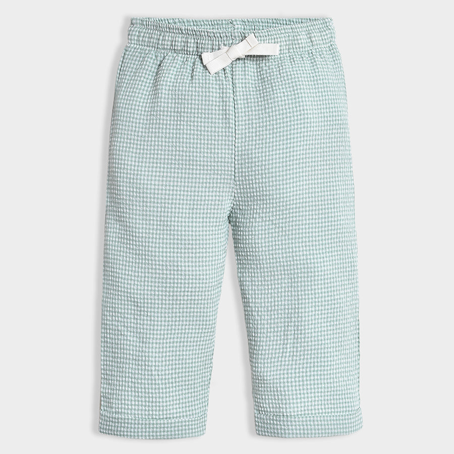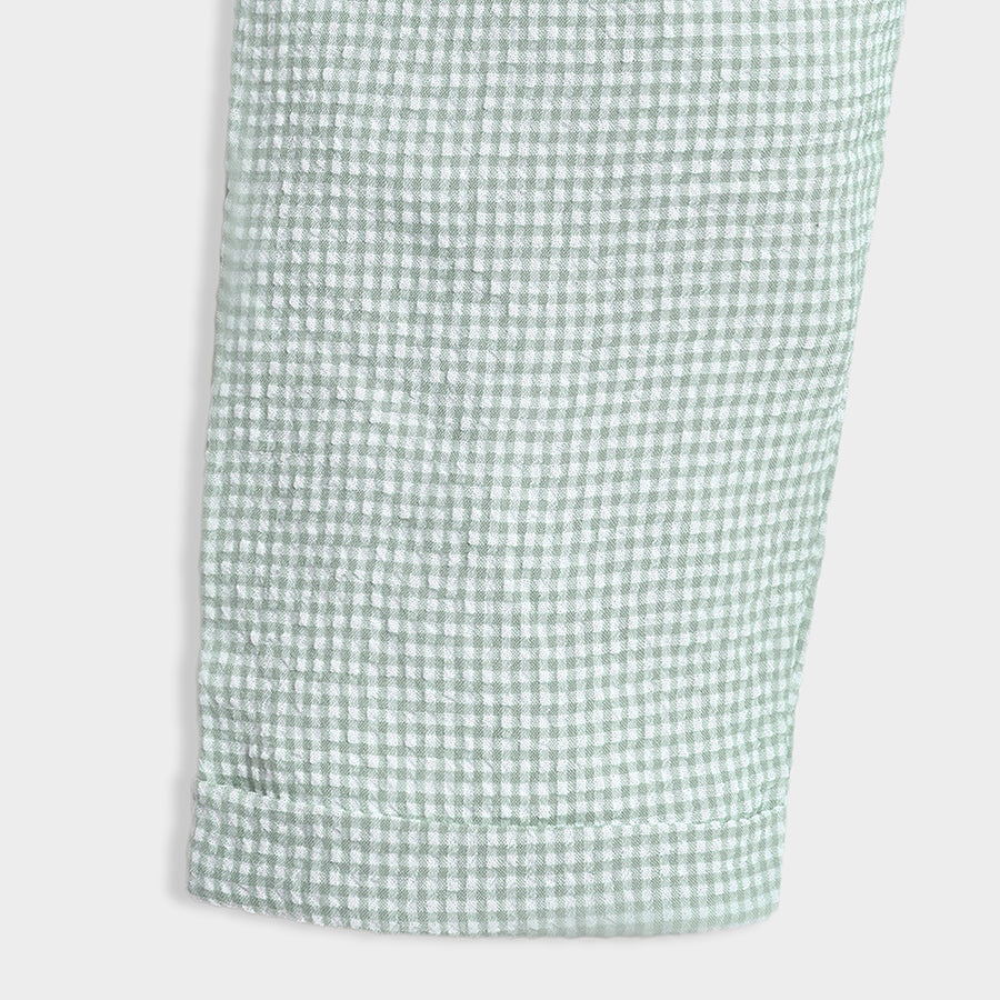 Joggers for boys woven in soft 80% viscose and 20% cotton blend for the summer season. Features a concealed elasticised waistband, check pattern, and a sewn-in turn-up at the leg opening. Available in different sizes for kids 0-24M.