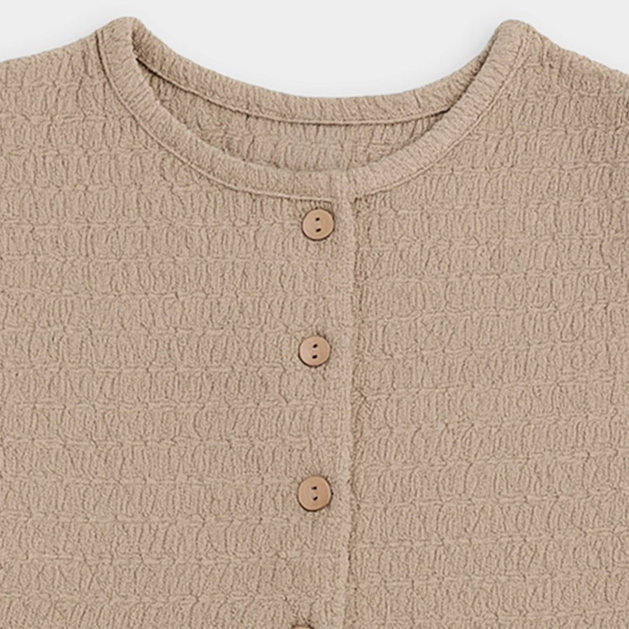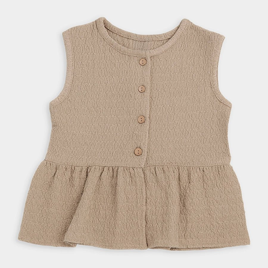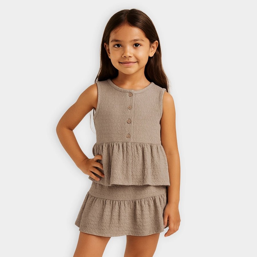 Top and skirt set for girls woven in soft 98% polyester and 2% spandex blend for the summer season. Features a sleeveless top with a round neckline, wood-look button opening down the front, and a flared bottom. Matching skirt with a concealed elasticised waistband. Available in different sizes for kids 12M-6Y.