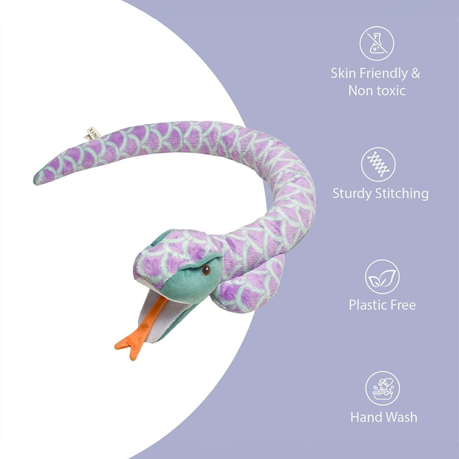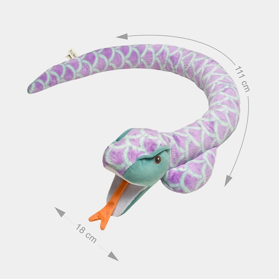 Bring a twist of adventure to your little ones' playtime with Onyx, the snake soft toy. Carefully made from soft and non-toxic polyester fabric with no plastic use, the lightweight and baby-safe snake soft toy is designed to spark curiosity and imagination with its long, slinky form, lifelike details, and expressive eyes and invites fun-filled storytelling and exciting pretend-play moments. Best suitable for infants and toddlers. Size: 111x18 cm
