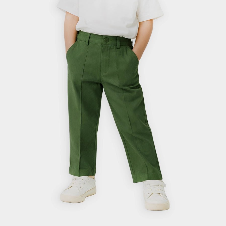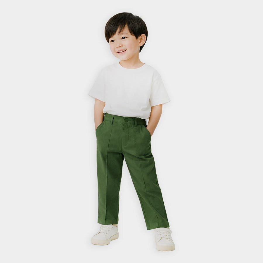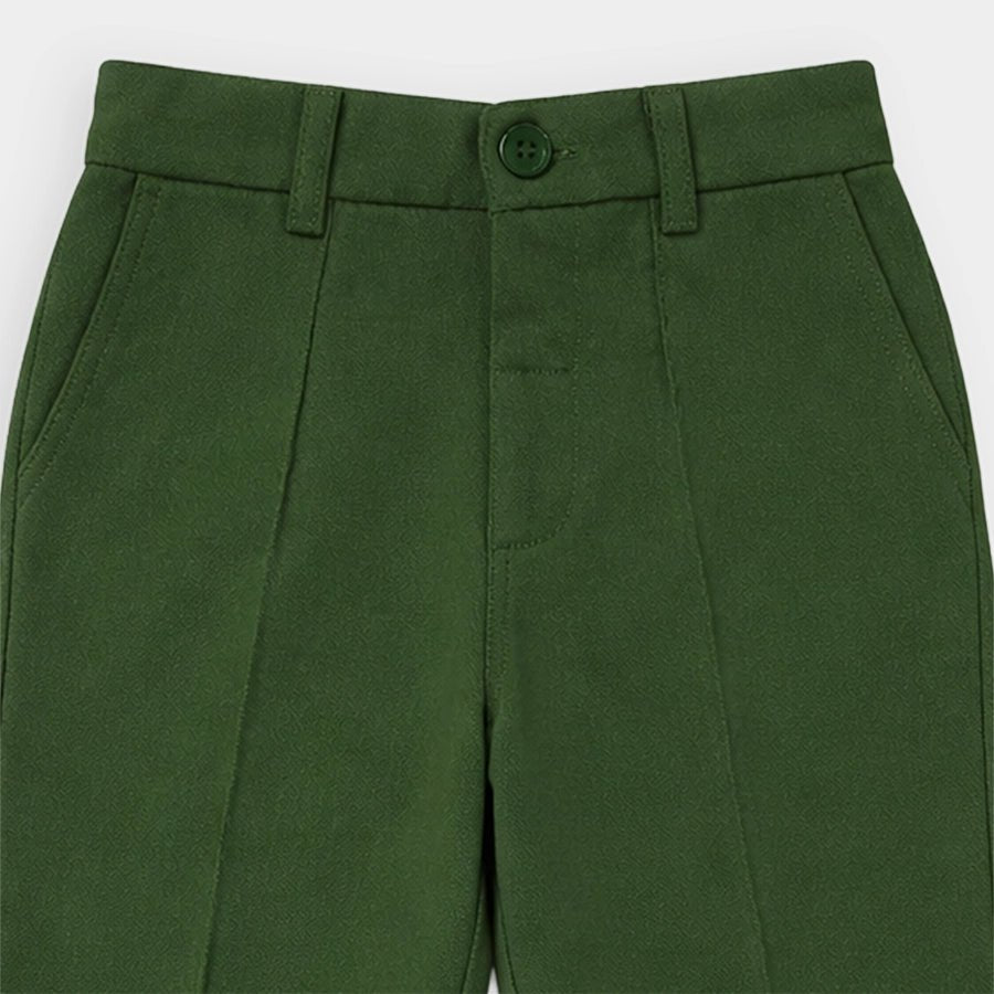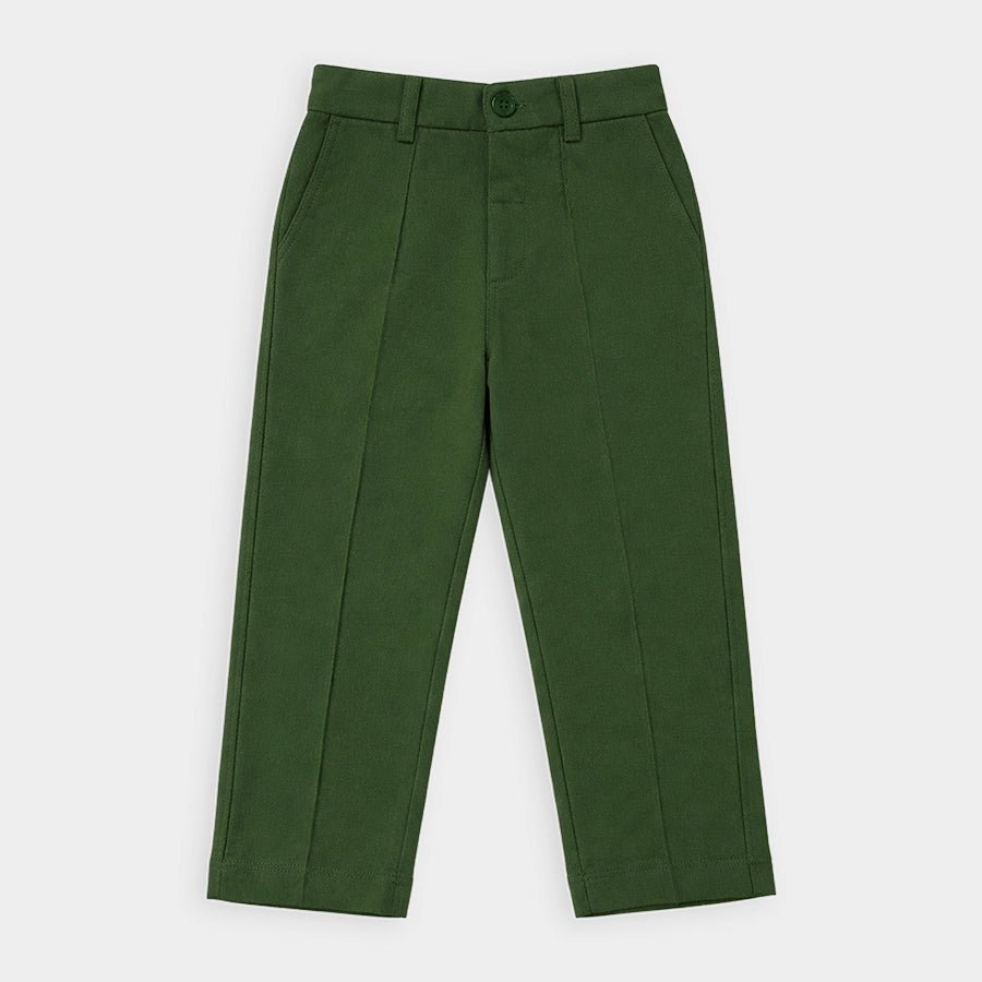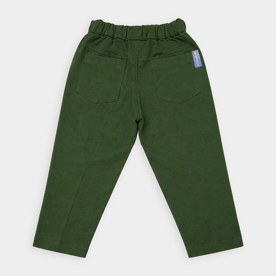 Trousers for boys in soft knit 95% cotton and 5% elastane blend for the summer season. Features a concealed elasticised waistband at the back, button opening and fly at the front, belt loops, and side and back pockets. Available in different sizes for kids 12M-6Y.