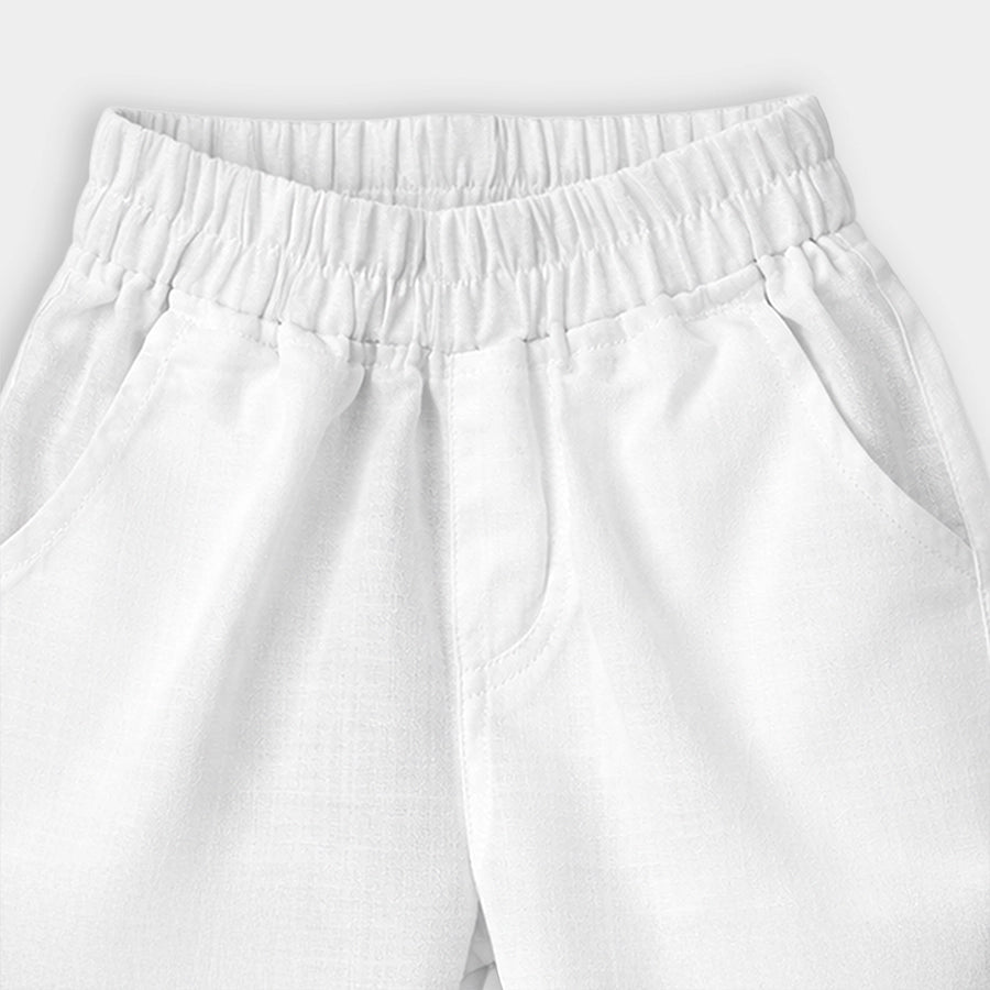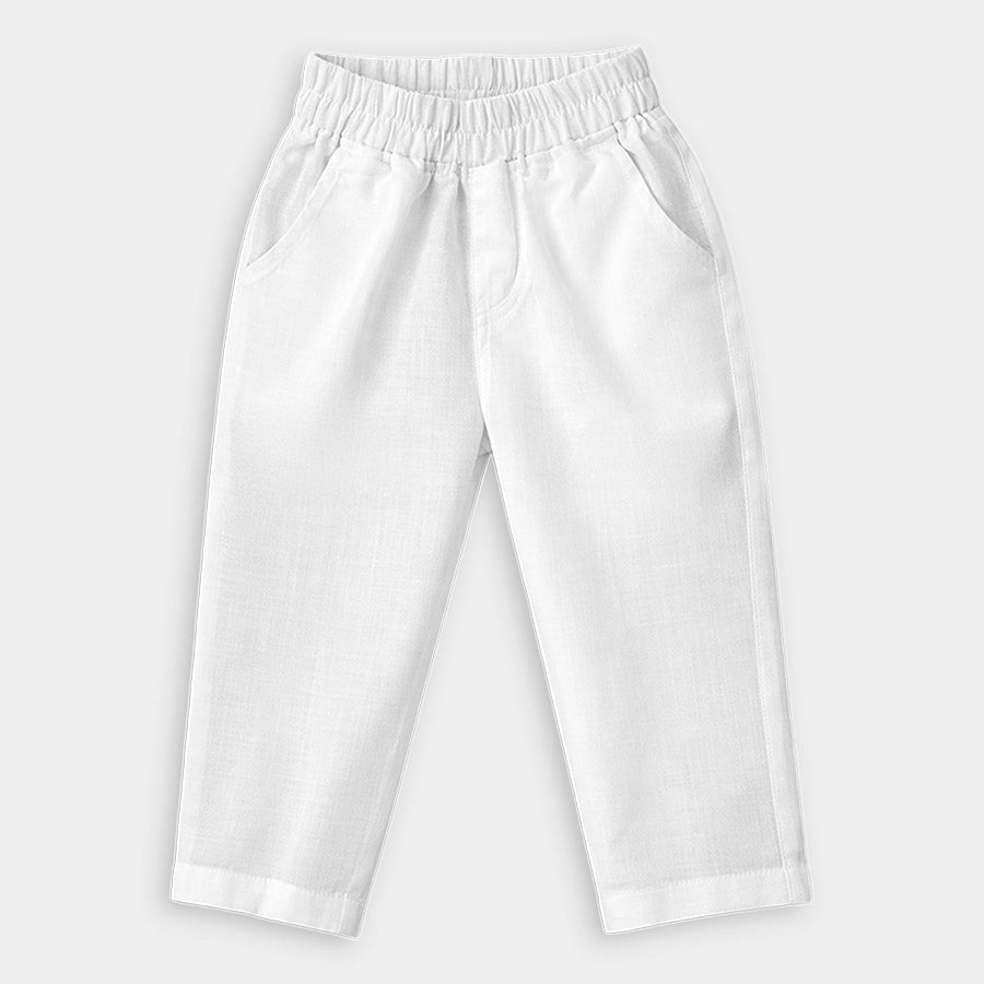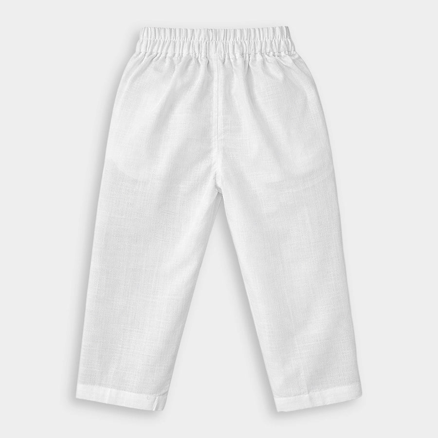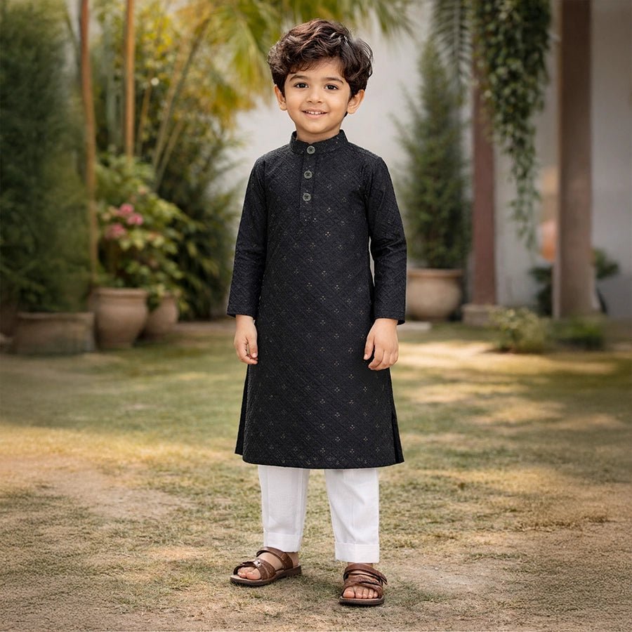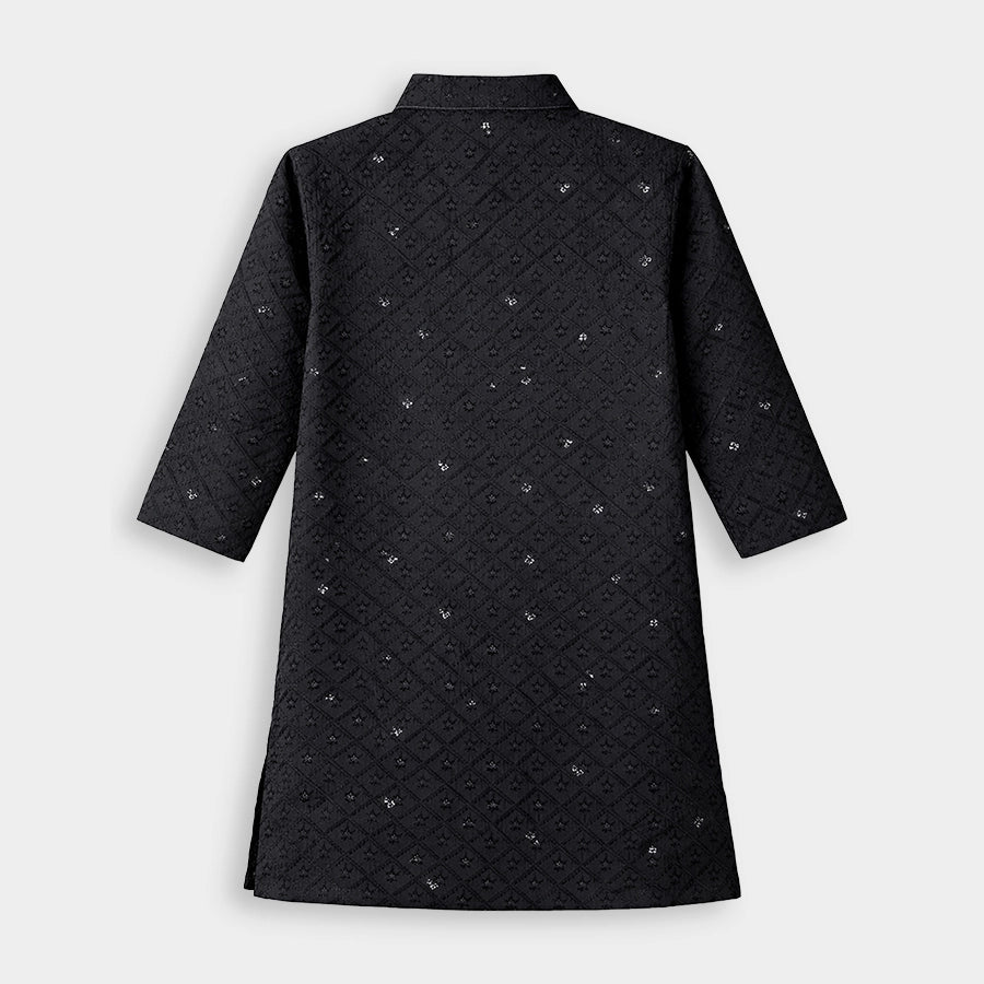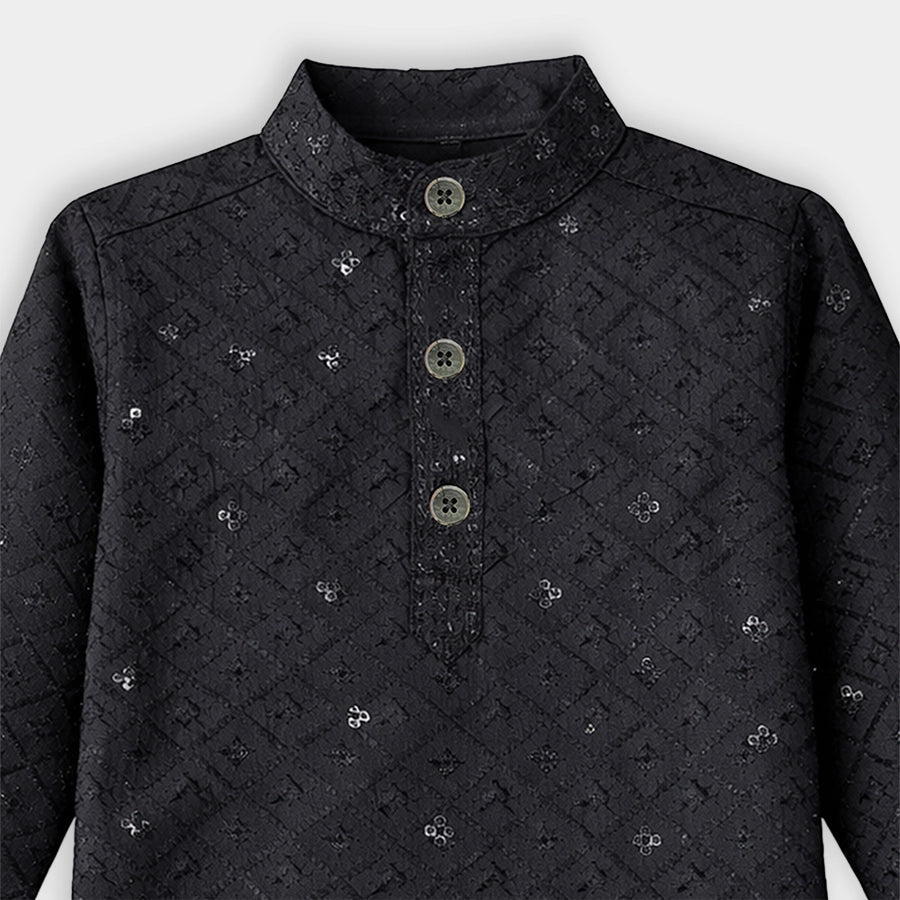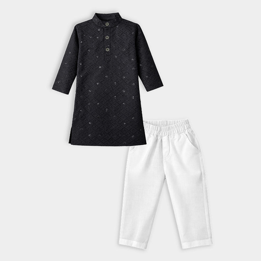 Ethnic set for boys woven in soft 64% cotton, and 36% polyester blend for all-weather wear. Features a full-sleeve kurta with embroidered and sequin detailing, and a 3-button placket. Solid pyjamas with a concealed elasticised waistband and side pockets. Available in different sizes for kids 12M-6Y.