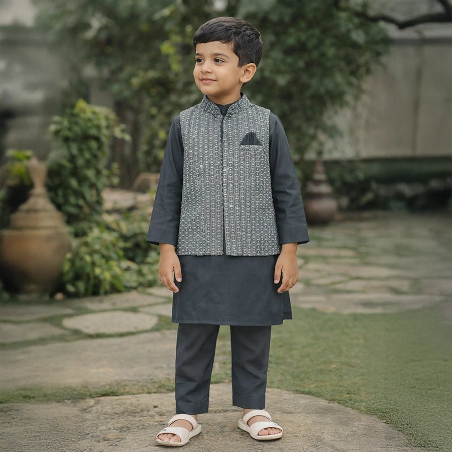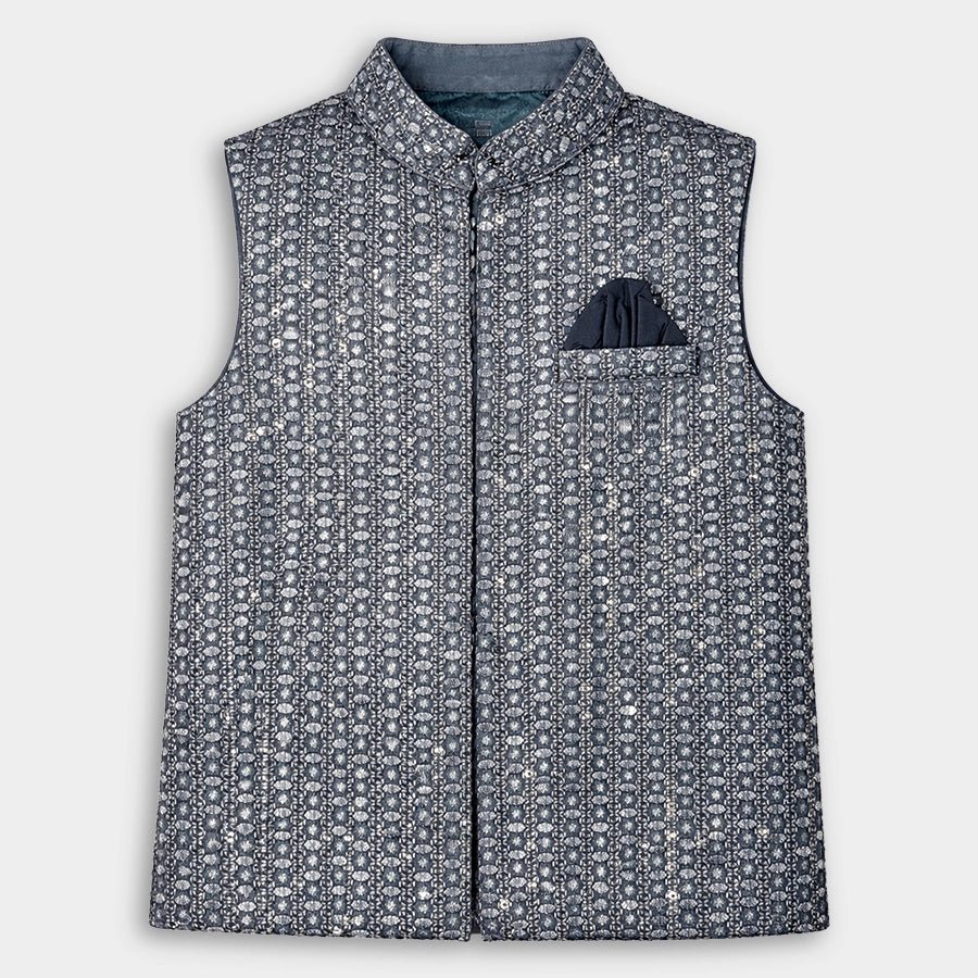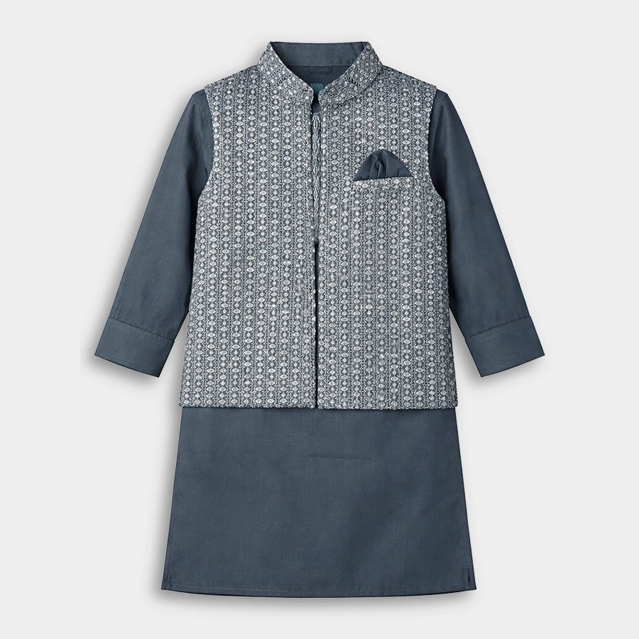 Ethnic set for boys woven in soft 60% viscose and 40% polyester for all-weather wear. Includes a solid kurta with buttoned full sleeves, embroidered, buttoned placket. Matching solid pyjamas with a concealed elasticised waistband and side pockets. Sleeveless wasket with embroidered, sequin designs and attached solid pocket square. Available in different sizes for kids 12M-6Y.