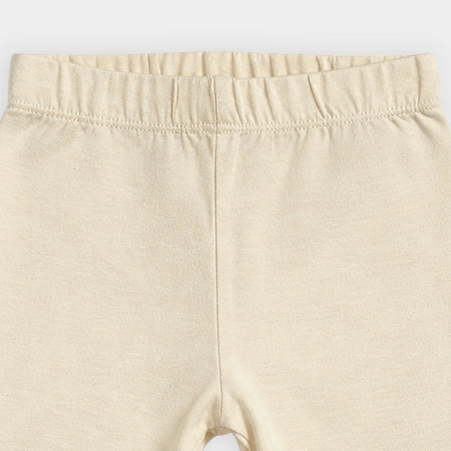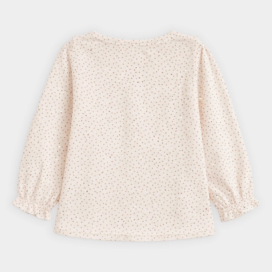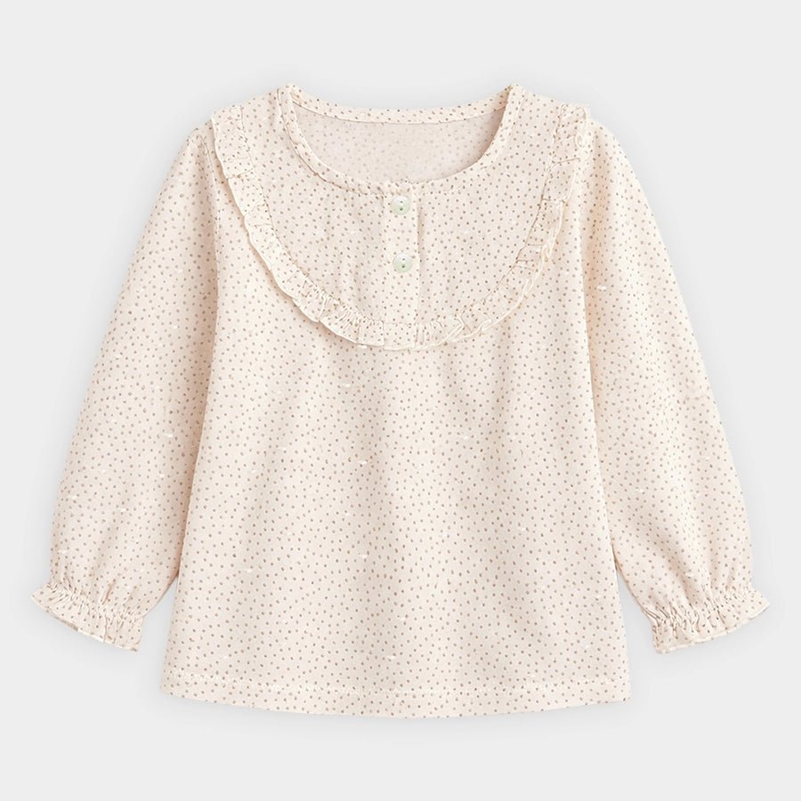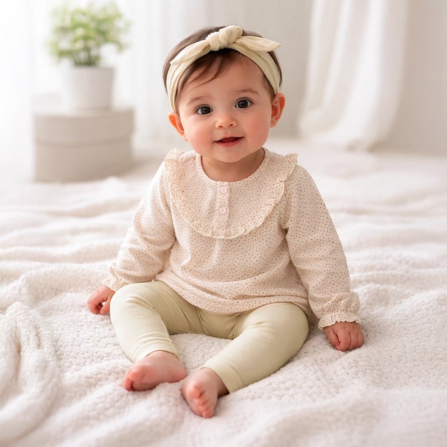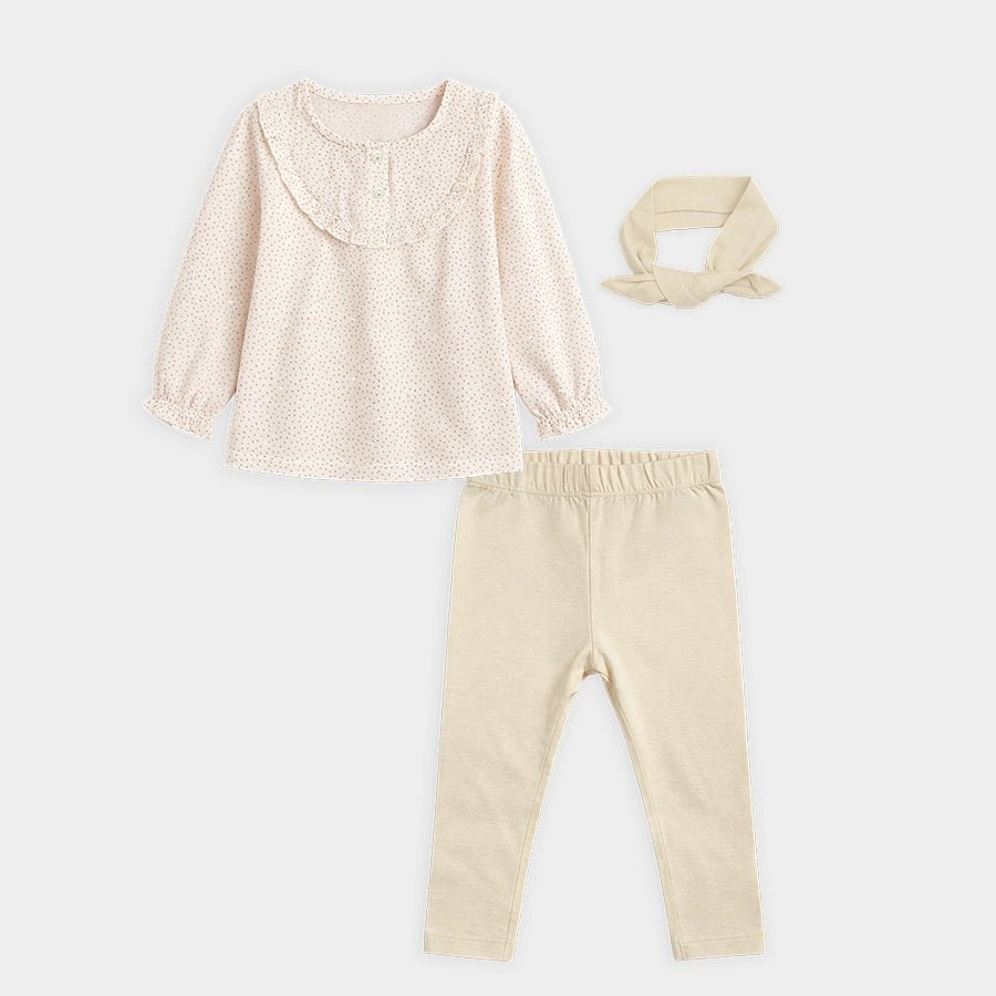 Clothing set for girls in soft knit 95% cotton and 5% elastane blend for the summer season. Features top with polka-dot prints, full sleeves with elasticised cuffs, 2-button placket, and frill detailing at the chest centre, solid leggings with a concealed elasticised waistband, matching headband with a bow-knot on top. Available in different sizes for kids 0-24M.