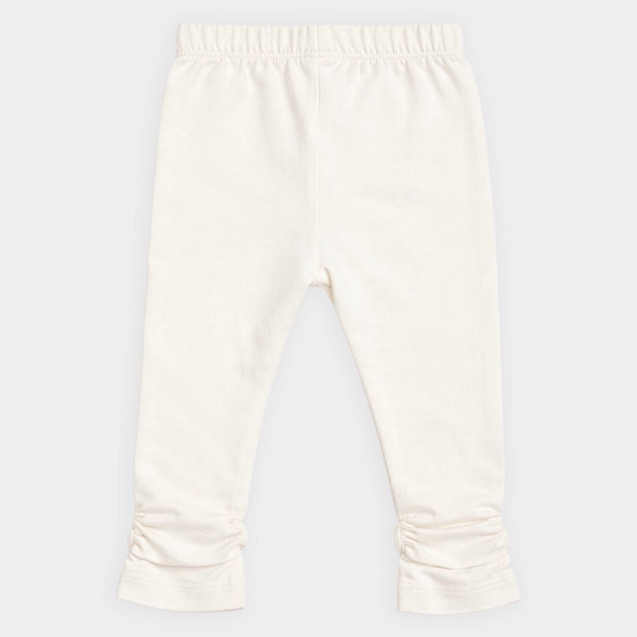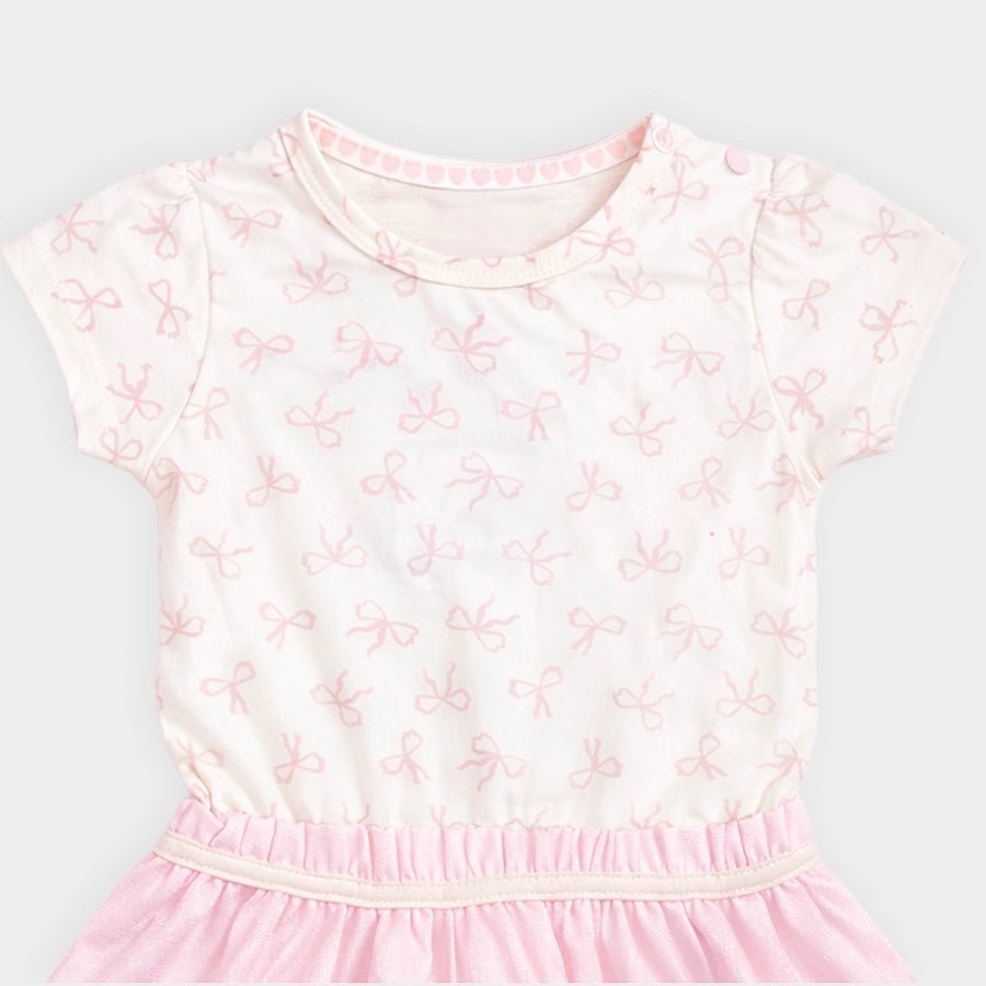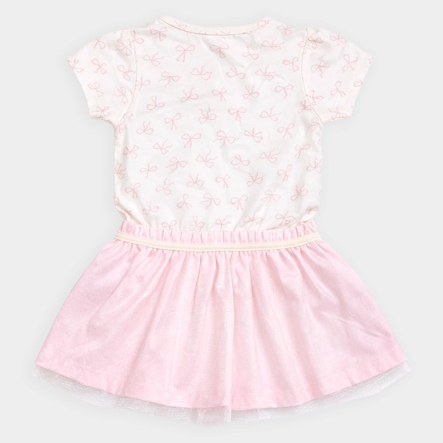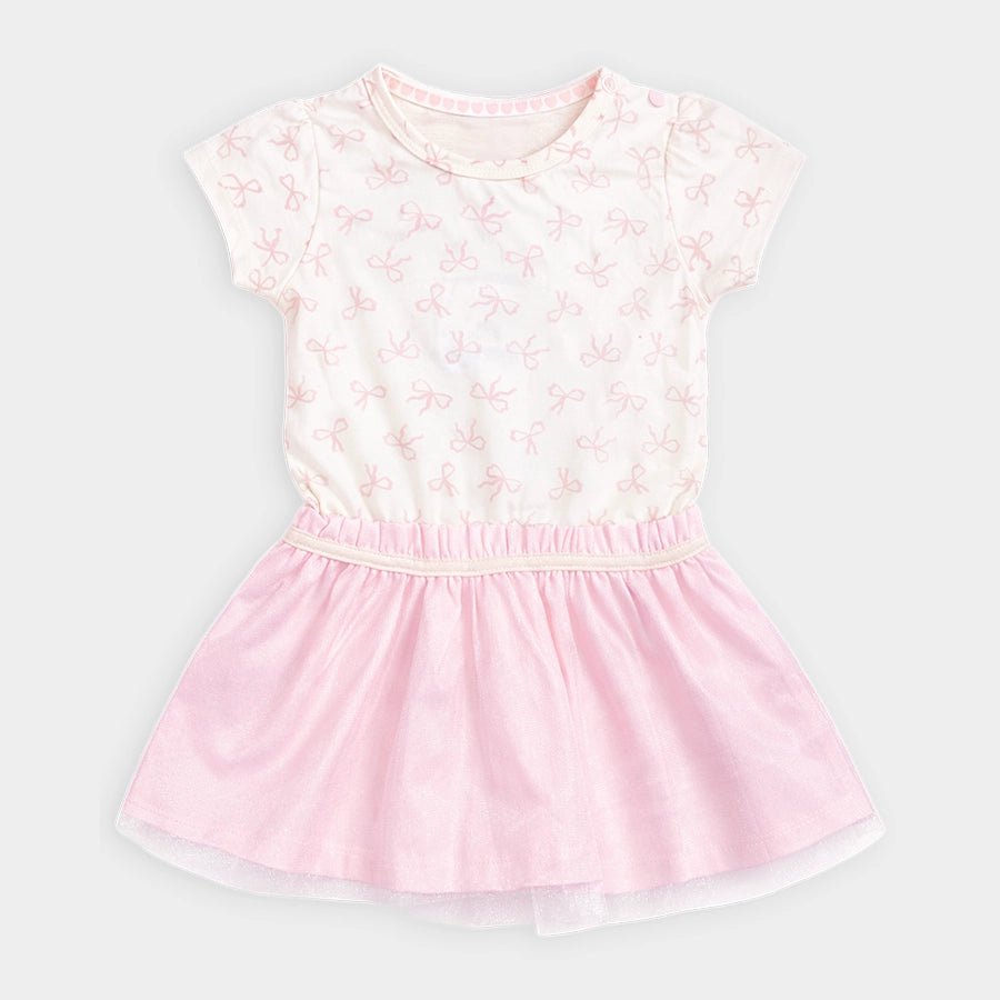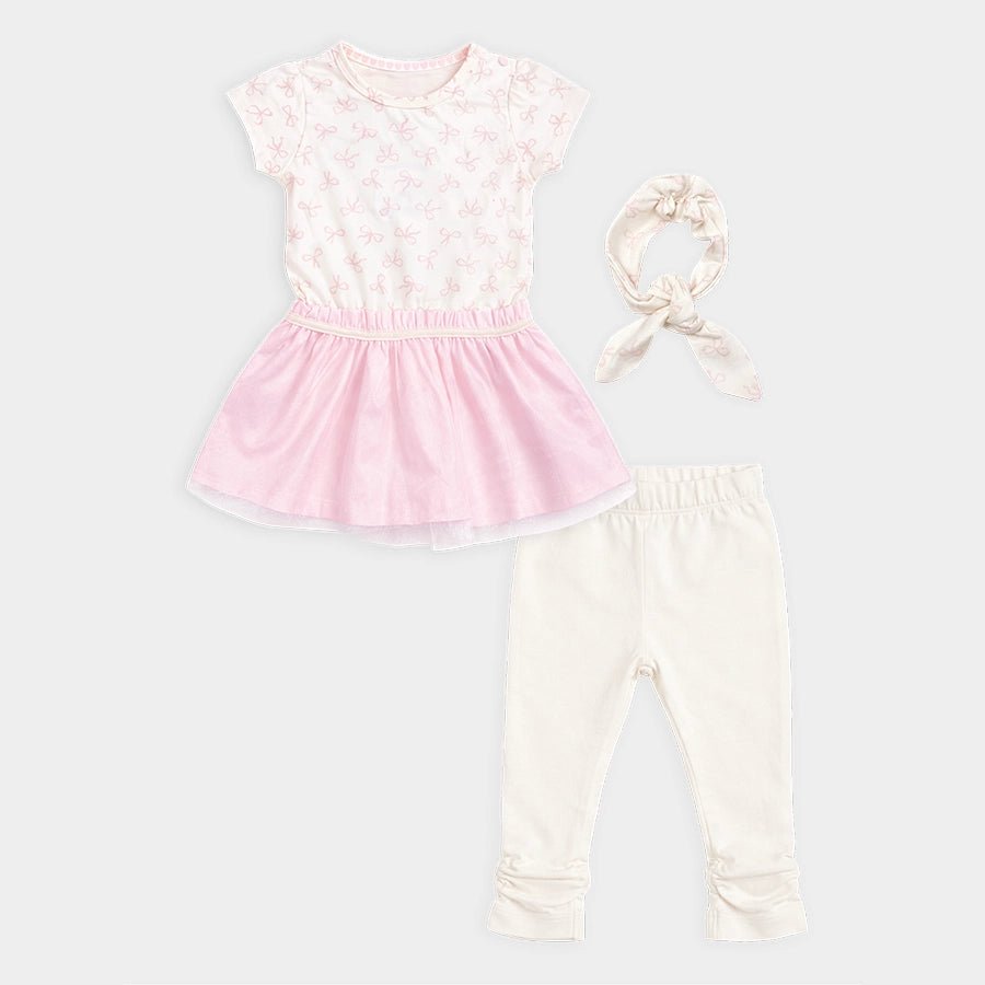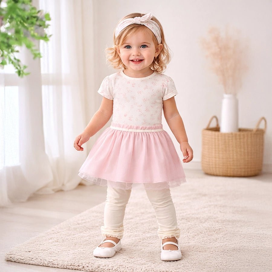 Clothing set for girls in soft knit 95% cotton and 5% elastane blend for the summer season. Features frock with half sleeves, shoulder snap button (in sizes 0-18M), printed designs, attached skirt with a mesh layer outside, and fabric lining. Solid leggings with a concealed elasticised waistband and matching, elasticised, tie-knot headband with printed designs. Available in different sizes for kids 0-24M.