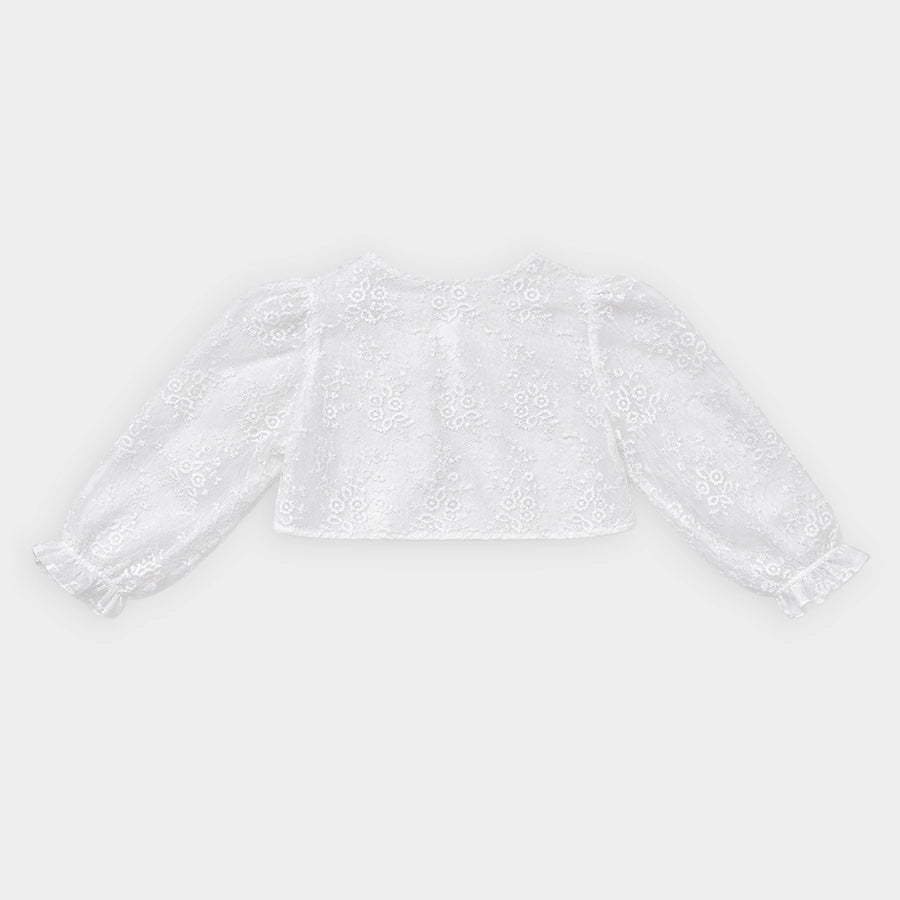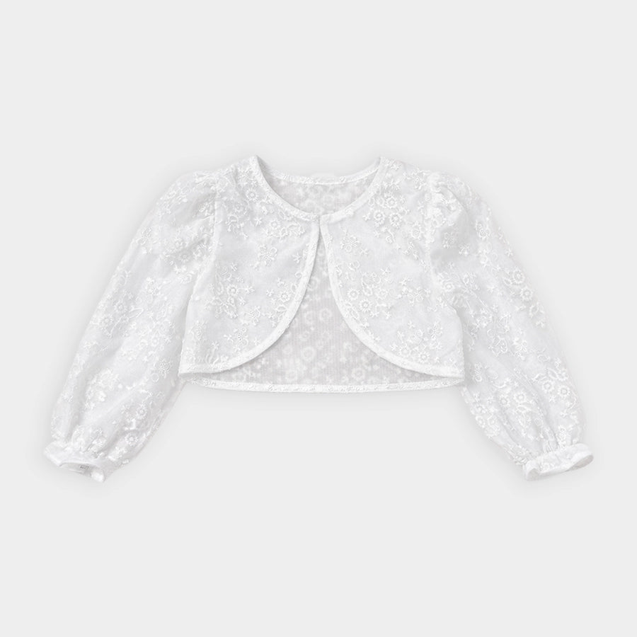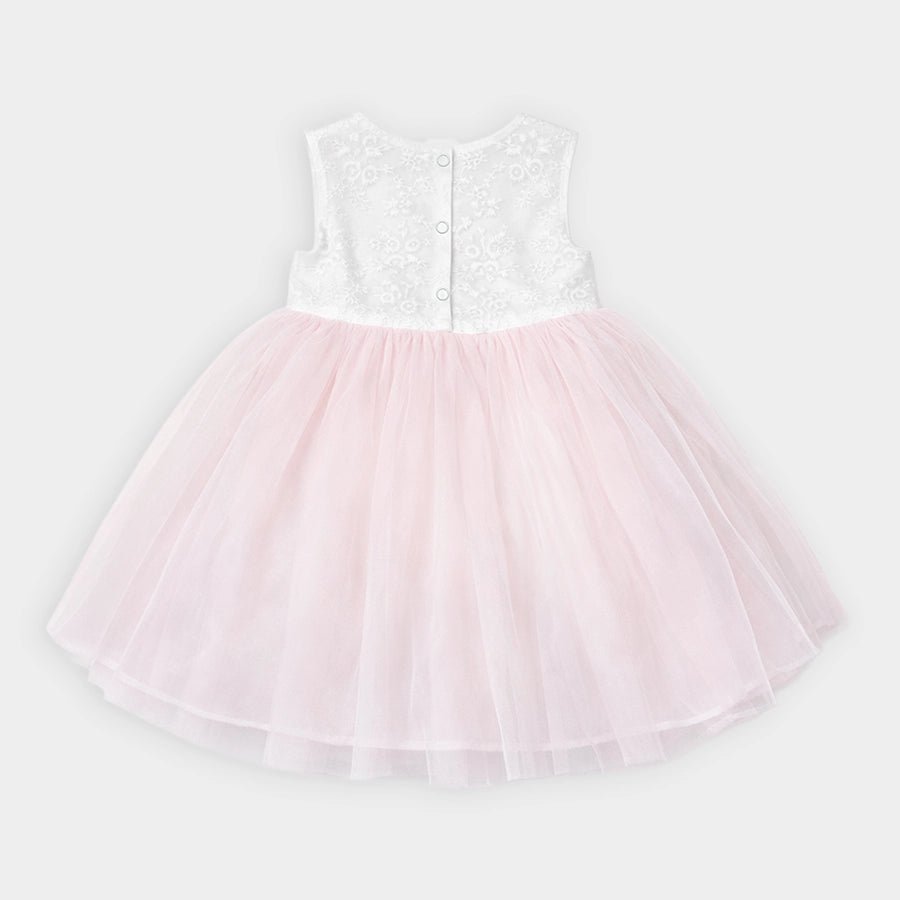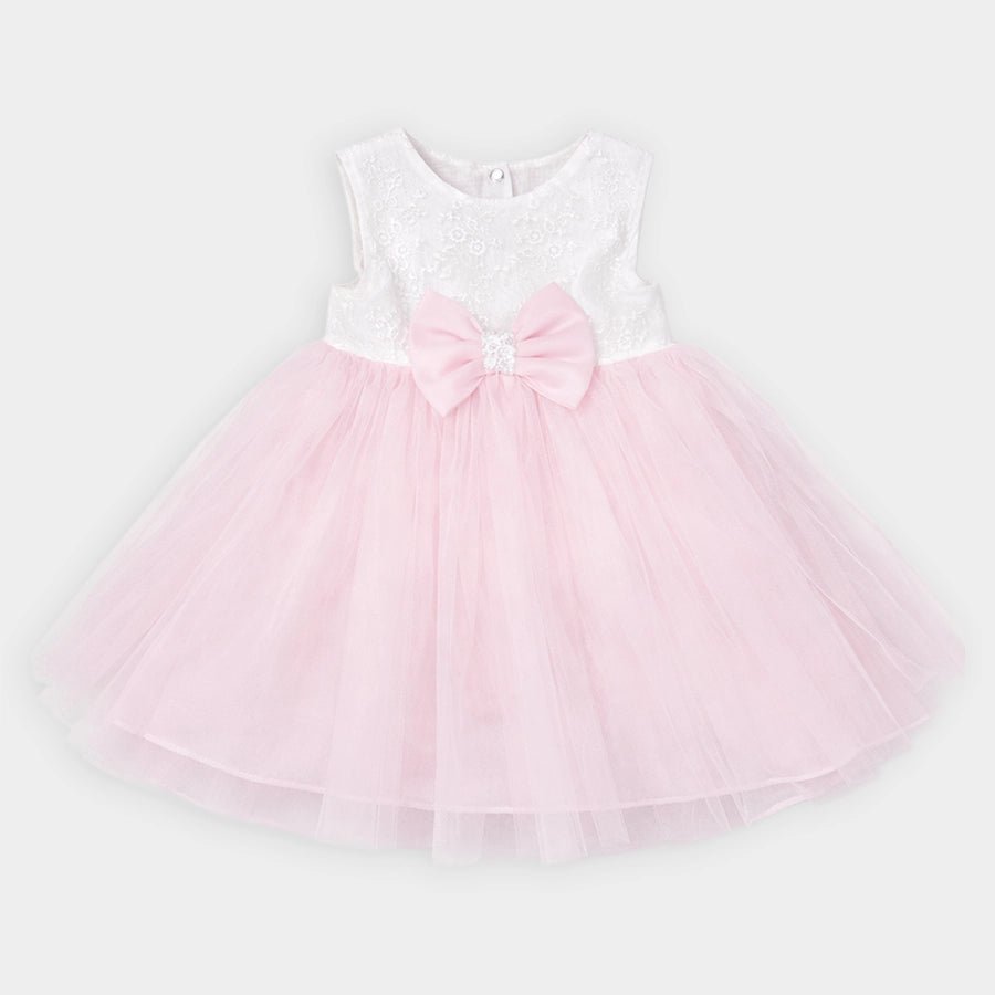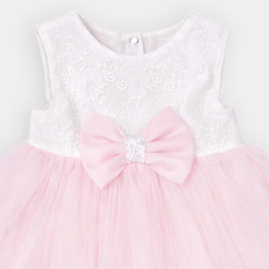 Frock for girls for the summer season with woven lining in 100% cotton and 100% polyester outer. Features an embroidered bodice, decorative bow-knot near the waistline, snap-button placket at the back, and attached 3-layer mesh detailing. Matching full-sleeve shrug with elasticised cuffs, loop button opening at the neckline, and embroidered designs. Available in different sizes for kids 0-12M