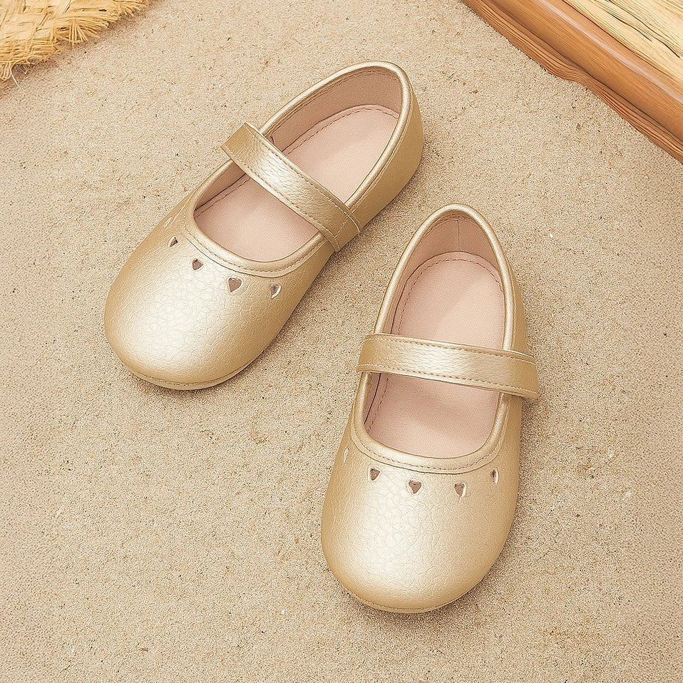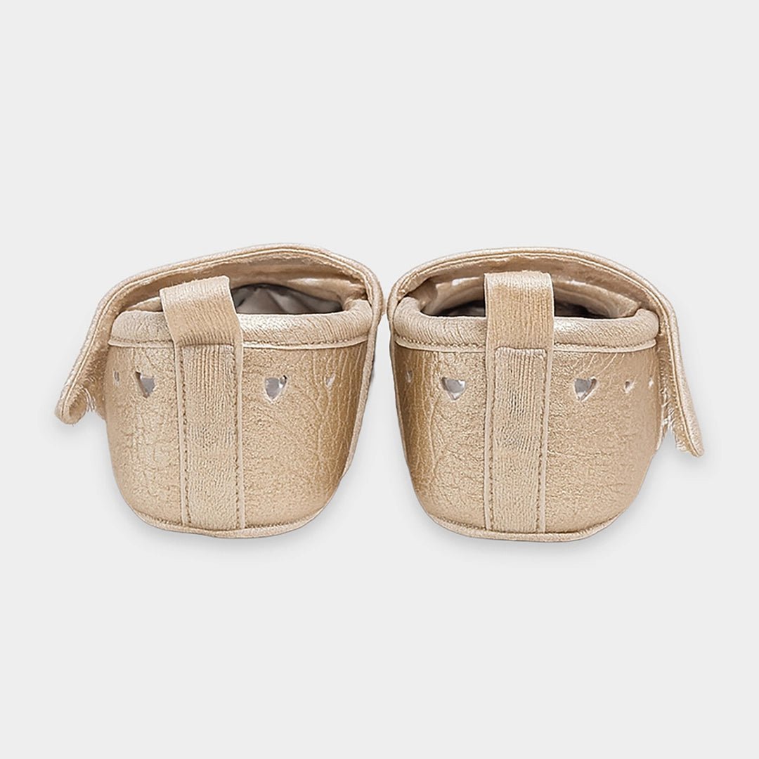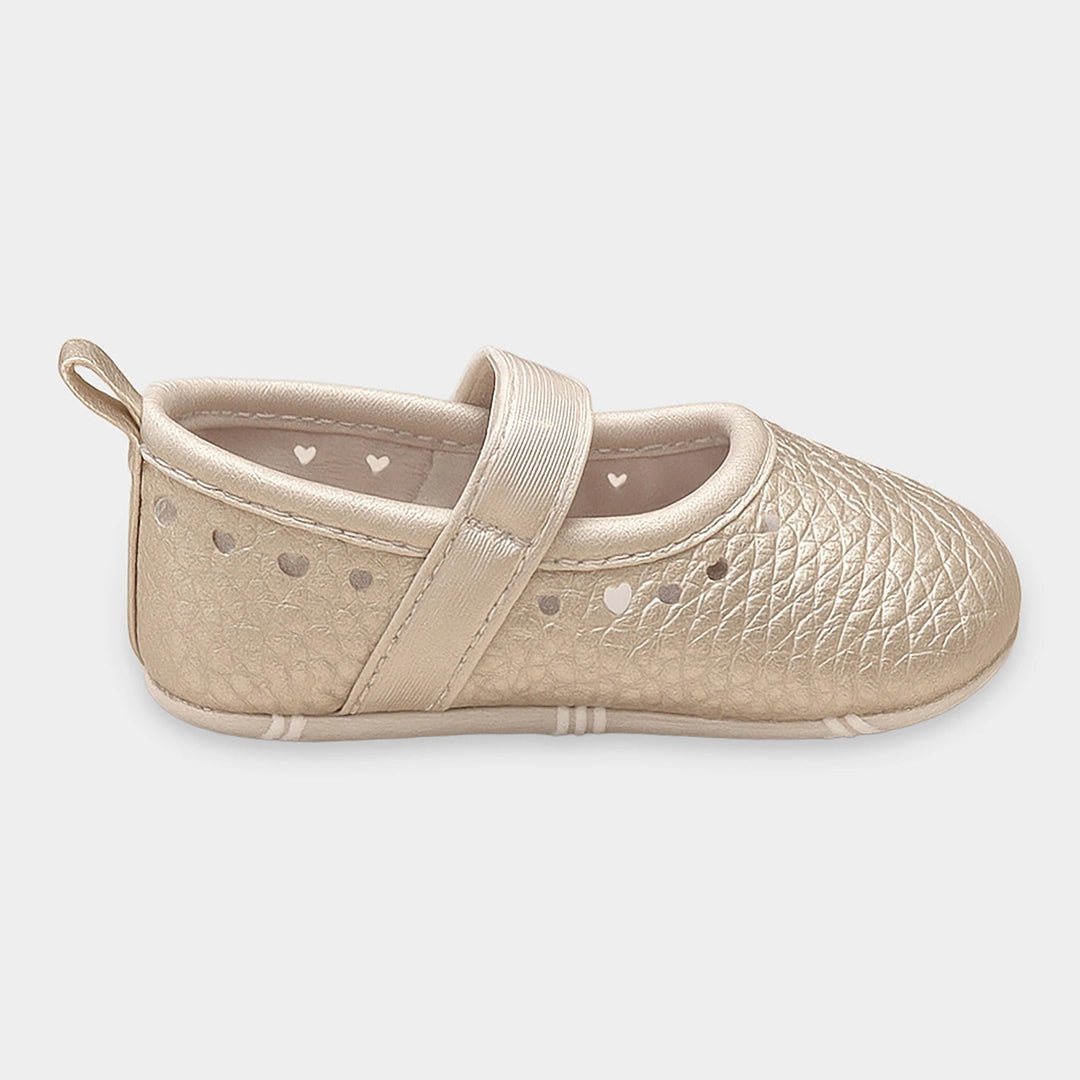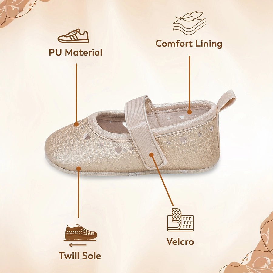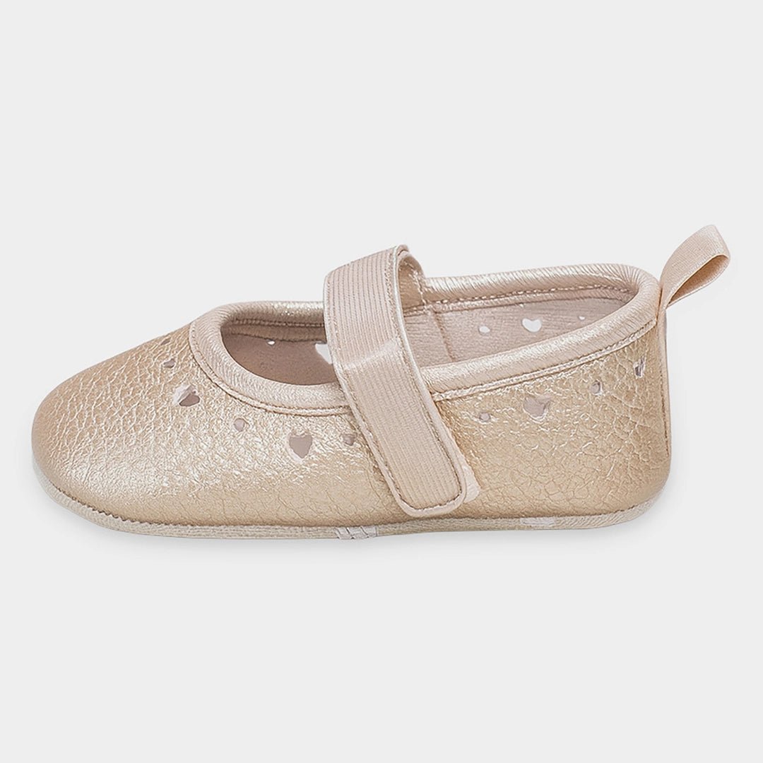 Booties for girls in durable PU material outer and outsole in twill fabric with puff prints. Features a velcro-fasten strap on top, a memory foam insole, a loop at the back for easy put-on and removal, and a solid shiny top. Available in different sizes for kids 0-12M.
