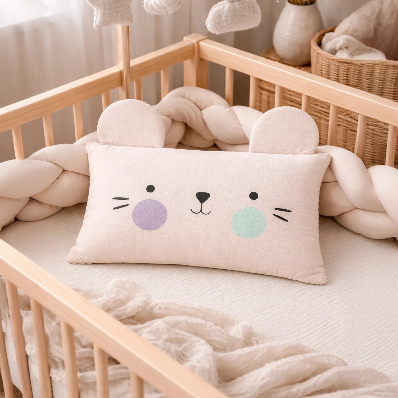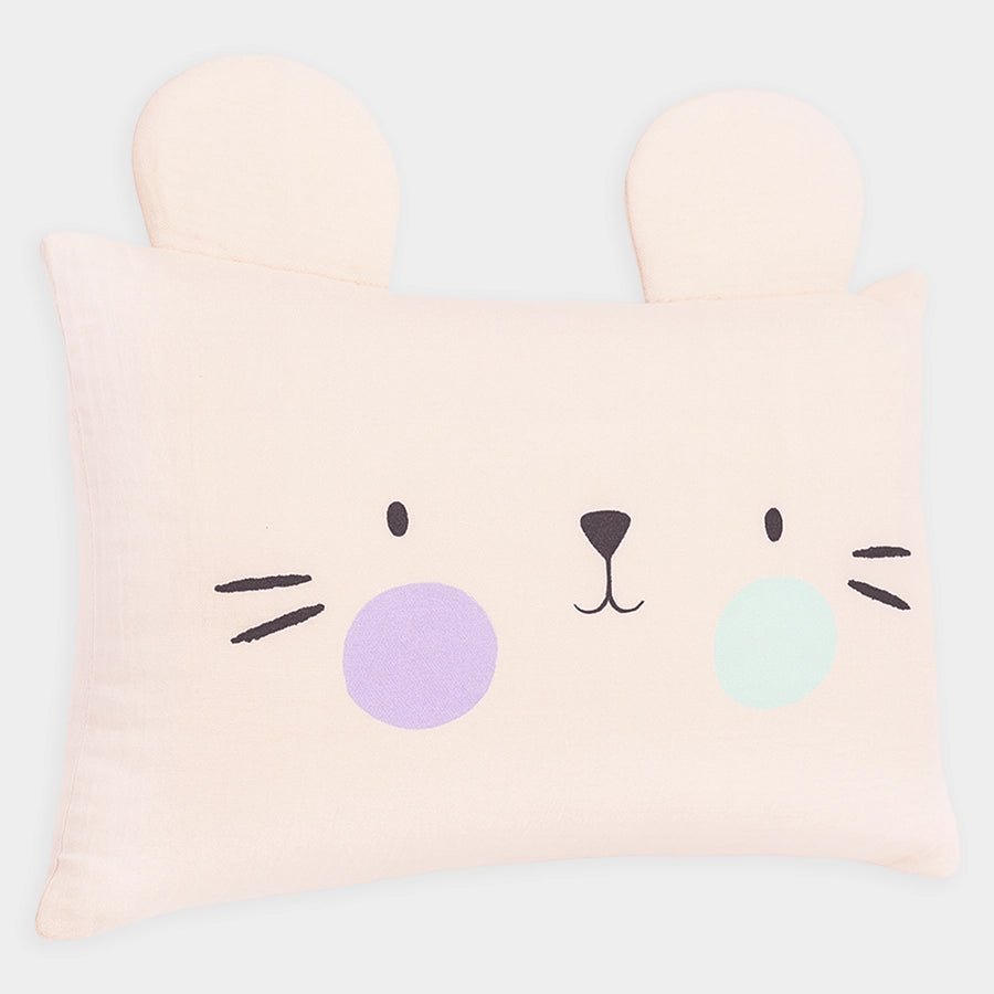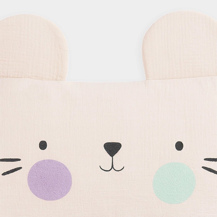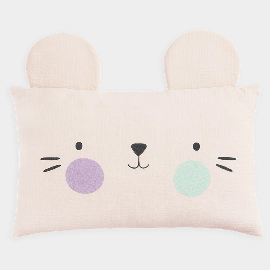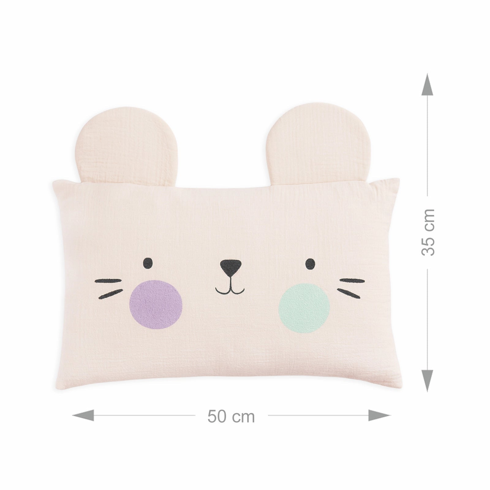 Pillow in soft 100% cotton and 100% polyester filling. Removable cover with prints on one side and button closure at the back. Best suitable for kids 2-6Y. Size: 35x50 cm