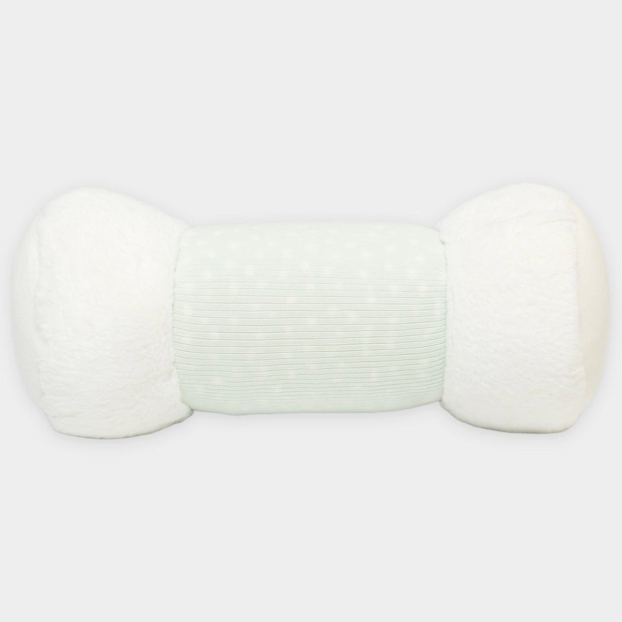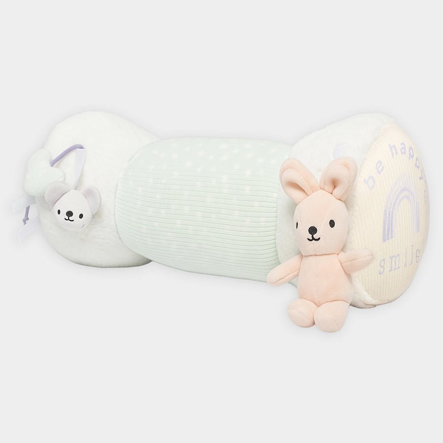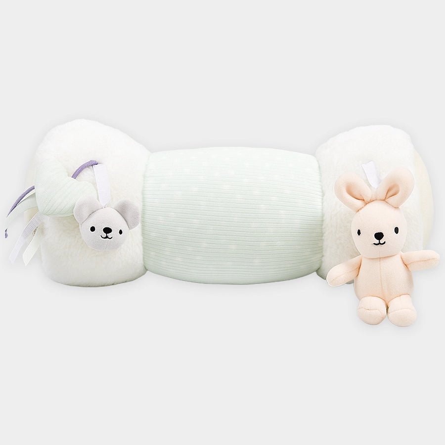 Roll over toy in soft 80% cotton and 20% polyester blend (outer) and 100% polyester filling. Features a cylindrical shape designed to encourage babies to reach out, crawl, and roll over, soft rabbit fur, and ribbed fabric outer with printed and plastic mirror themed designs, attached 3D (bunny, bear, heart themed) toys with bell and crinkle sound to attract the baby’s attention during tummy time or early movement play. Best suitable for kids 0M+. Size: 40x18 cm